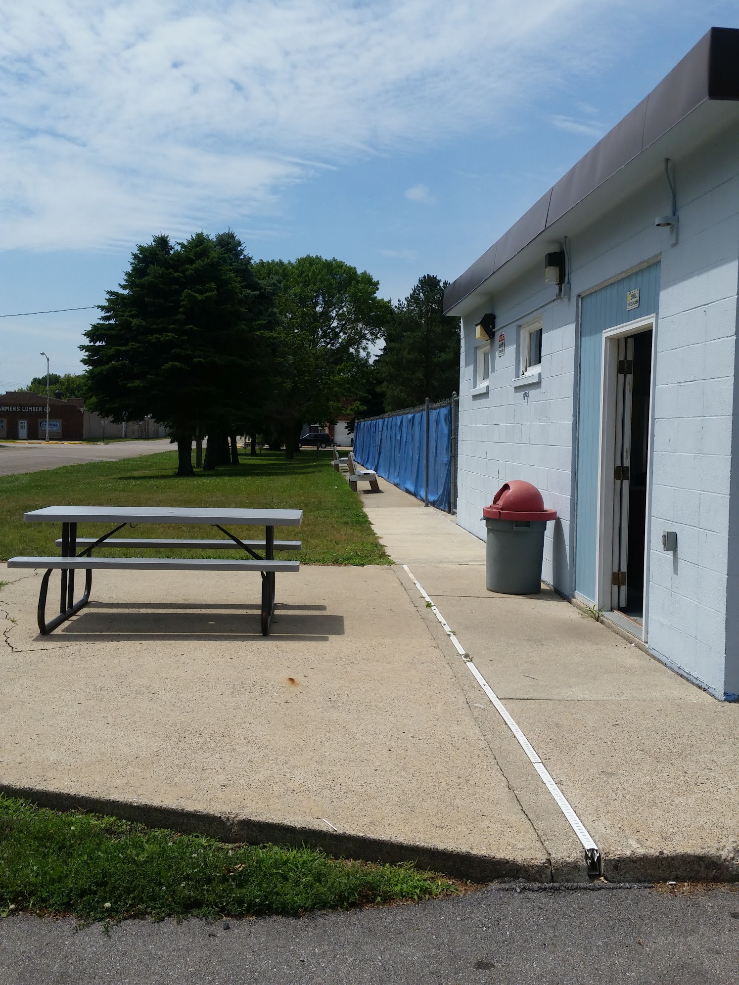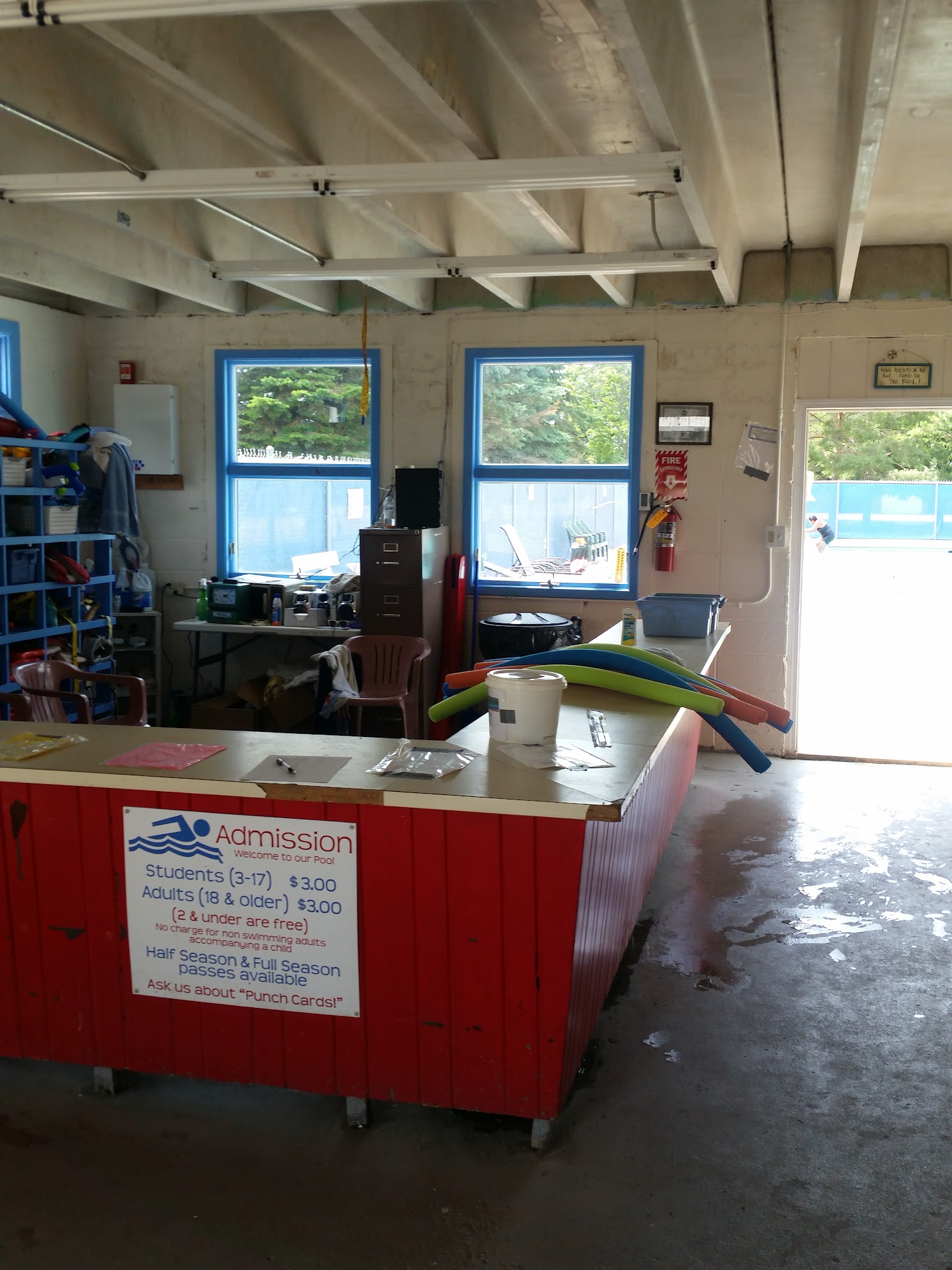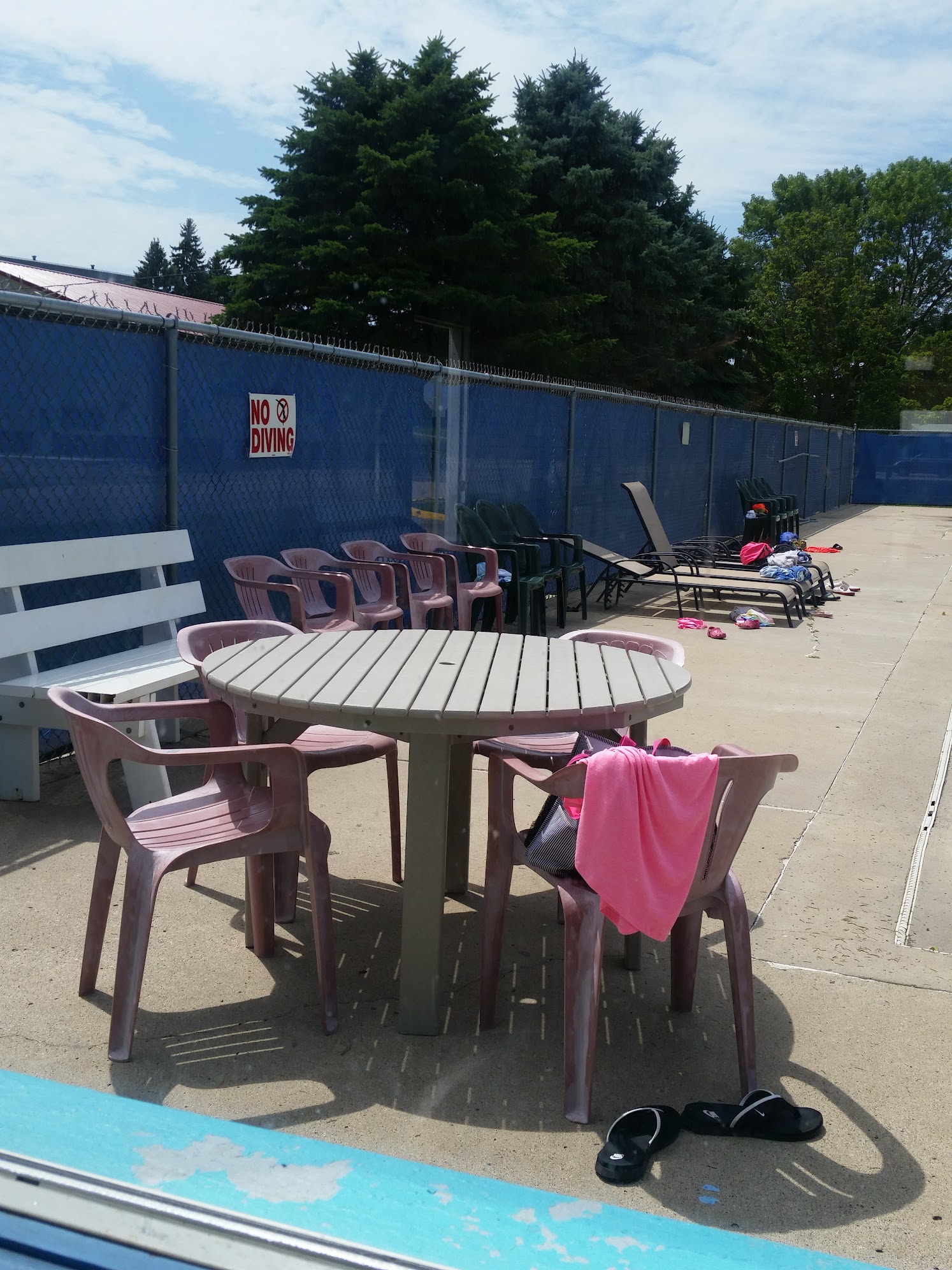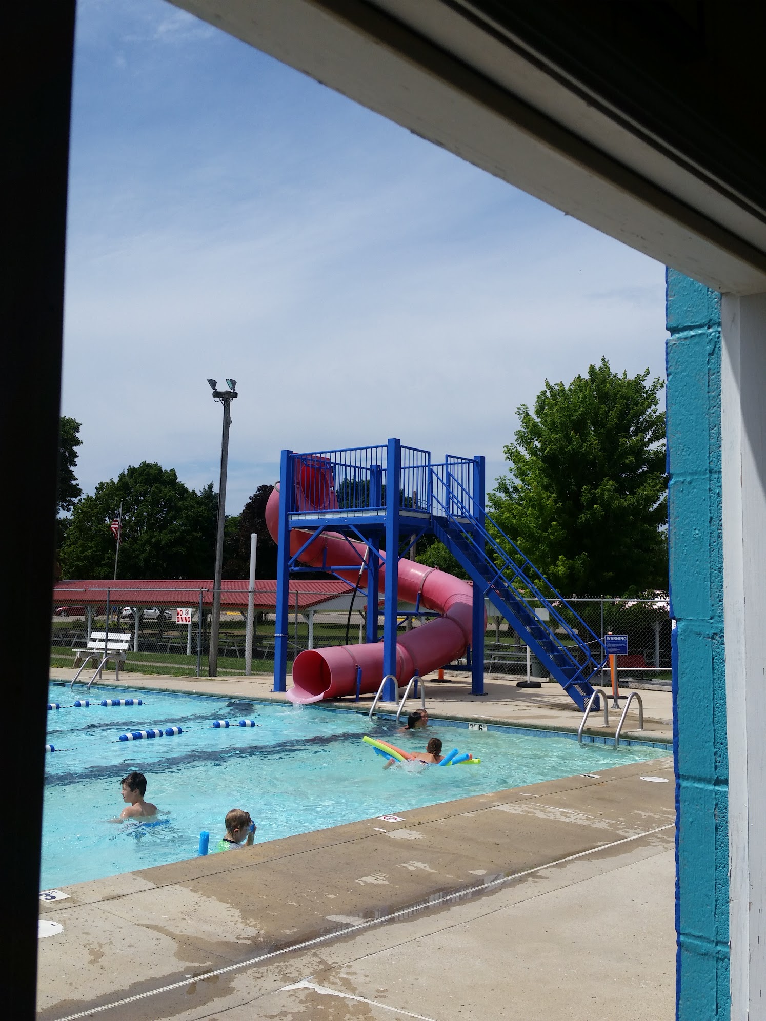 Its a small pool with a diving board and a slide but that's what I like about it. Its a quiet town and a quiet pool. They have snacks available for purchase. They do a 15 minute break every hour to spray the ladders. Its $3 per person. Cant beat that!