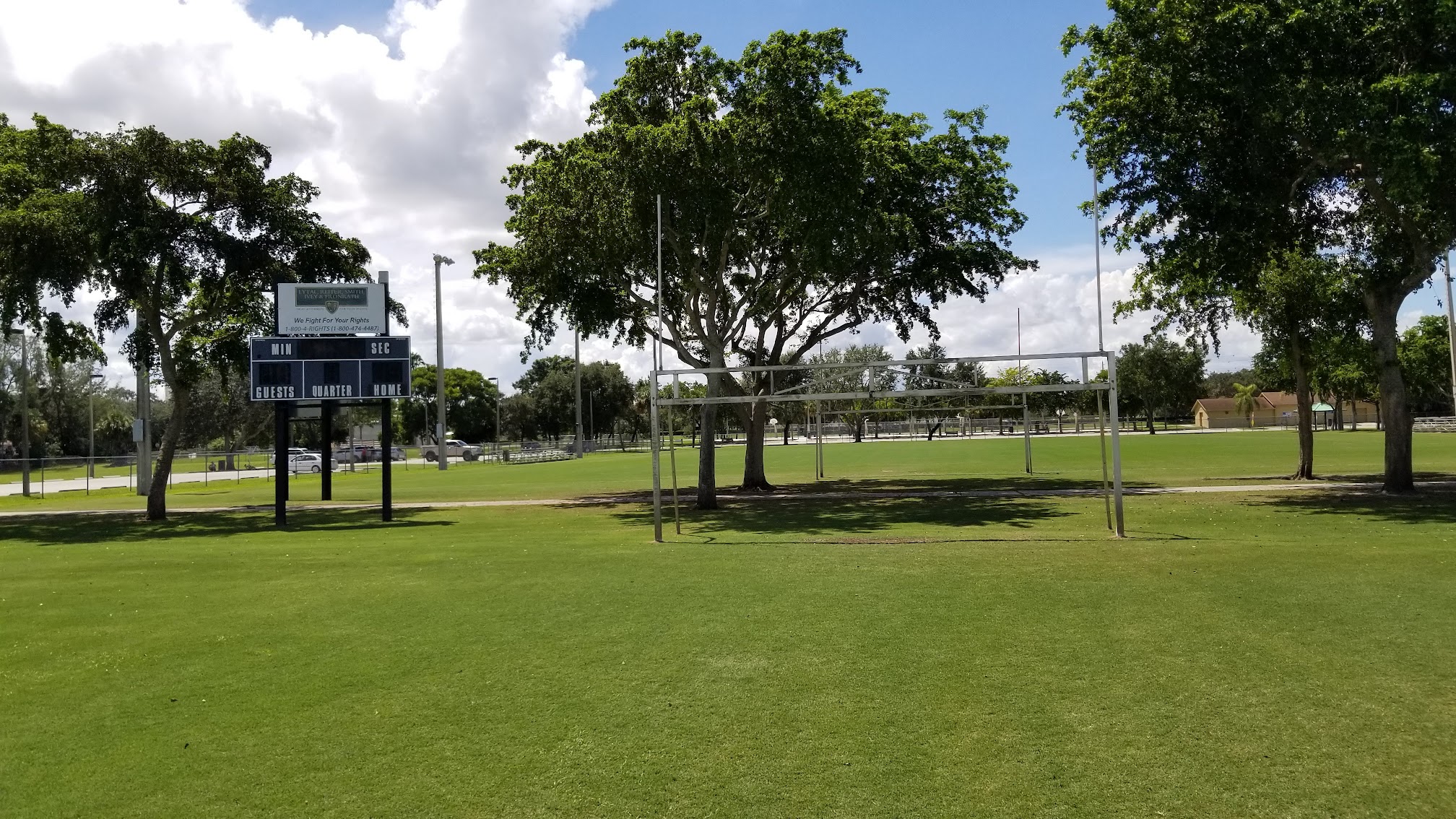 Stopped by here since my flight was delayed. It’s only 8 min from the airport. Walked around a bit. Small playground, not much seating. The fields were locked. Some people playing basketball. There seems to be a community pool that has restrooms we used. The pool is huge and has plenty of lanes for swimming. There were parked police cars.