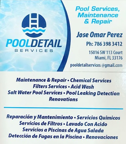 Pool Detail Services is a company located at 15016 SW 113th Ct, Miami, FL 33176, USA, specializing in comprehensive pool cleaning, maintenance, and repair services for both residential and commercial clients in the Miami area. They focus on ensuring pools are well-maintained and in optimal condition.