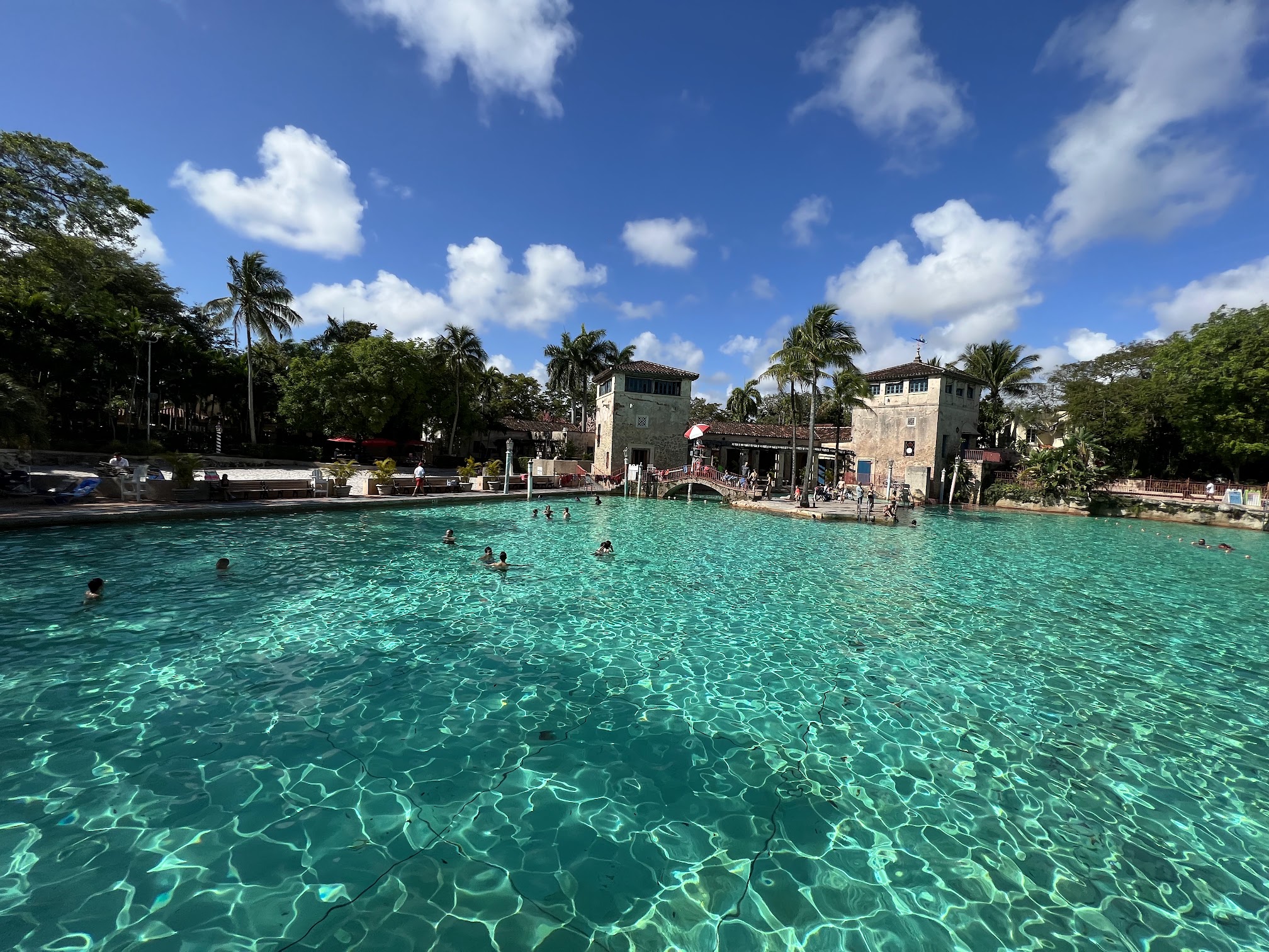 The Venetian Pool is fed daily by millions of gallons of fresh spring water from an underground aquifer. As it is not heated, the water temperature is naturally cool and refreshing, typically ranging from approximately 72-78°F (22-26°C), depending on the season and ambient conditions.
