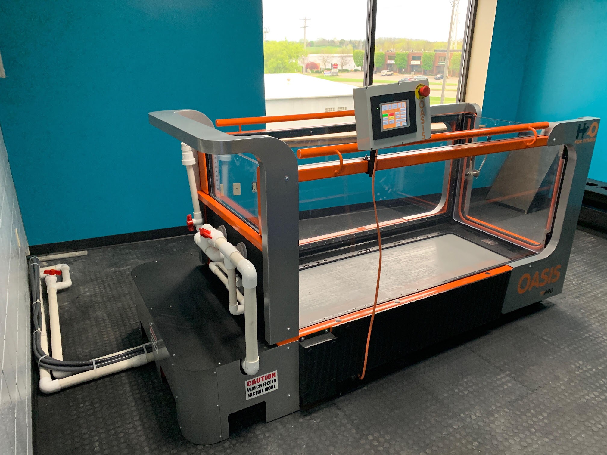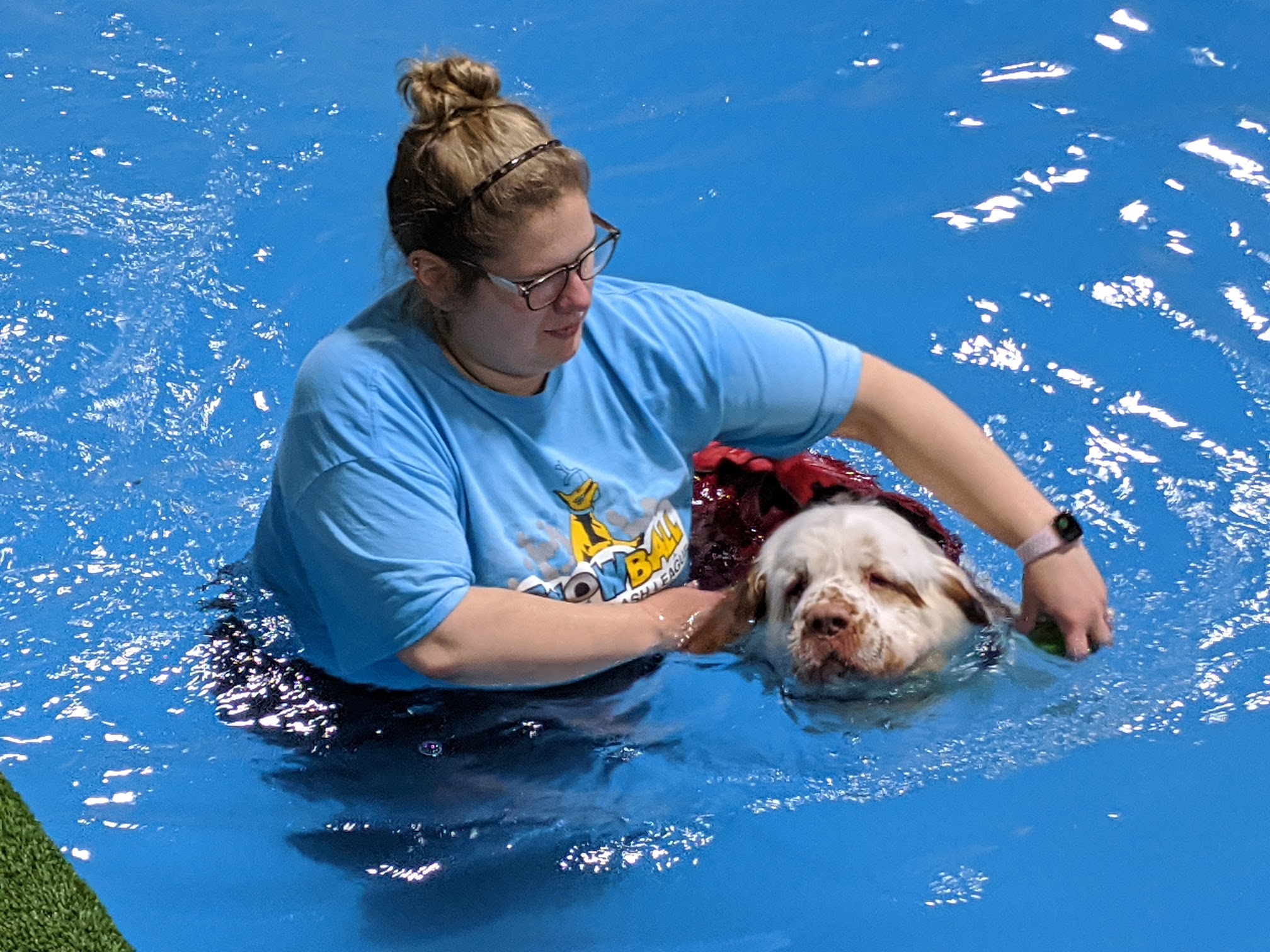 Indoor dog pool for lessons and exercise, plus a water treadmill and agility turf.