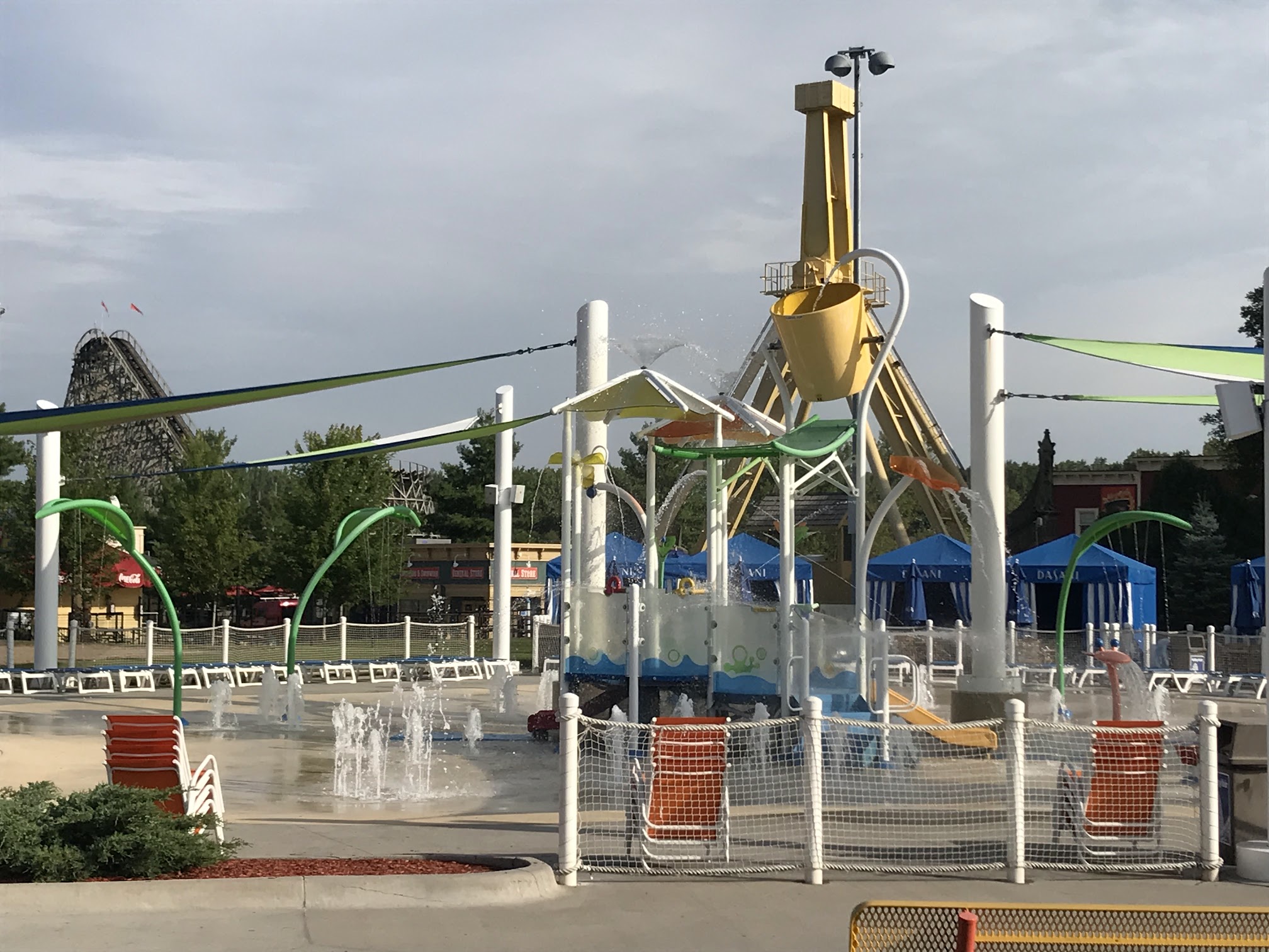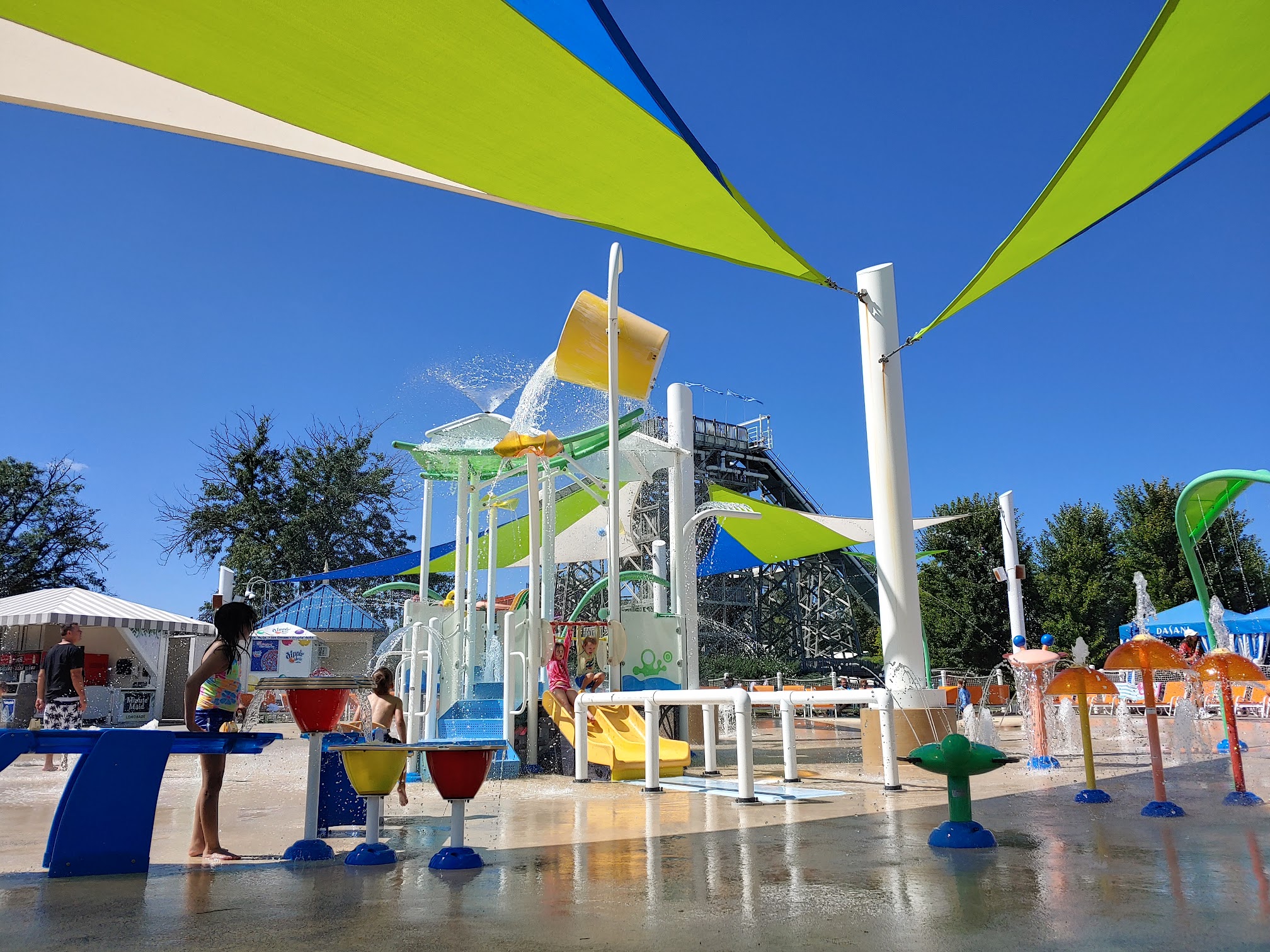 Barefoot Beach is an aquatic playground located within the Valleyfair amusement park in Shakopee, MN. It features a large zero-entry pool, interactive water elements like spray guns, geysers, and dumping buckets, along with small slides, catering primarily to families and younger children. The area also includes a sandy beach for play.