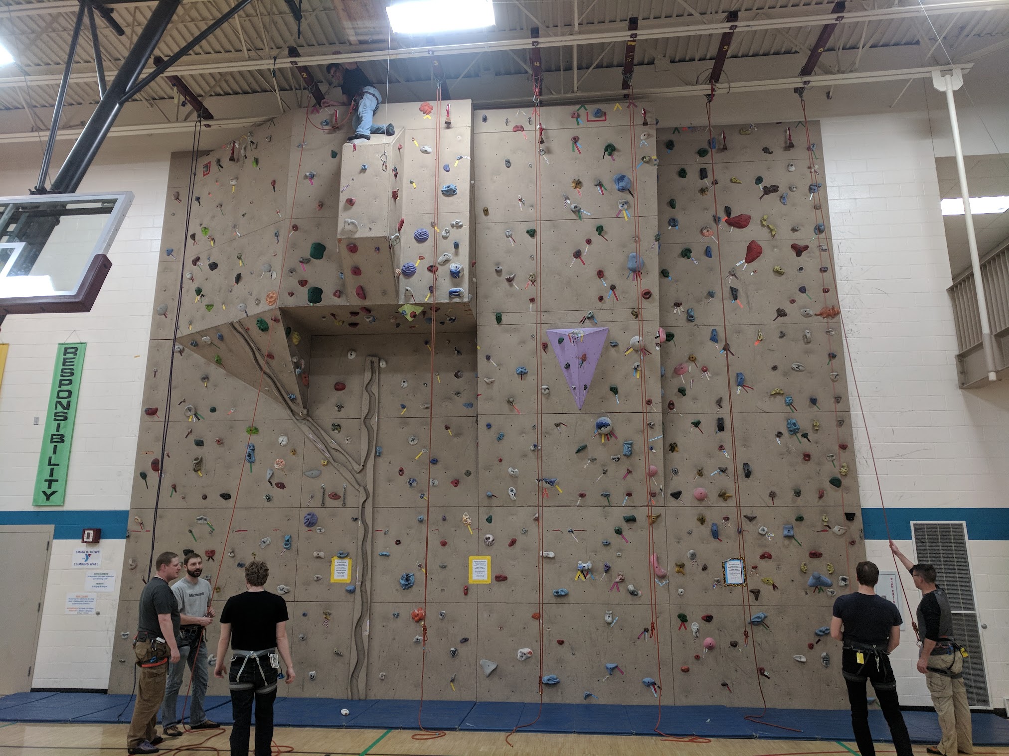 Indoor and outdoor pool facility with a rock-climbing wall and cardio equipment.