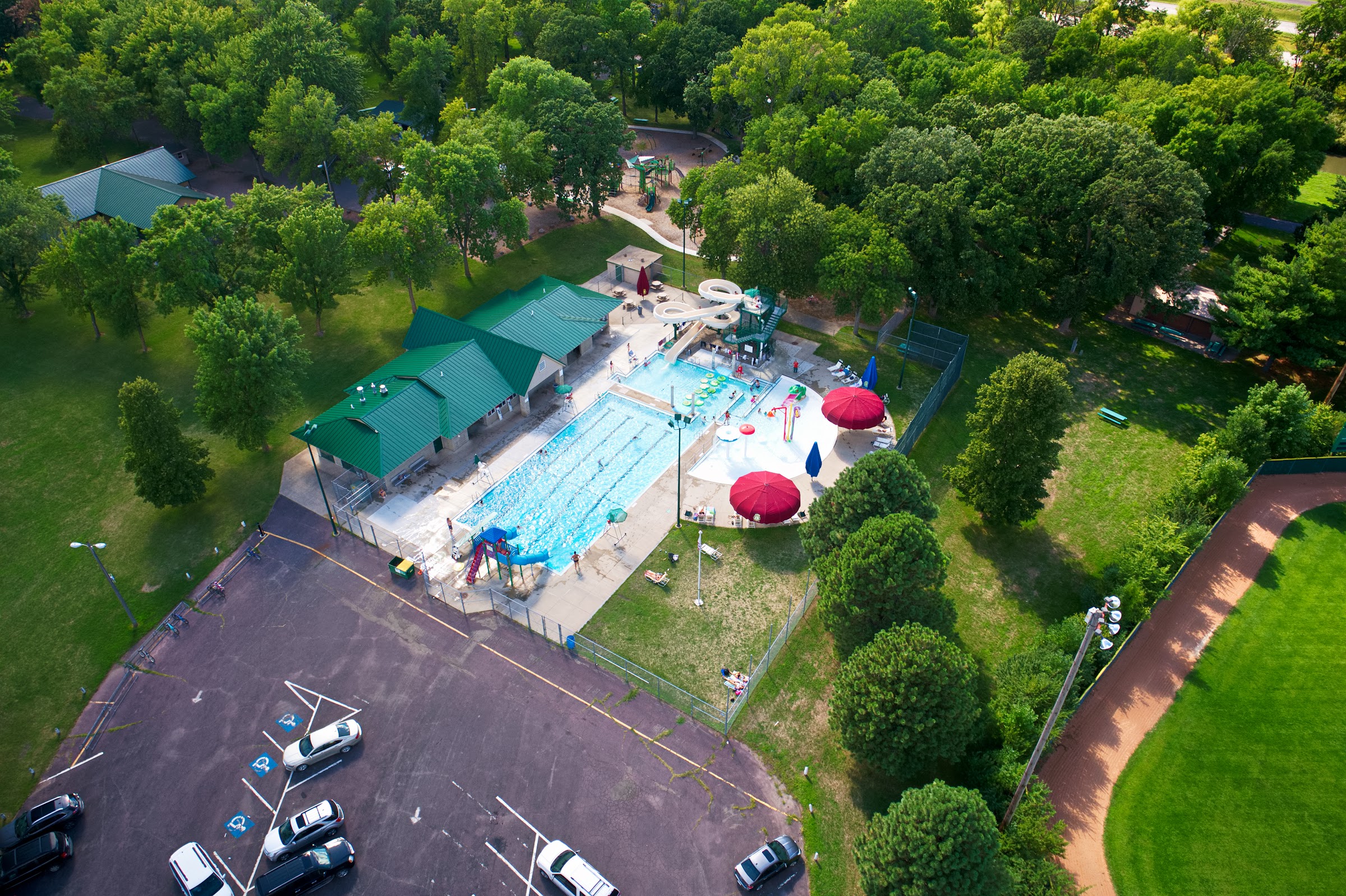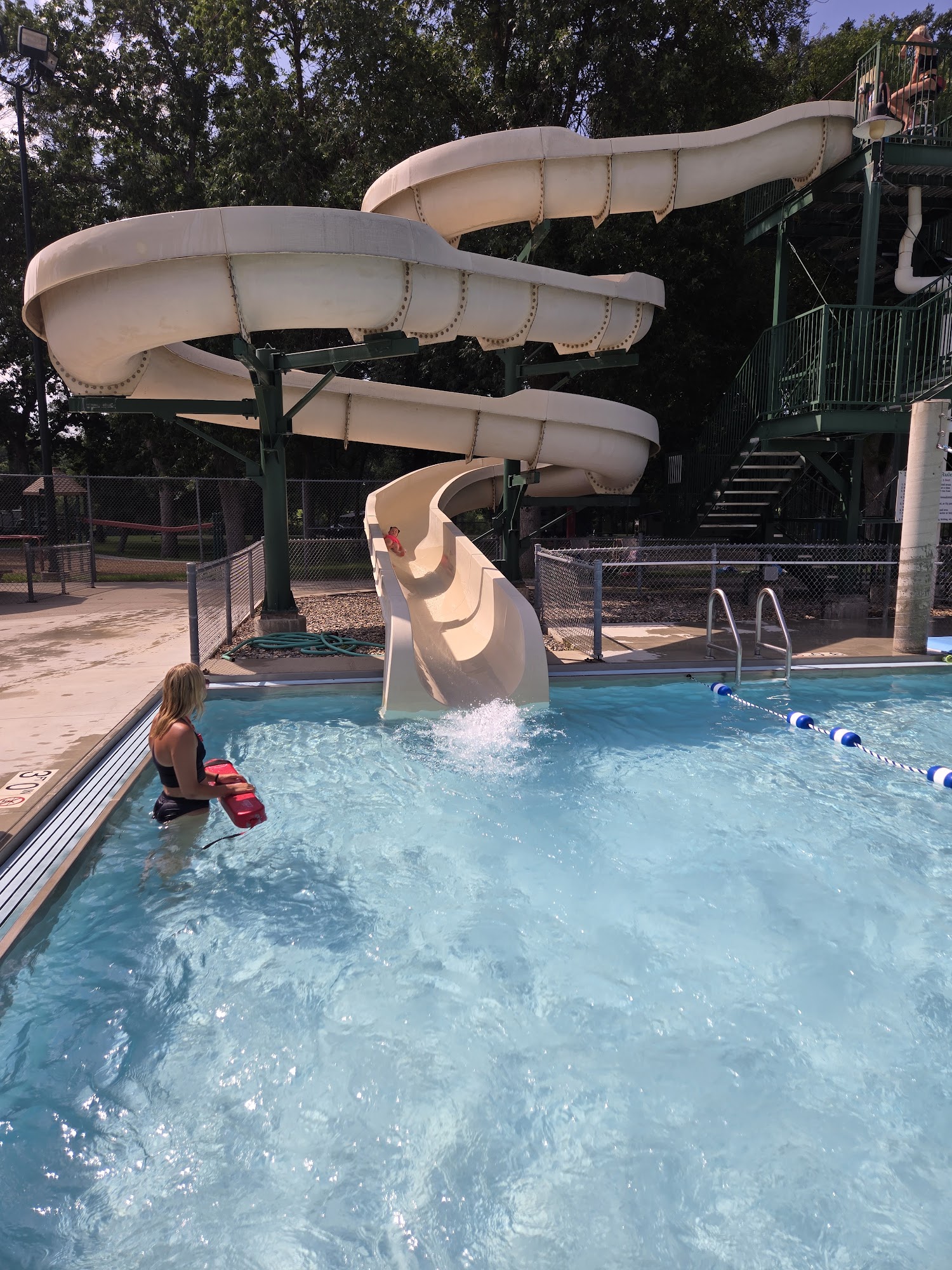 Local water park offering slides, a diving board, and a playground, plus hot dogs and pizza at the concession stand.