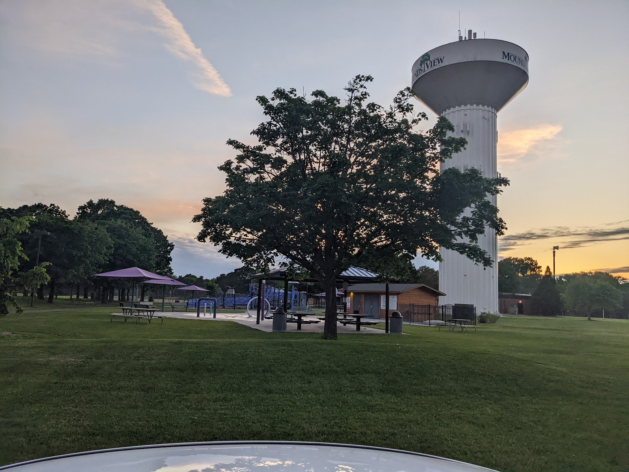 This is a beautiful park with a decently large playground, a few picnic tables, some trees for shade, a water splash pad, and space to play yard games. It's well-maintained and fairly quiet, except when large gatherings are there. There's restrooms on site.