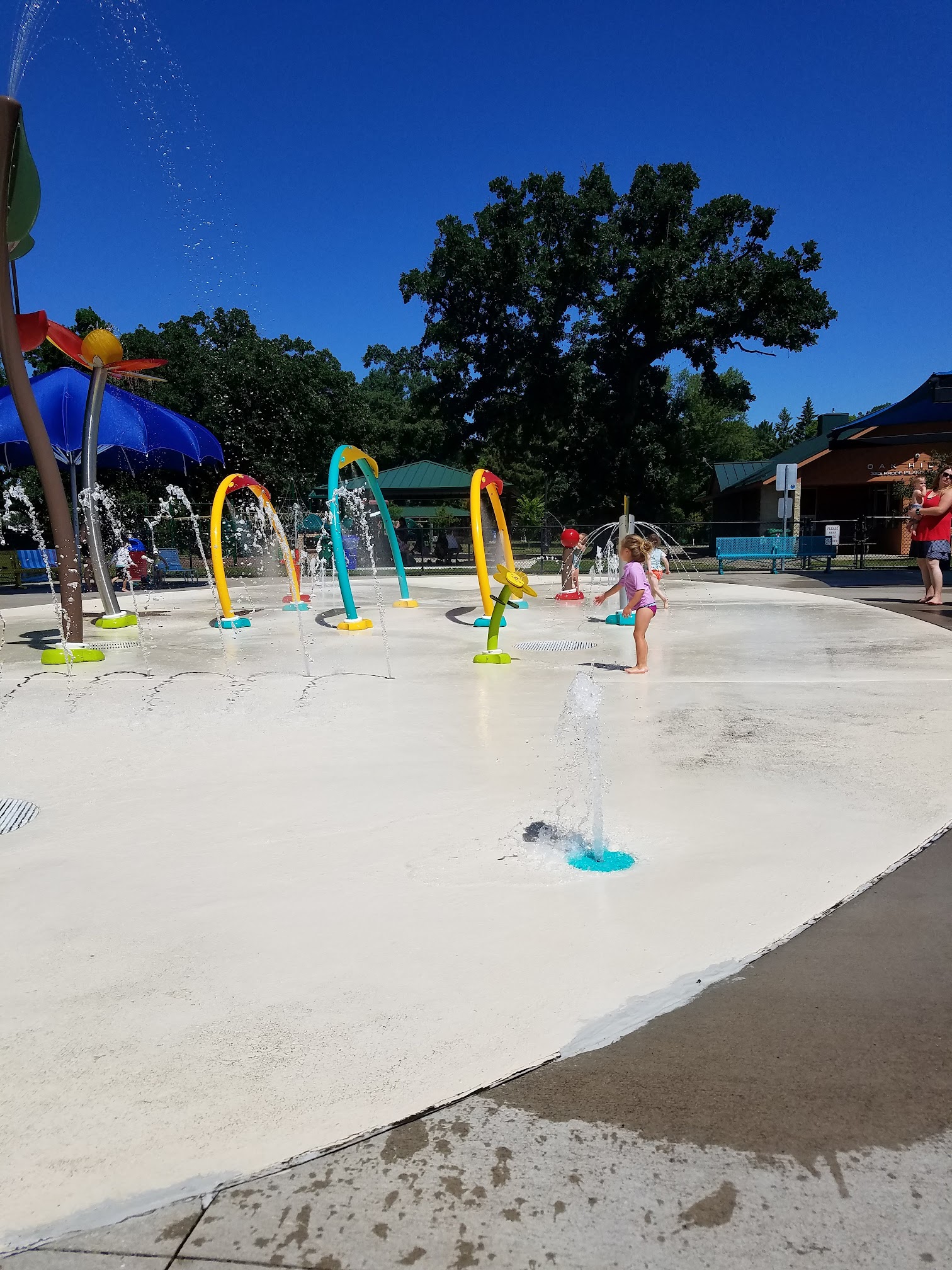 What are people saying (AI review summary)? Oak Hill Park is a highly recommended, large, and clean park offering a wide range of amenities for all ages. The splash pad is a popular feature, especially for young children (5 and under), noted for being bigger than most and having plenty of shaded seating. While older children might find the splash pad less engaging, the park compensates with three playgrounds for ages 2-12, long trails, picnic areas with grills, multiple sports fields, and clean restrooms. Visitors appreciate the abundant shade throughout the park, ample parking (including handicap spots), and additional free activities provided by a Three Rivers Park van. The splash pad entry is free for residents with ID and $1 cash for non-residents, making it an excellent and versatile destination, particularly during summer.