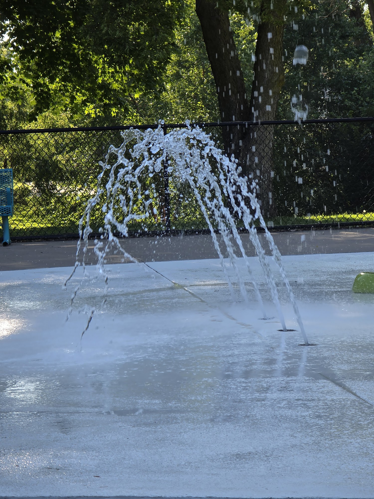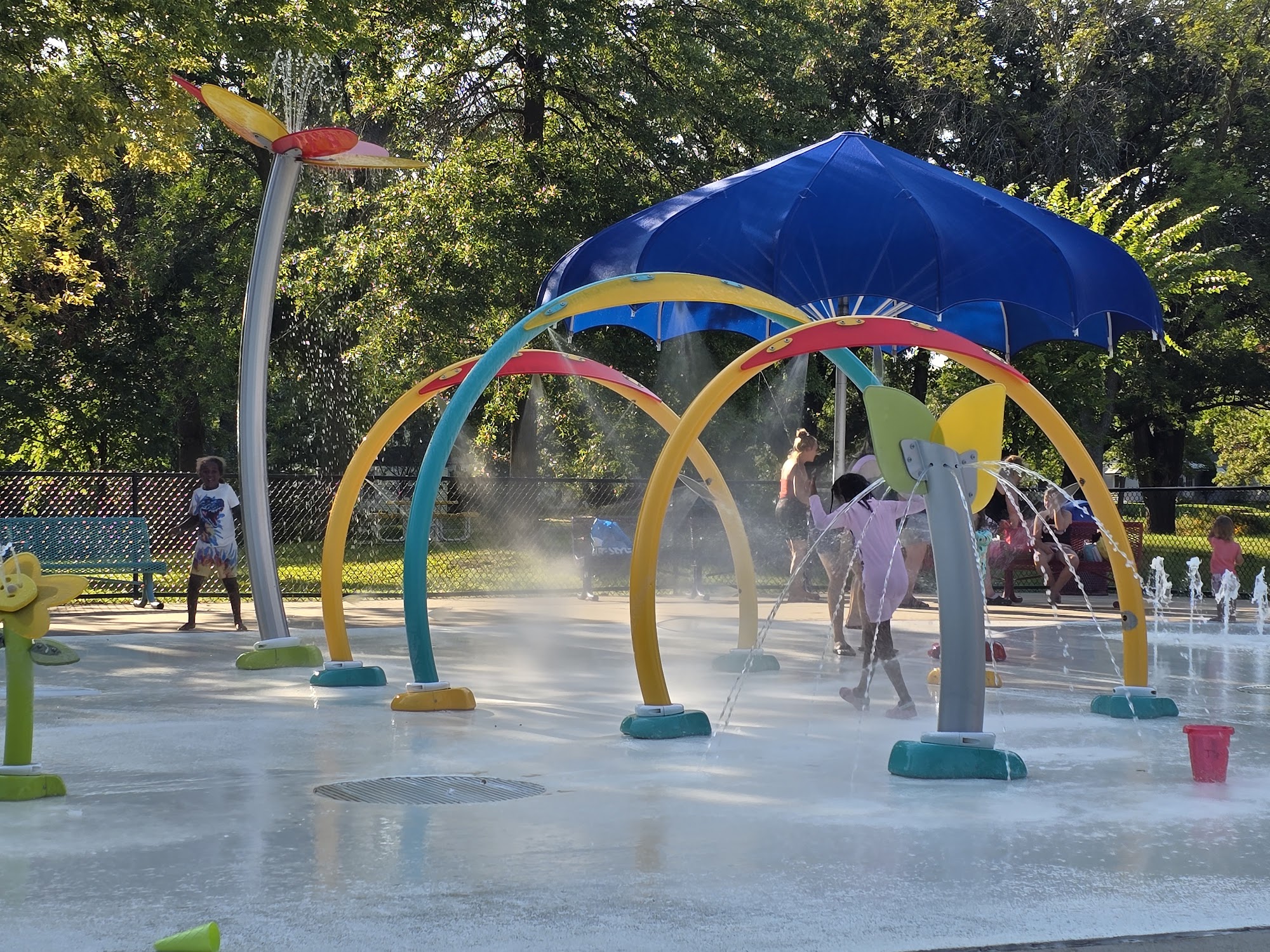 Splash pad is great for little ones. I would say maybe 5yo and younger. My 10yo got bored very quick but overall a cute and clean splash pad! For residents with ID it’s free, non residents it is $1 cash entry. There are some covered/shaded seating options and some non covered.
