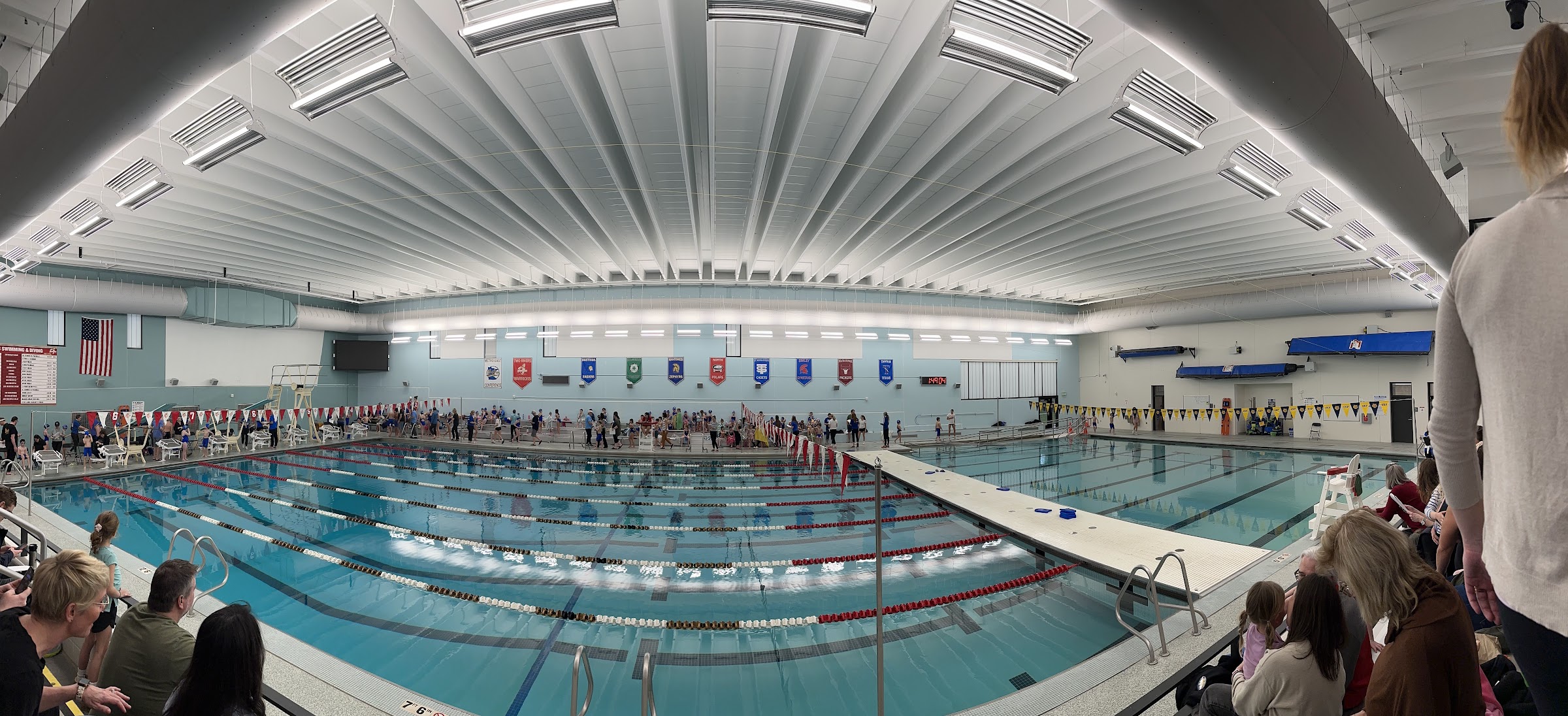 Nice facility, timing system worked well and the airflow was nice which kept the temp tolerable in the stands. The audio system (announcer on microphone) was terribly hard to understand...think peanuts cartoon...probably a relatively easy fix using the output settings of the system. There are no lights on the sidewalk from the upper level to the overflow parking and it was dark and hard to see at 8:30pm. Next day update, the audio system sounded great today for the diving competition!