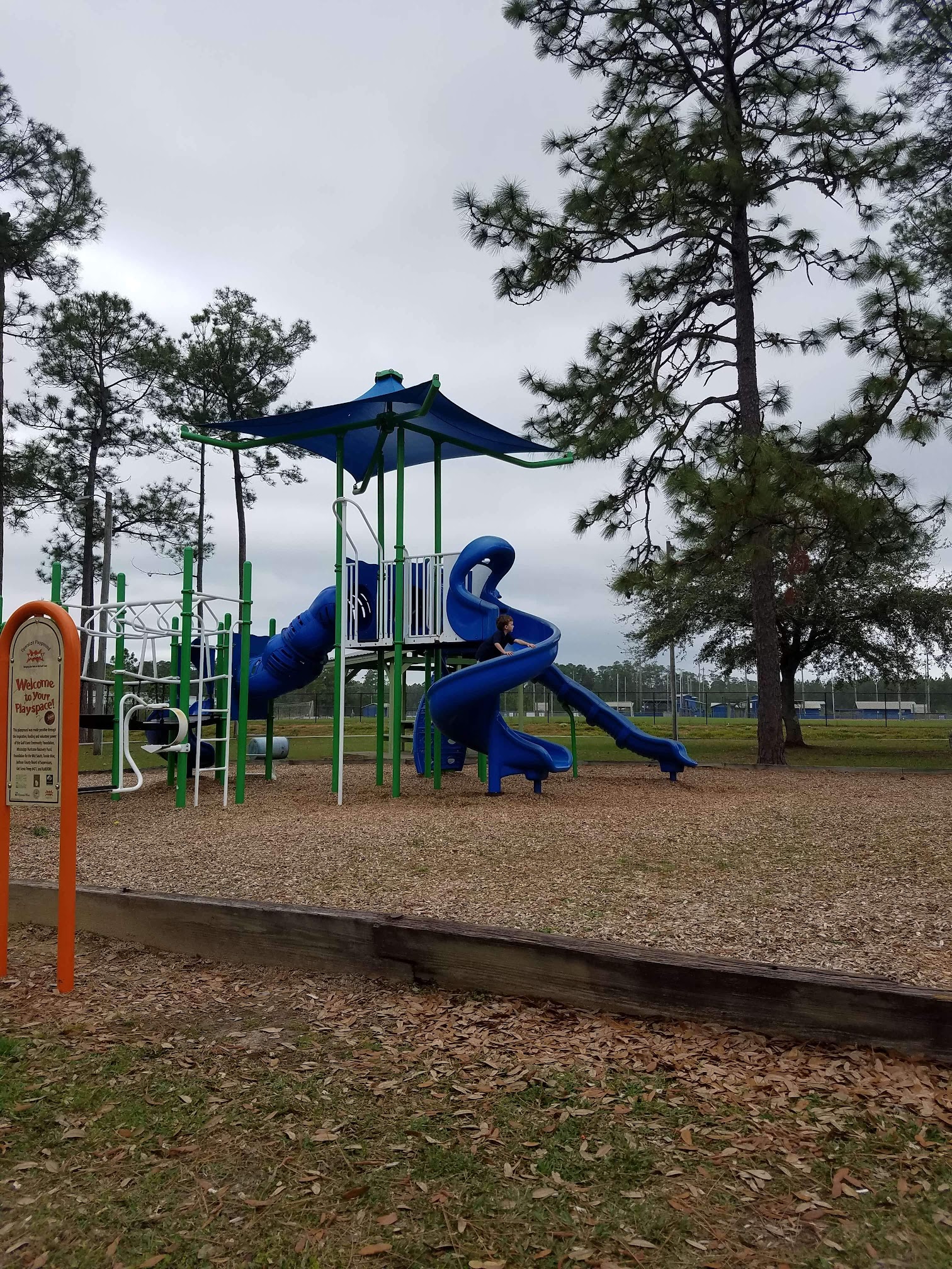 Has bathrooms, walking trail, covered picnic tables, park equipment, but no fountains. Will return to play more