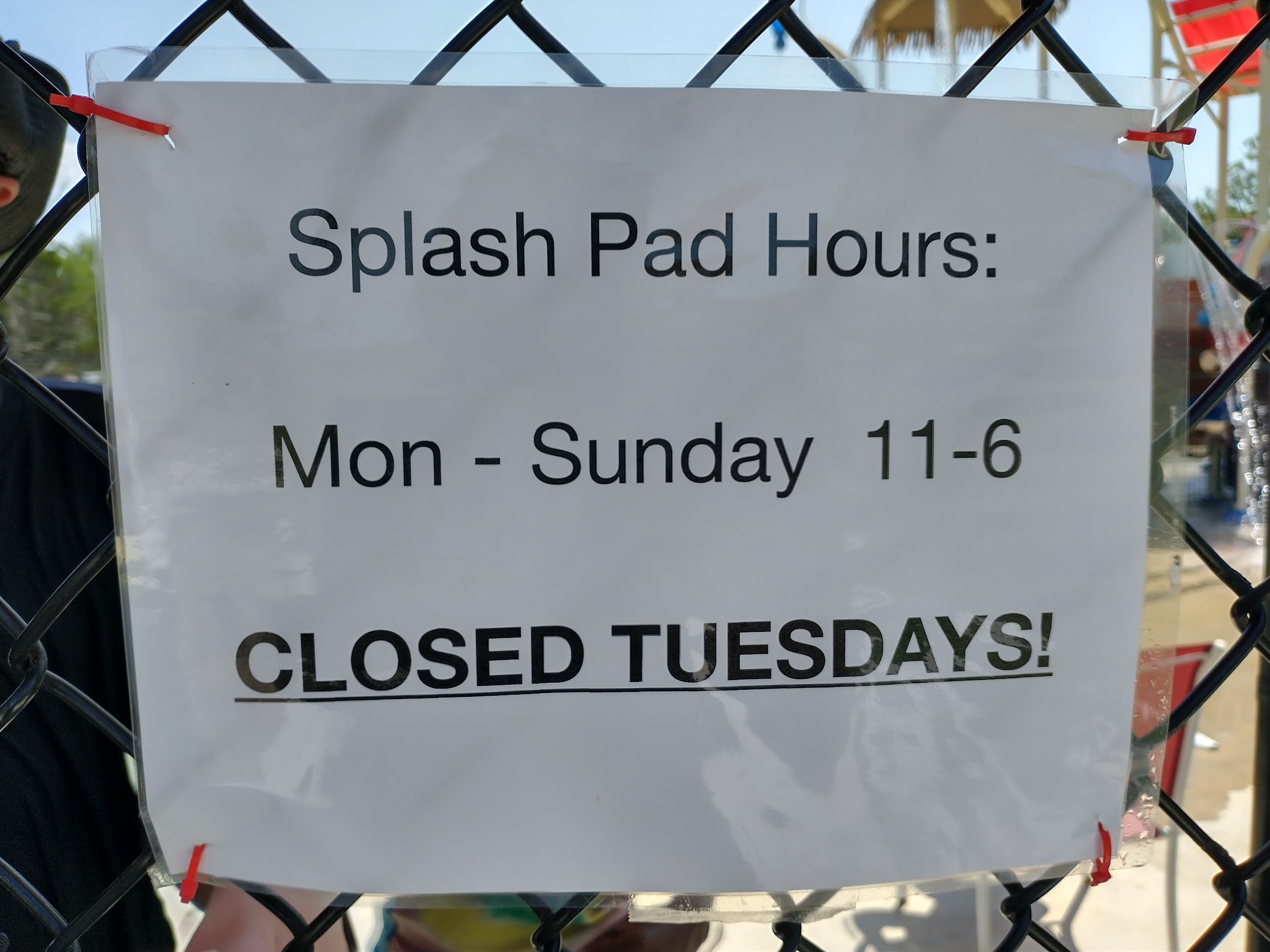 The splash pad itself is great!! 5 stars However, they just implemented a no food/ no drinks rule in the splash pad area!!! That is a bit ridiculous for a kids area!!! Kids eat and drink all afternoon. Now you have to go outside the fence to eat or drink. To boot, they even sell concessions at the splash pad, and even those can’t be consumed inside the splash pad area.