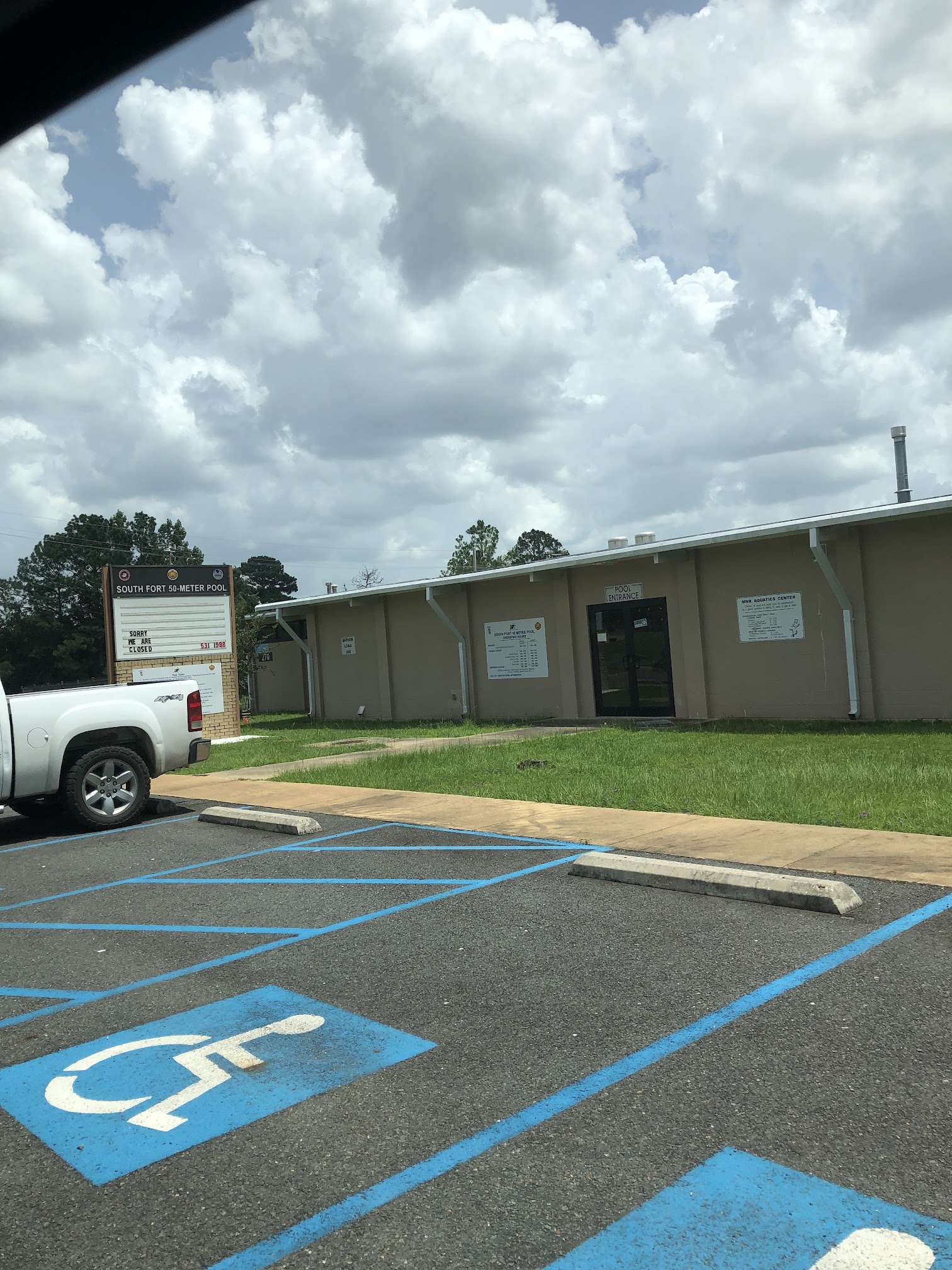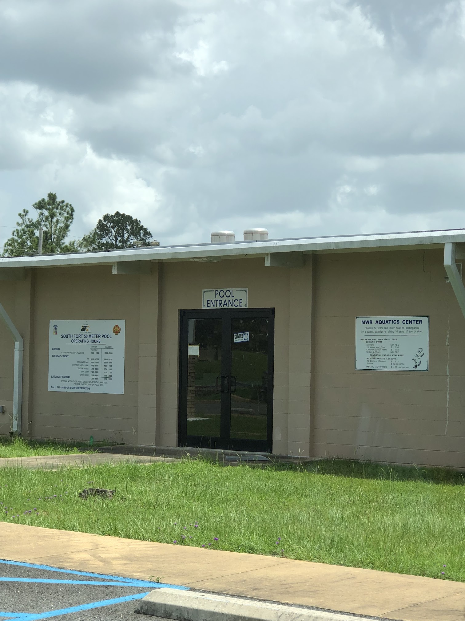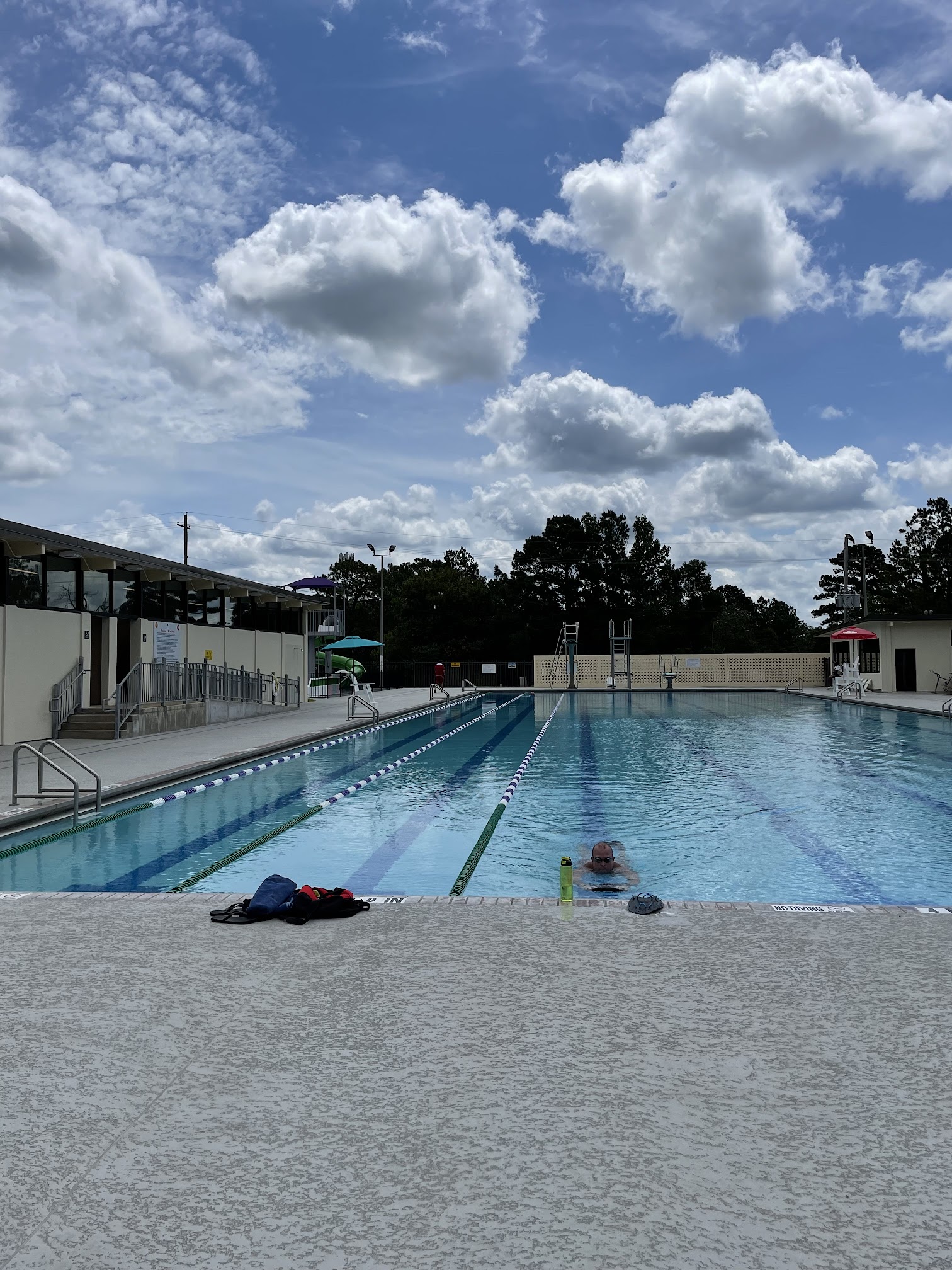 What are people saying (AI review summary)? The recently reopened pool facility is highly praised for its amazing renovations, which include a new waterslide, a covered kiddy pool, an easy-access ramp, and multiple jumping platforms. Reviewers consistently highlight the facility's cleanliness, well-maintained lanes suitable for lap swimming, and friendly, watchful staff, with Zach specifically receiving commendation. While the overall experience is very positive, some feedback noted uncomfortable chaise lounge chairs and a broken pool heater resulting in chilly water. The facility offers various seating options and accepts both cash and card, with free access for AD personnel and a small fee for dependents and guests.