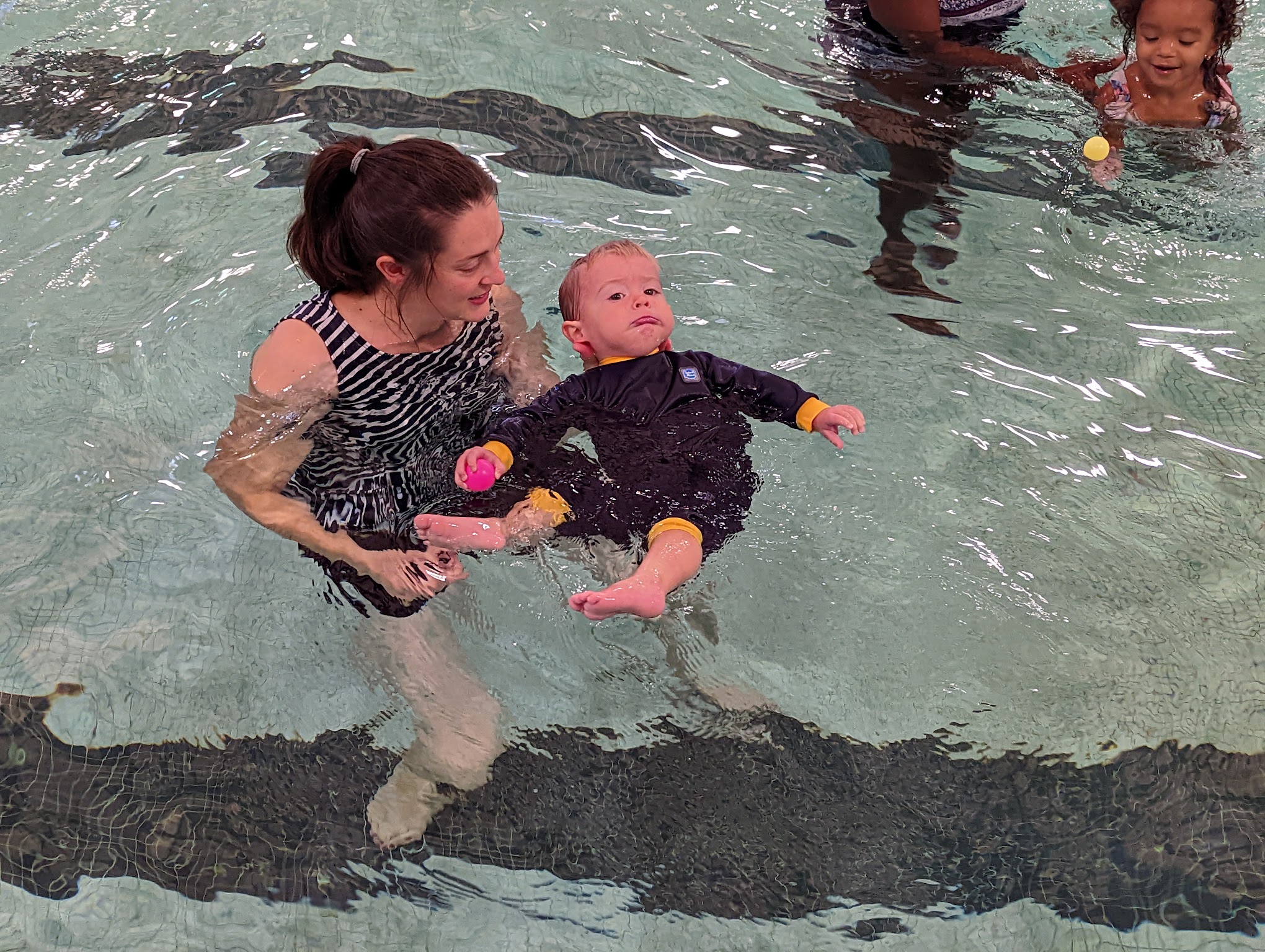 Aquatics is great for kids and adults. There's 2 pools inside. The larger pool is for swimming laps (4ft -12ft deep) and the other pool (approx. 4 ft deep) is for the water slide and you can also play basketball. Some life guards are nice and will give you the tools to play with, others are either miserable or too lazy to get you the ball. Overall quiet staff but definitely a good portion of lifeguards on deck to make you feel safe. There is a baby pool outside but it's currently closed for renovation. Overall I enjoy coming here. It's also around the corner from the outside pool but that's only open to active military. But when the inside pool is closed, they will let people use the outside pool. The larger bathroom is clean and it has the open showers. There's also a private 1 person bathroom right outside the pool entrance.
