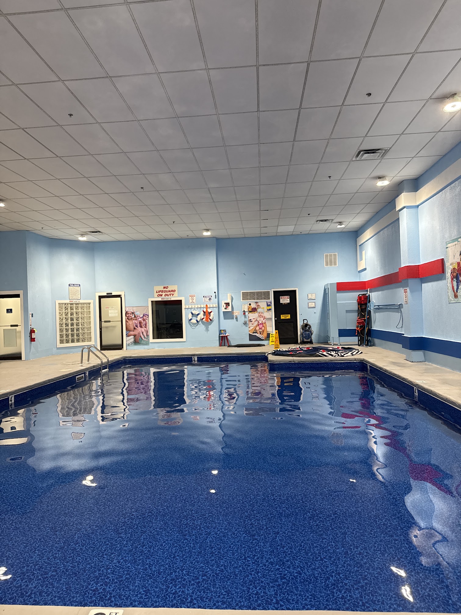 The facility features heated indoor pools, which are typically maintained at a comfortable temperature of around 85-86 degrees Fahrenheit (29-30 degrees Celsius), ideal for learning and comfort across all age groups.