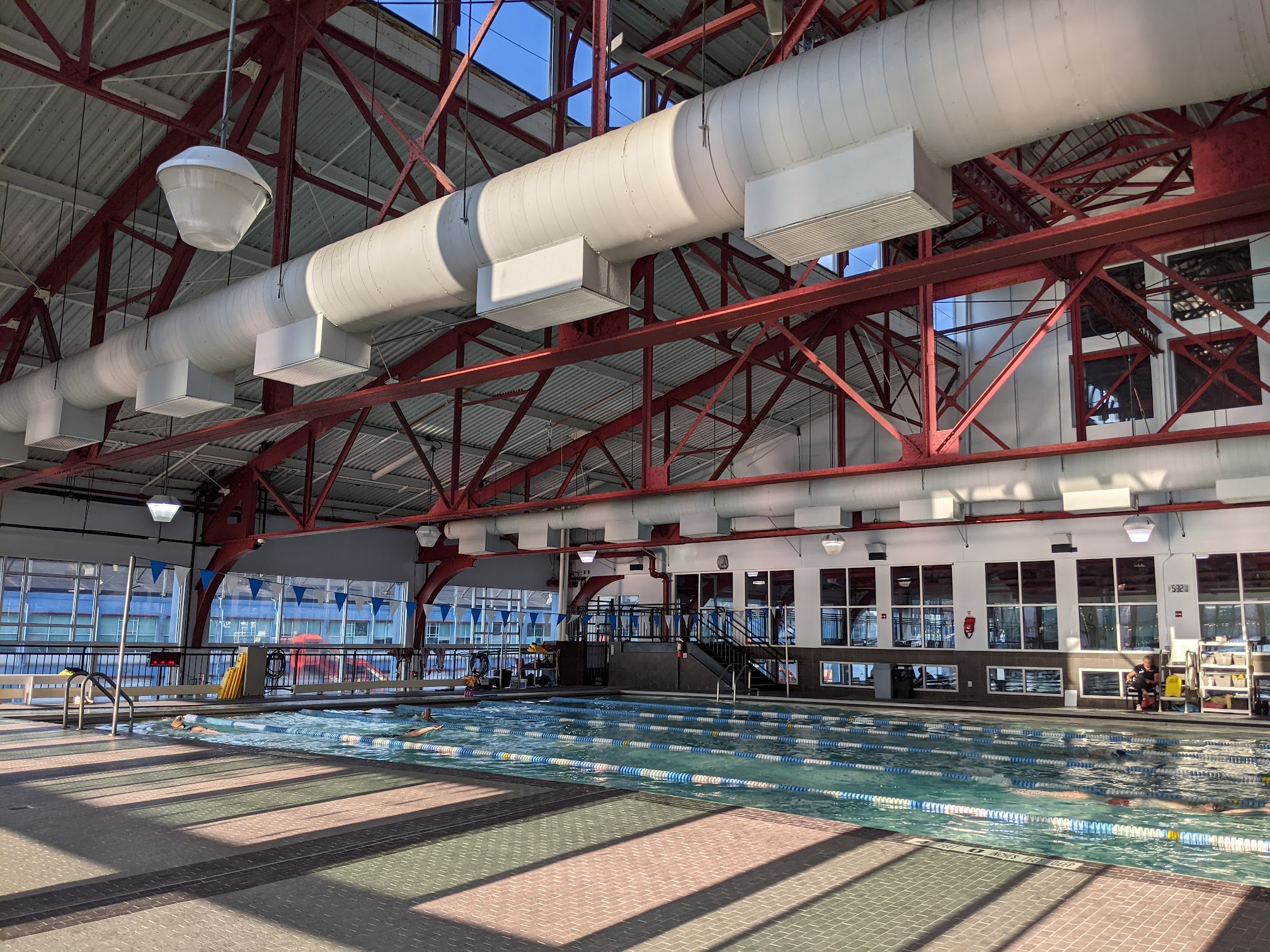 The facility features a 6-lane, 25-yard indoor heated swimming pool. The pool's temperature is consistently maintained at 80 degrees Fahrenheit (26.7 degrees Celsius).
