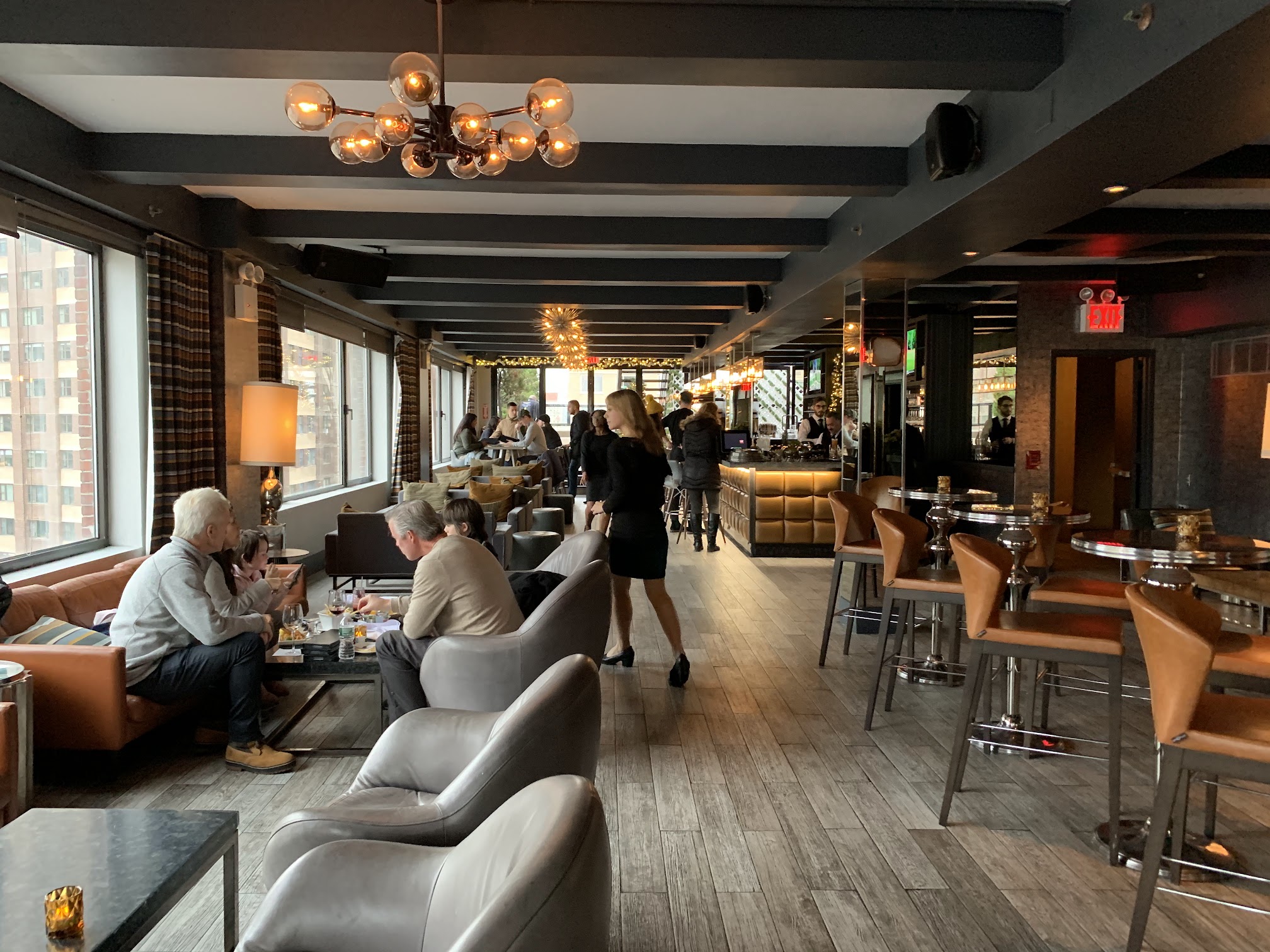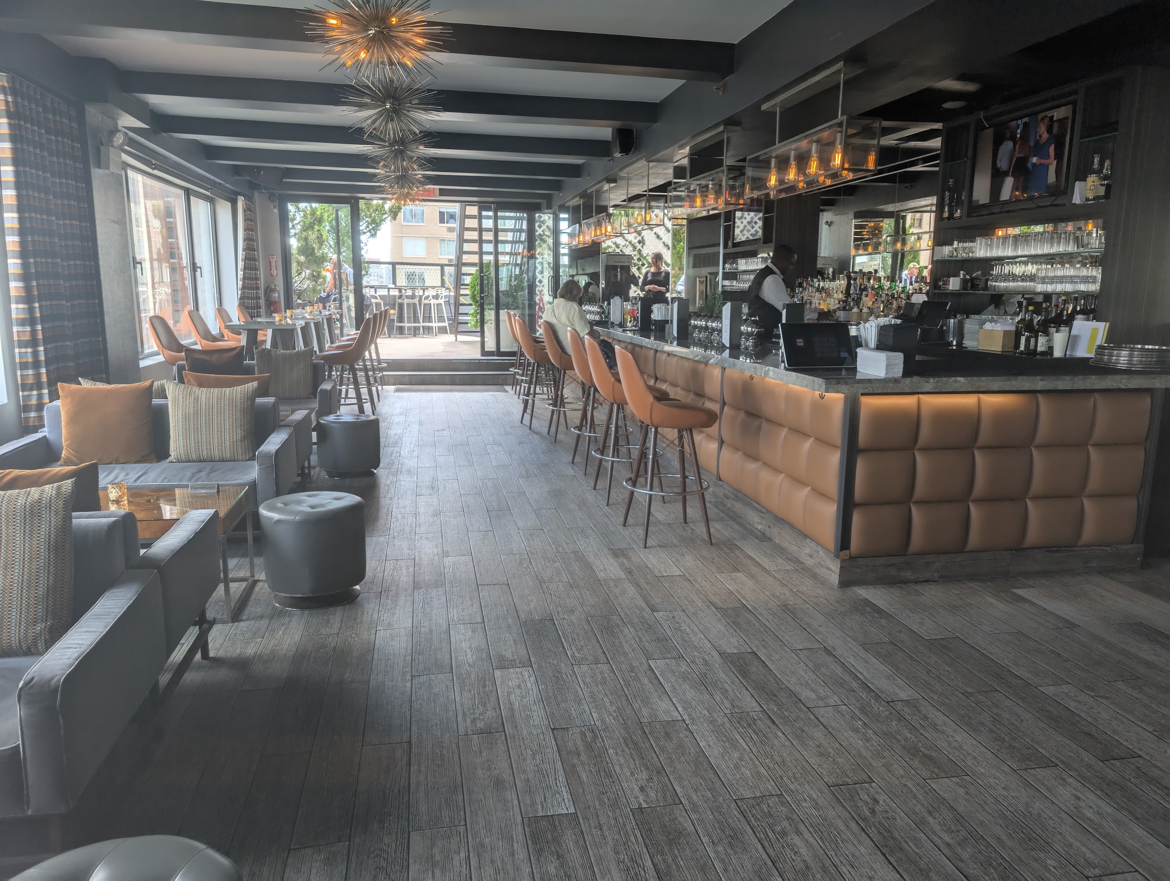 I love this place. I usually come multiple times in the summer but went this weekend in November and it was still great. The seating is plentiful - lots of comfortable couches and loveseats and chairs all over the bar area inside and really comfortable seating options on both rooftop areas. One of the outdoor rooftop areas is open in the winter and heated. Extensive bar menu and more limited food menu. Good views up and down Broadway and of Lincoln Center across the street. And the staff is incredibly helpful and always friendly (special shout-out to Jez (sp?) who was my AWESOME server this weekend!).