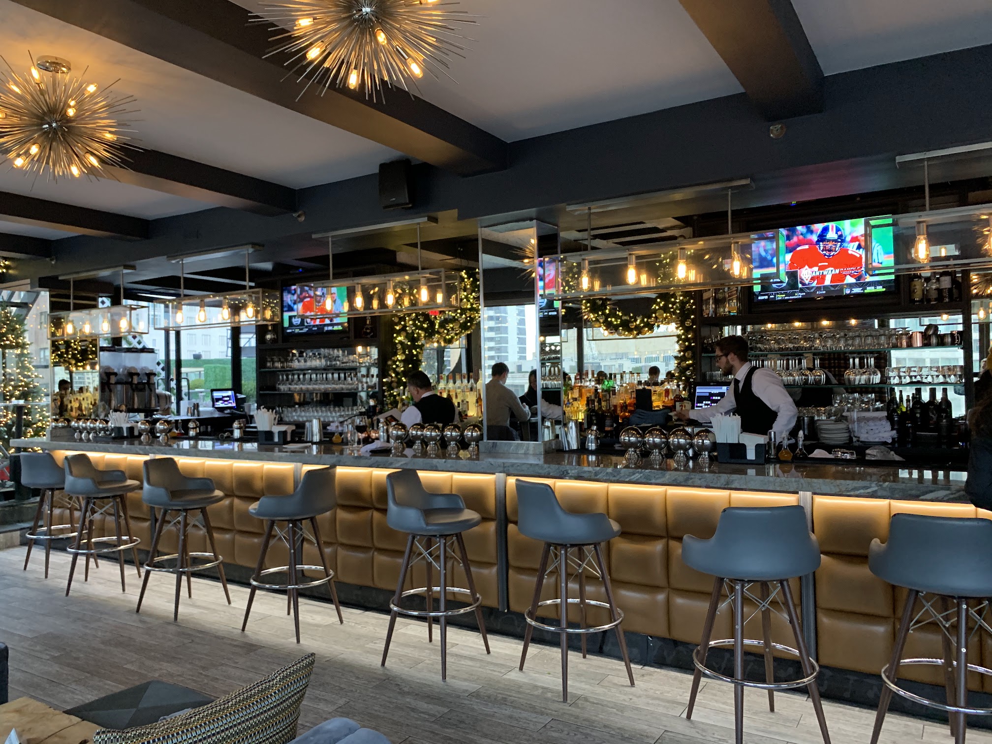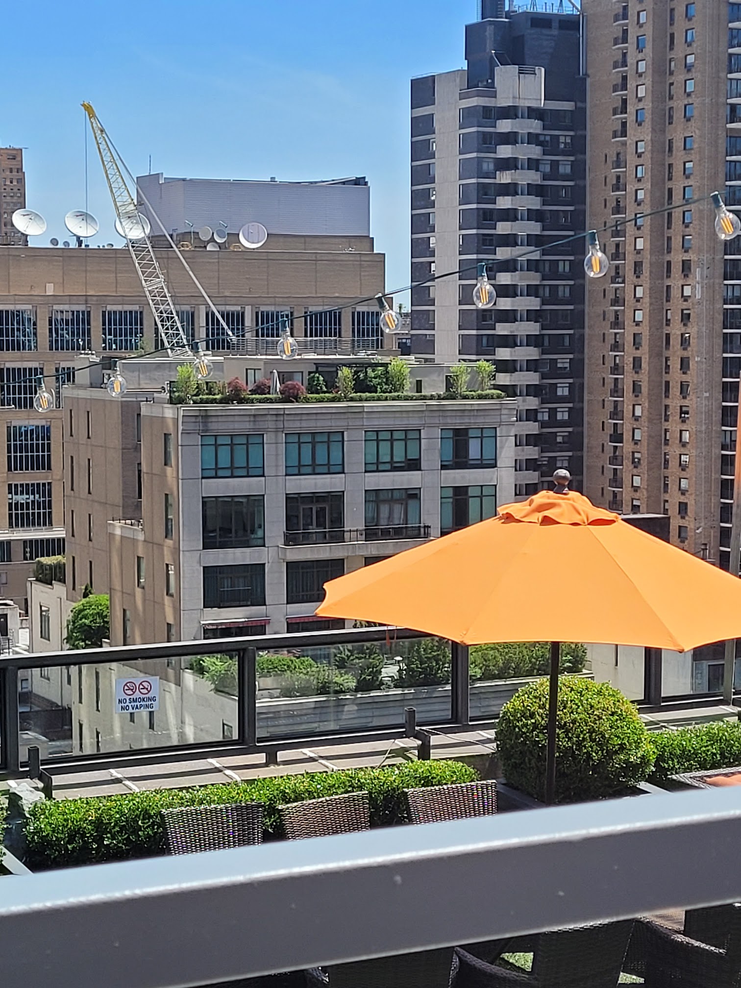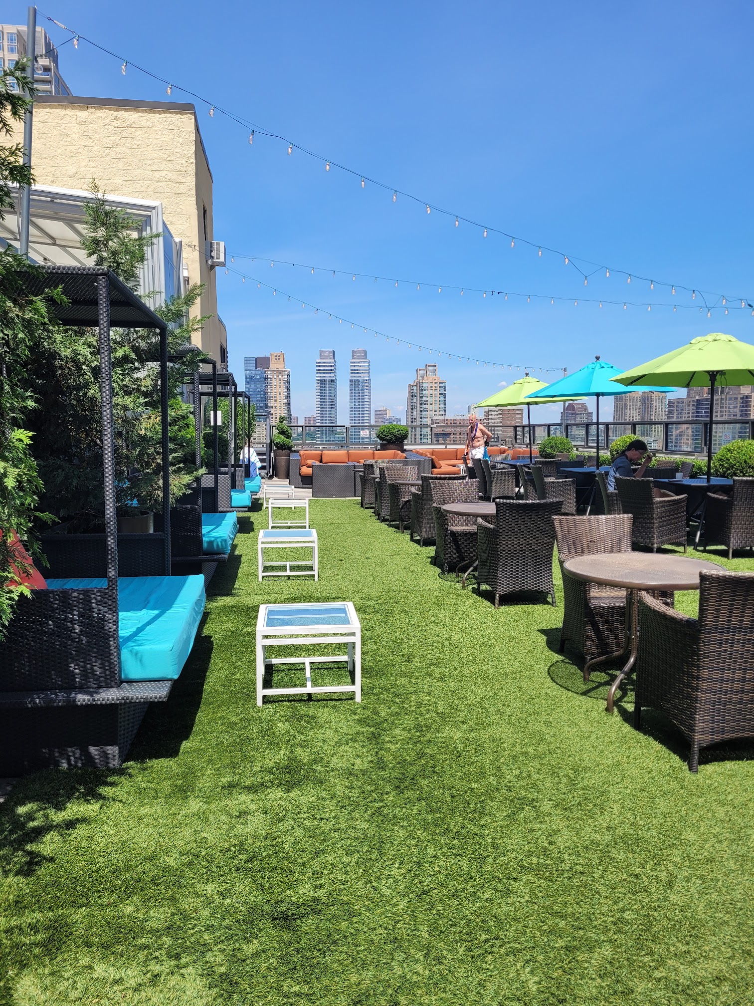 Looking for a brunch or cocktail with a view, this rooftop Bar on top of the Empire Hotel in Upper West Side of Manhattan is very cool. Cool. There are two different bars that serve patrons. One outdoor eating area that has umbrellas for shade and a nice faux Garden feel. There's also or sitting for dining and overlooking the vast buildings of upper Manhattan. As much as I like the atmosphere, the drink prices for cocktails were about $21 for cocktails and $19 for a glass of wine; a little bit on the high side, but if you want a sophisticated bar and restaurant sometimes the prices are reflective of the atmosphere. I would definitely consider coming back here again.