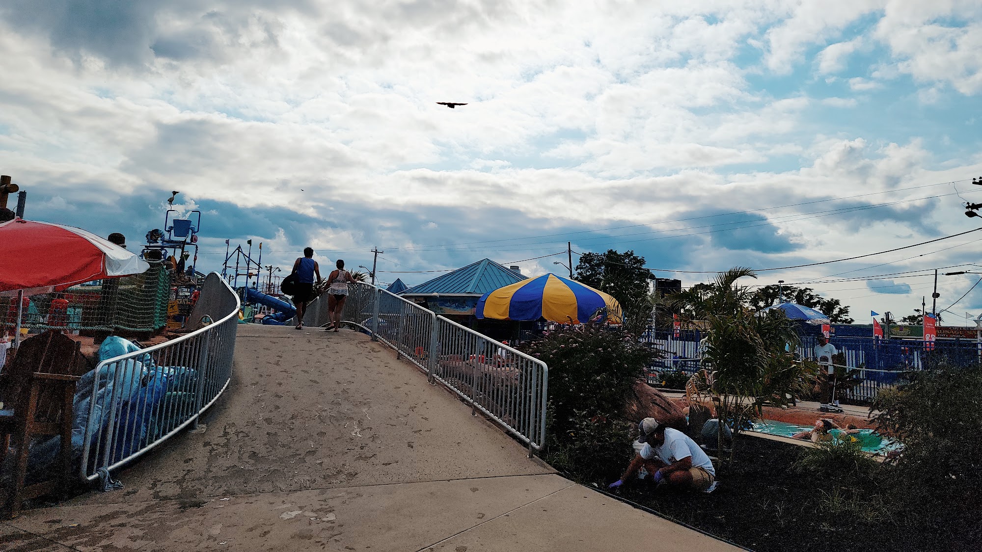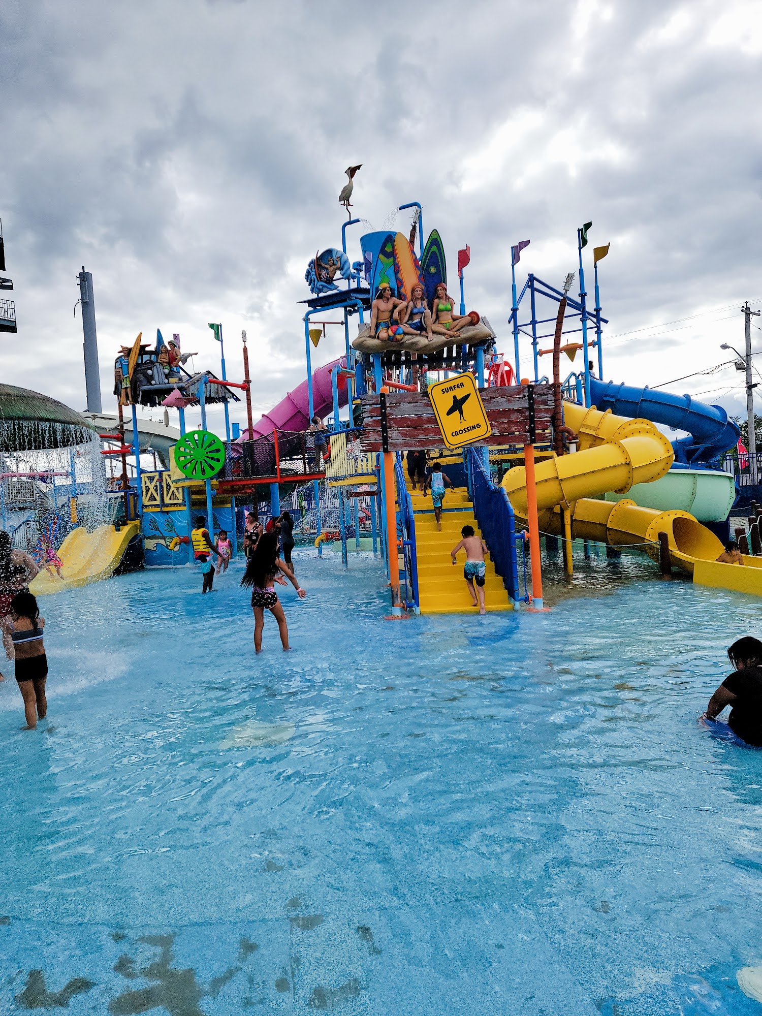 Family water park with slides and a boardwalk, plus a restaurant.