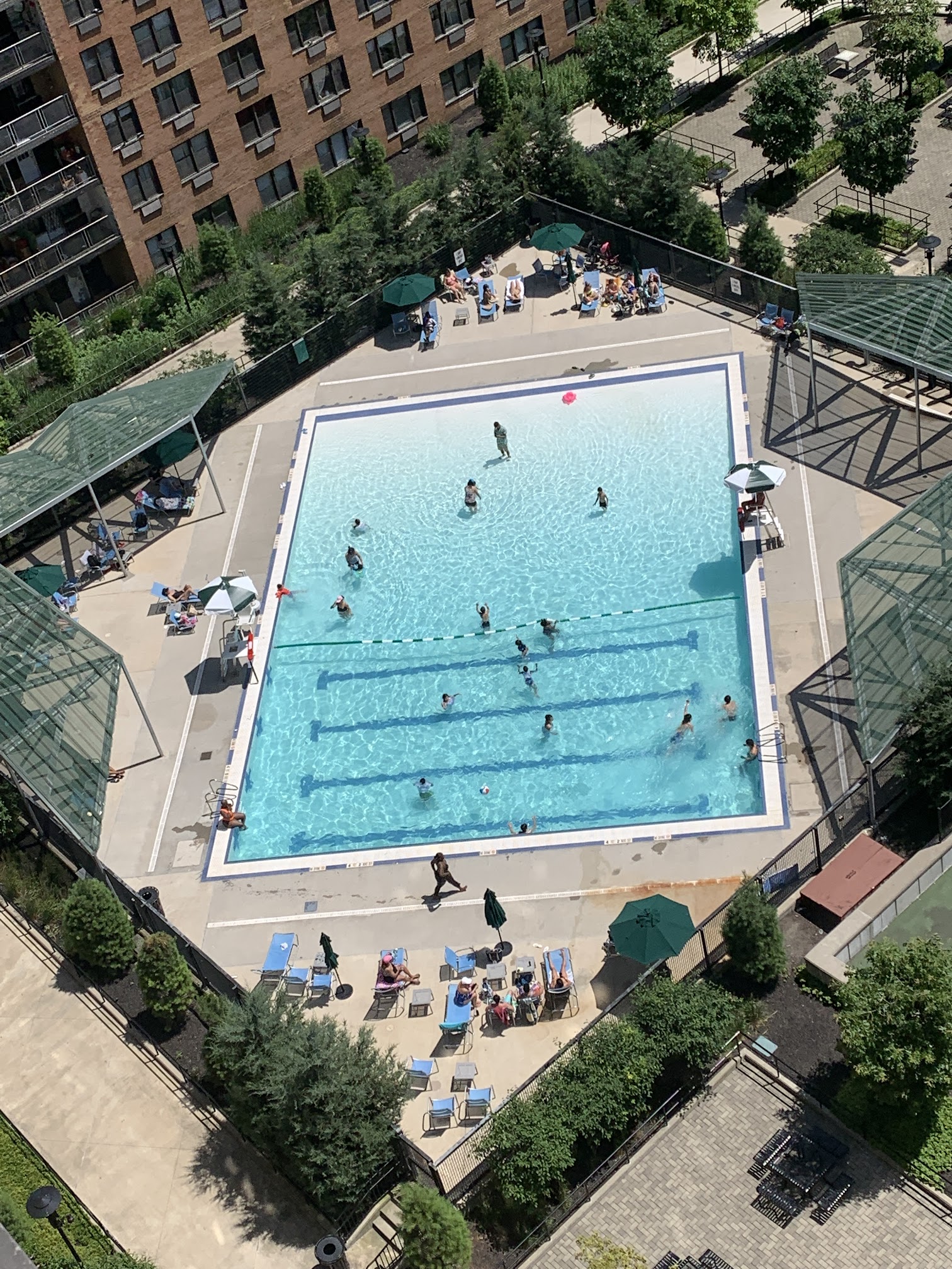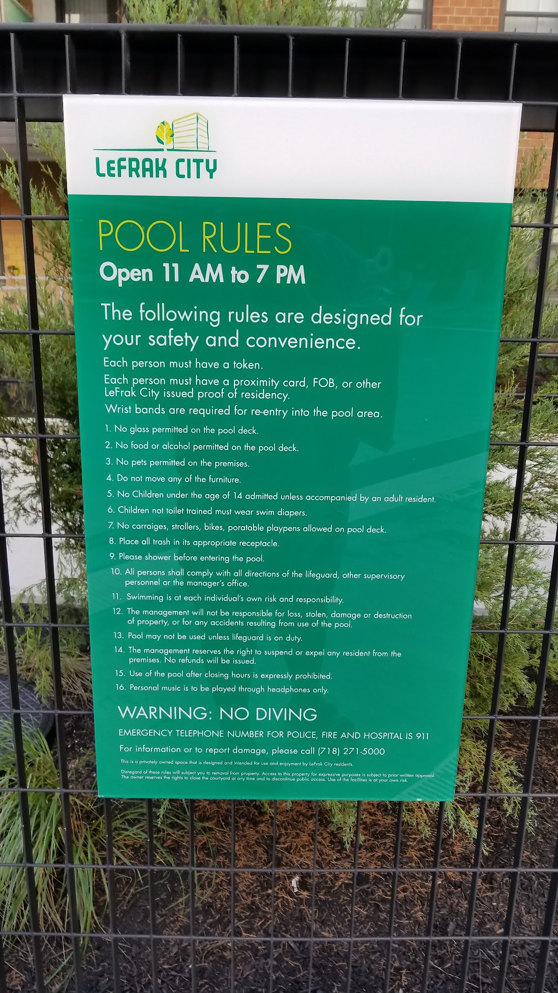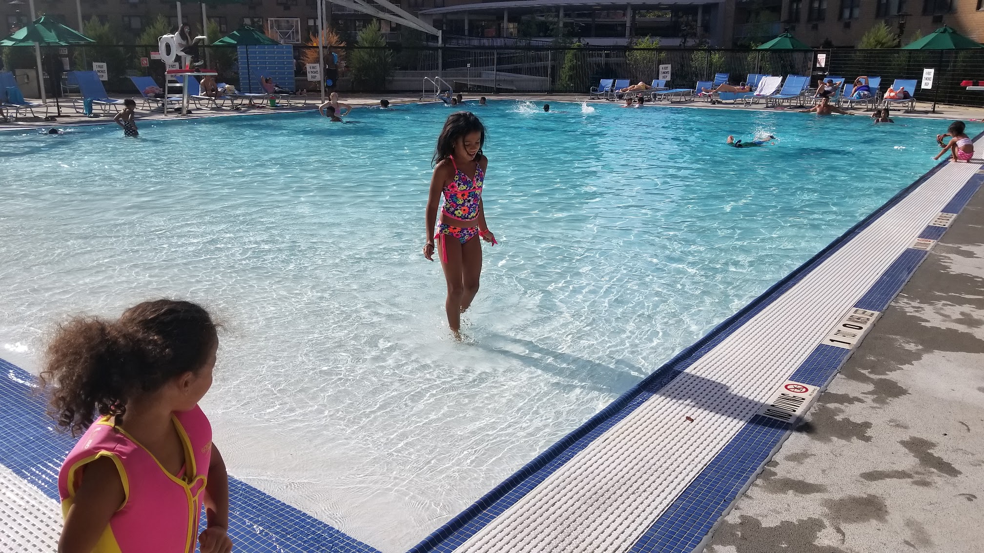 For Lefrak City residents only, you have buy a token at the token machine by the bathrooms & make sure to bring your key FOB for entry, it has to match the adults information the key was issued to. It's open Monday-Friday up until Labor Day. Great beach type pool for the kids, it goes from ground level to 4 Feet 2 Inches on the deepest part.