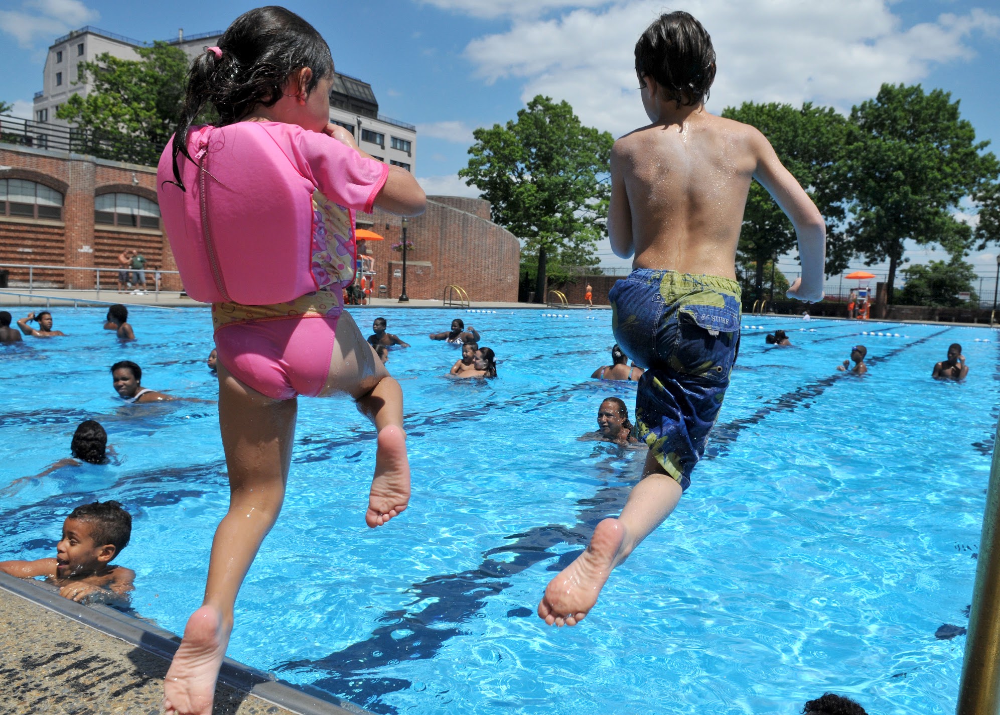Outdoor public pool offering free lunch.