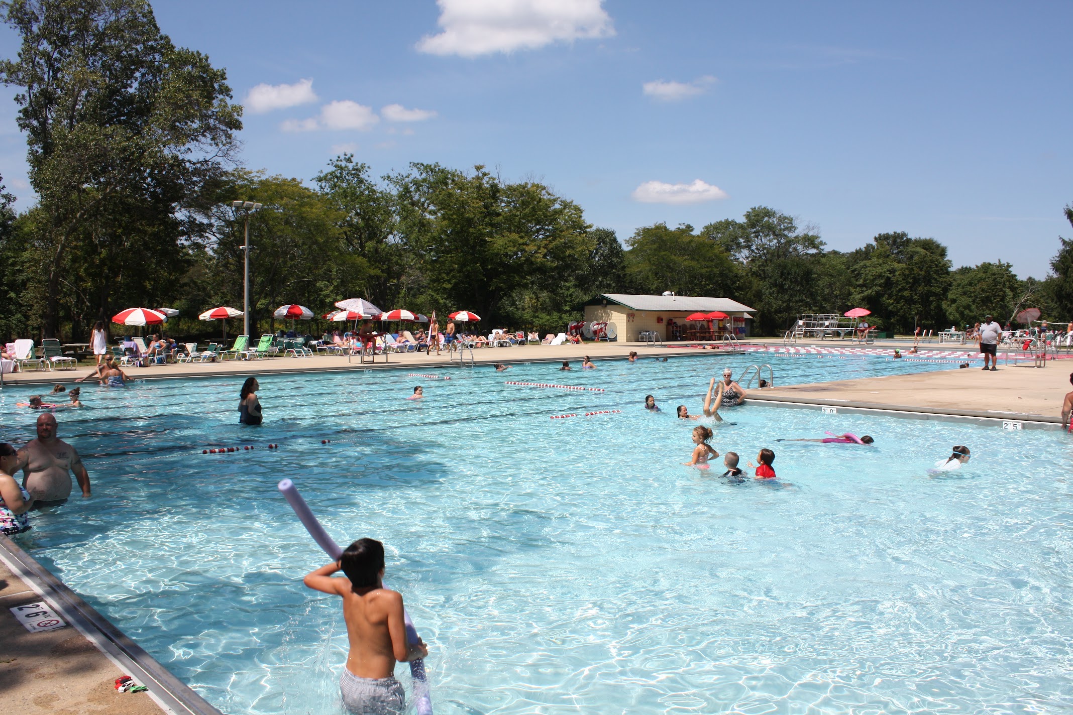 Set in a park, this community pool facility features lap lanes, a diving pool, and a snack bar.
