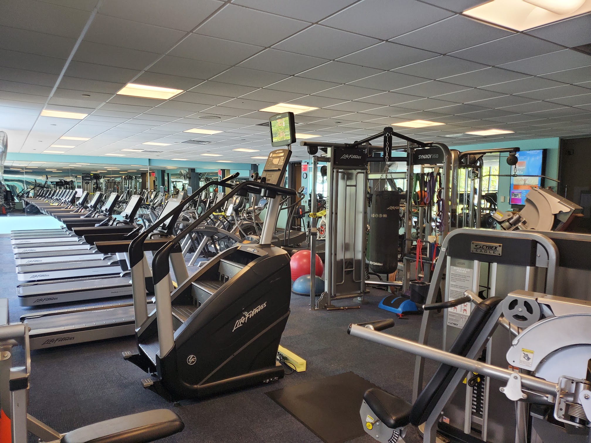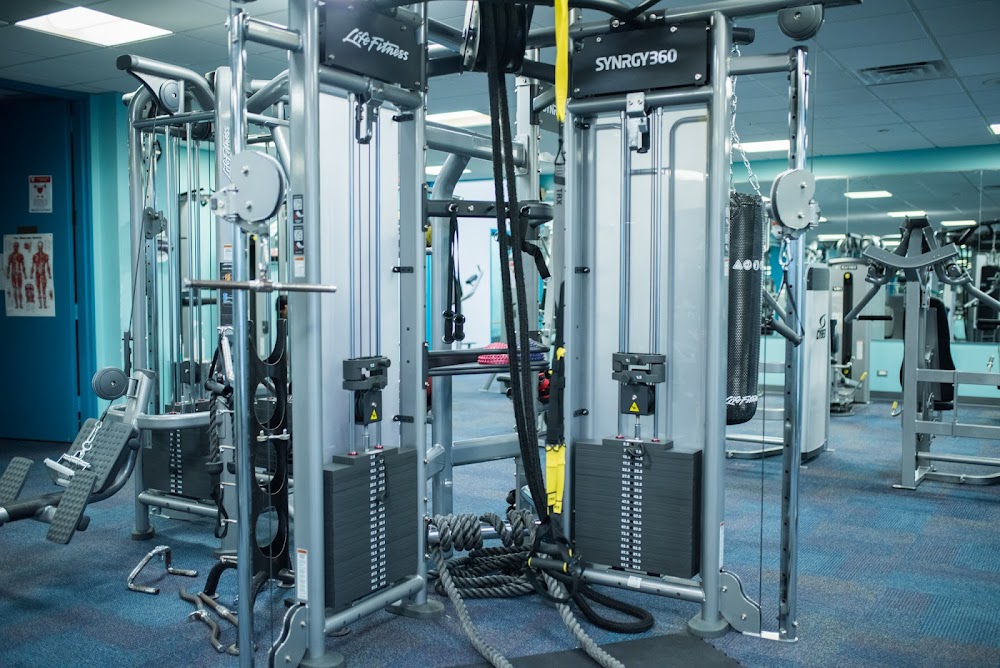 Fitness center featuring a gym, a pool and kids' swimming lessons.