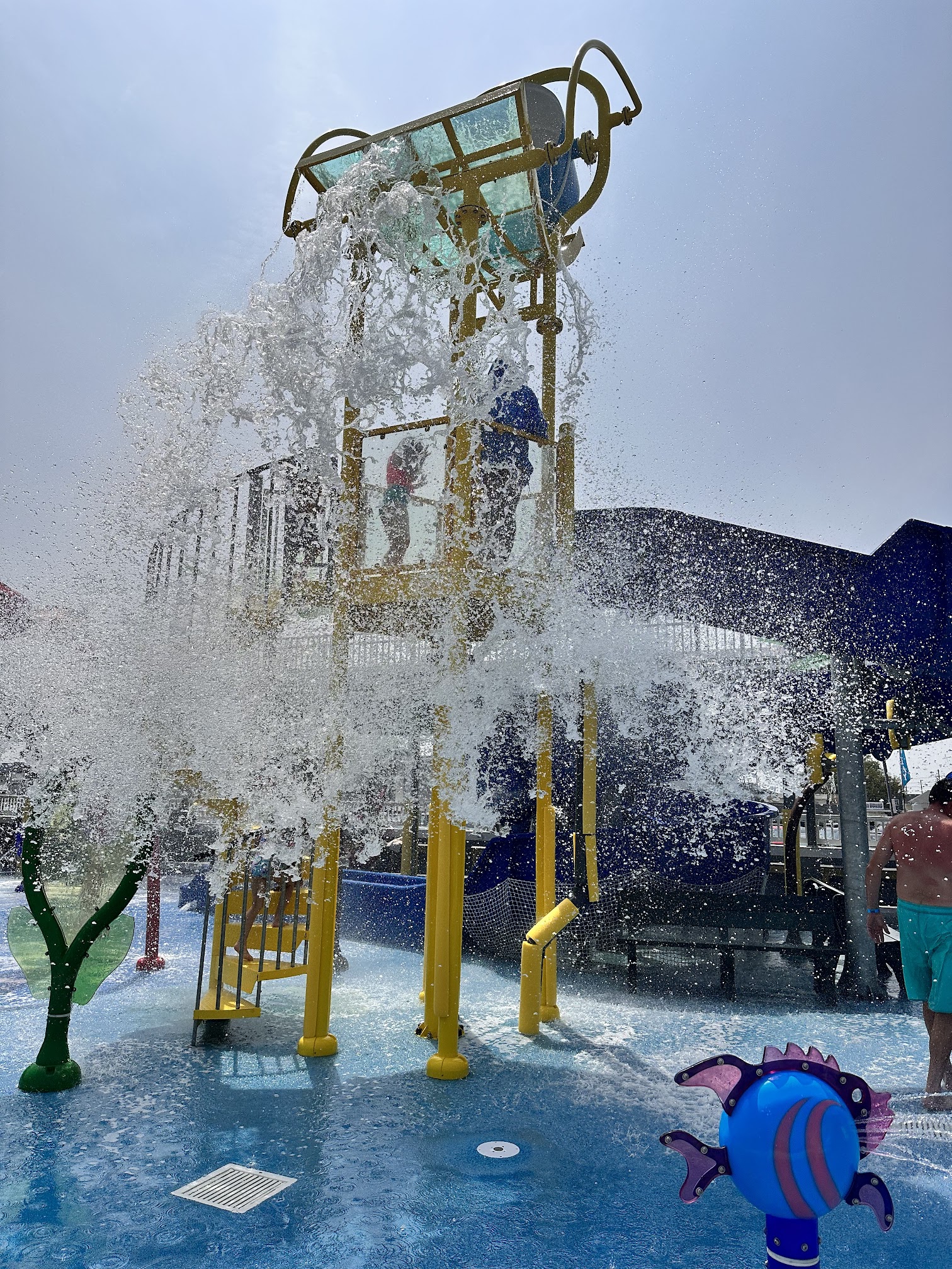 Kids' water park featuring sea-themed splash pads and a playground, plus slides.