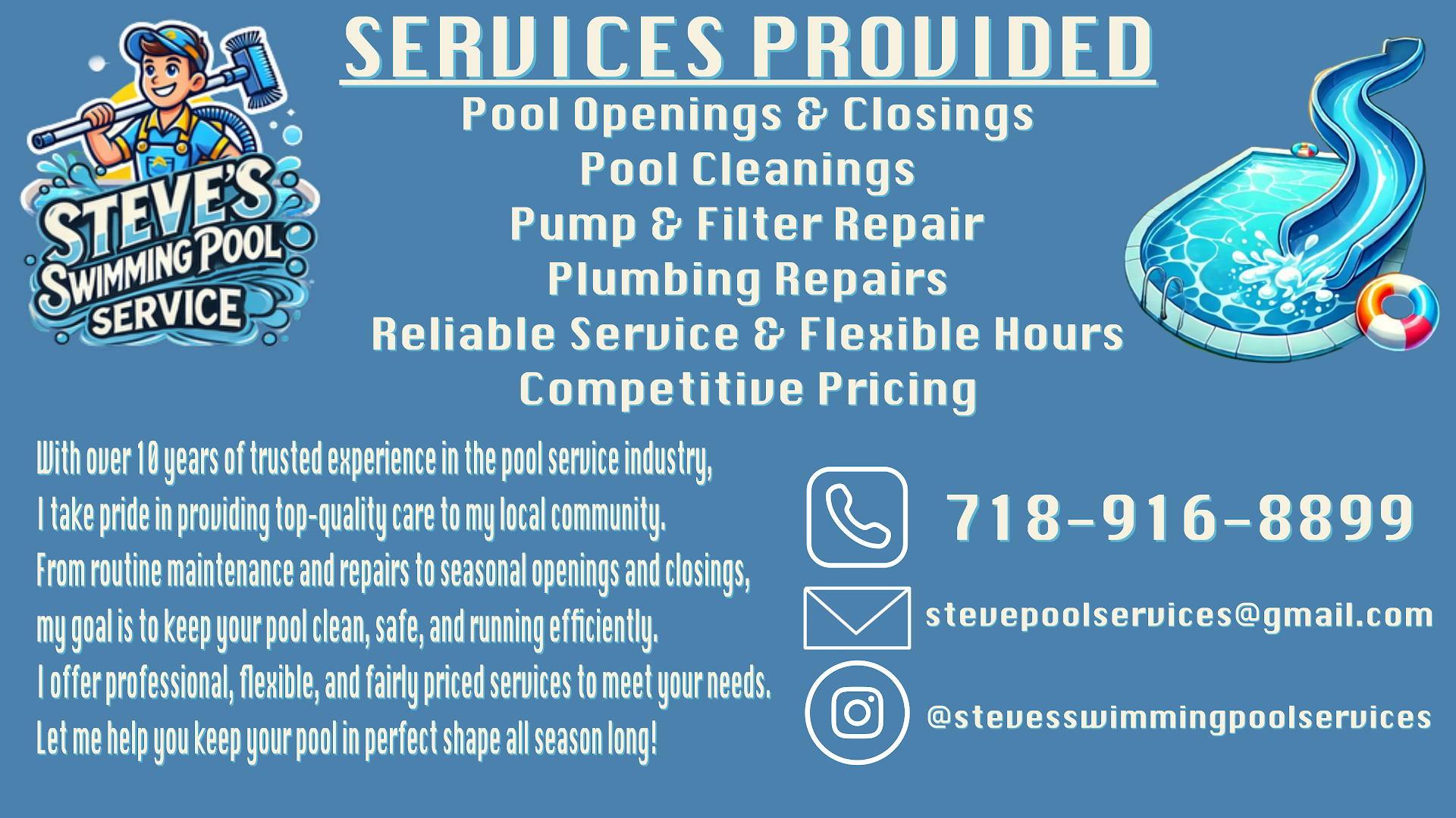 Steve is amazing!! He explained everything I needed to know about above ground pools, he was on time, super friendly & still answered my questions after completing the service. Will definitely be using him for future years! Highly recommend for pool opening & cleaning!