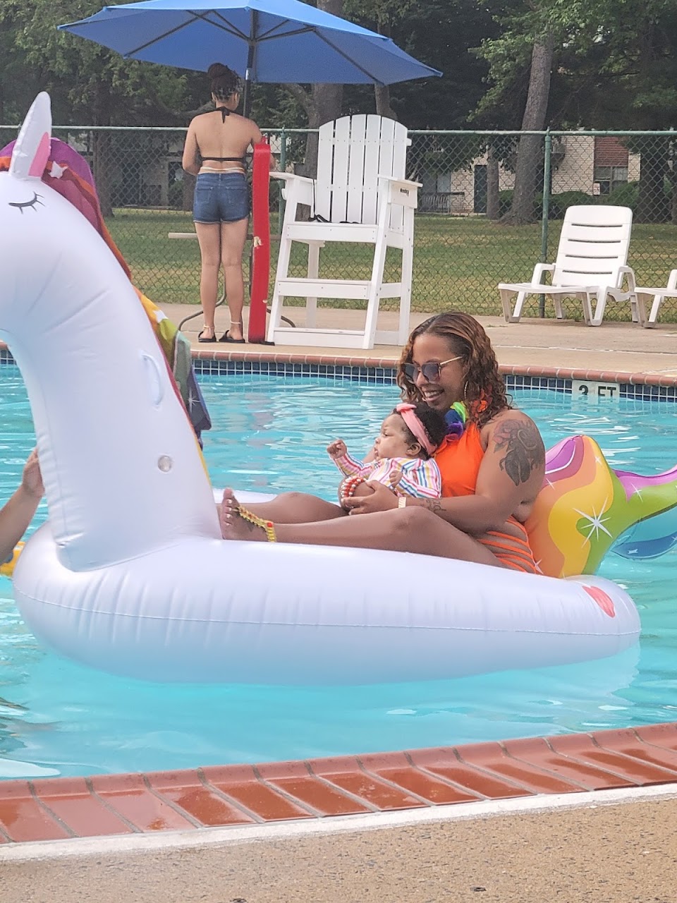 Beautiful Big Pool. Pool has tables and chairs for guest pool is from 3 ft to 8ft. You have freedom you can play your own music, oversized floats as long as it’s not too many people in the pool and bring guest as long as you purchase a pool past for $10. You can also bring food and drinks. Nice place to hang out. I recommend