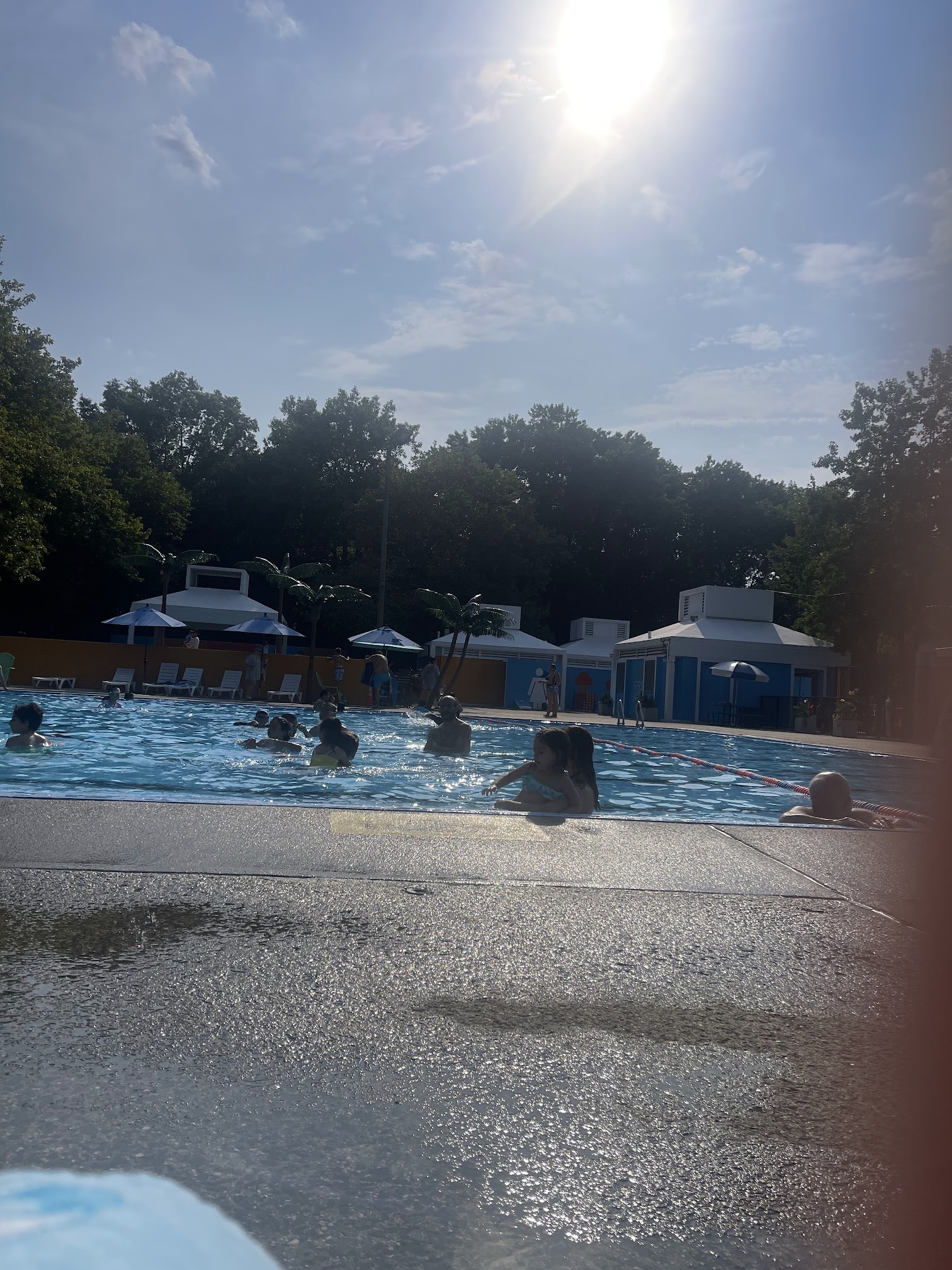 Really good experience at the pool today. I arrived at 10:30 and was able to find street parking in front. The line to enter moved fast, security was really nice and so were the lockeroom attendants and lifeguards. The rules are- you have to arrive in your bathing suit, a lock for your belongings. You can only bring a towel to the pool deck and water bottle. They provide sunblock and water stations. You must store other belongings in the lockeroom. They let me bring apple juice for my daughter to the pool deck since it was in a clear plastic bottle, no glass allowed. You cannot have food there either. The locker room is clean but poorly lit. There are several changing stations with curtains. Then you have to rinse your body before entering the pool. The kiddie pool was the main reason i came, my 16 month year old swam in the 1.5 foot pool. The lifeguards are attentive and the pool was fairly clean minus small bugs that flew in. I appreciate that there was some chairs to sit on and ample shade. The downside is they don’t allow floaties, and i wish they did since my daughter is so young and cannot swim yet. It is nice that they give free swim lessons here to all ages and extend pool hours on hot days. I also like the cornhole and connect four games. The cool mist palm trees were also so refreshing, i would totally put one in my backyard. The adult pool has multiple lanes and is pretty much Olympic sized but the most shallow is 3.5 feet. Not optimal for toddlers. There was tons of seating available along with tables for families. I also appreciate the playground for children. They clean the pool between 3-4 pm so it is best to come at either opening time of 11 am or 4 pm. I did not see people buy or have pool wristbands and i saw a separate line for that so i assume it only is offered on crowded days like the weekend. It also is annoying that workers can use cellphones but patrons cannot. I did appreciate that the pool temp and bacteria was frequently being measured, there is overall good maintenance here. I will totally come back here!