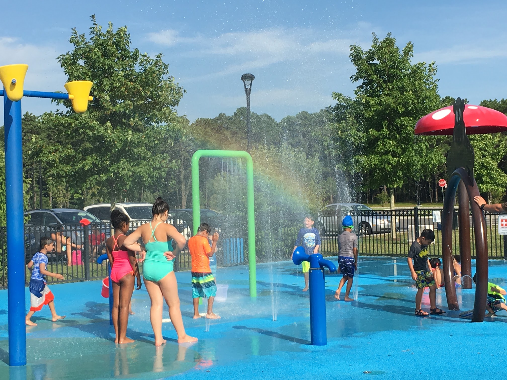 Great place to take the kids on a hot day. No charge for parking or for getting into the water park. The water park is not very big. They have a handful of water devices. But it’s enough to get wet and cool off. No place to change clothes. For the area for adults to sit there’s no shade. So come prepared. Next to the water park are swing sets and a playground.