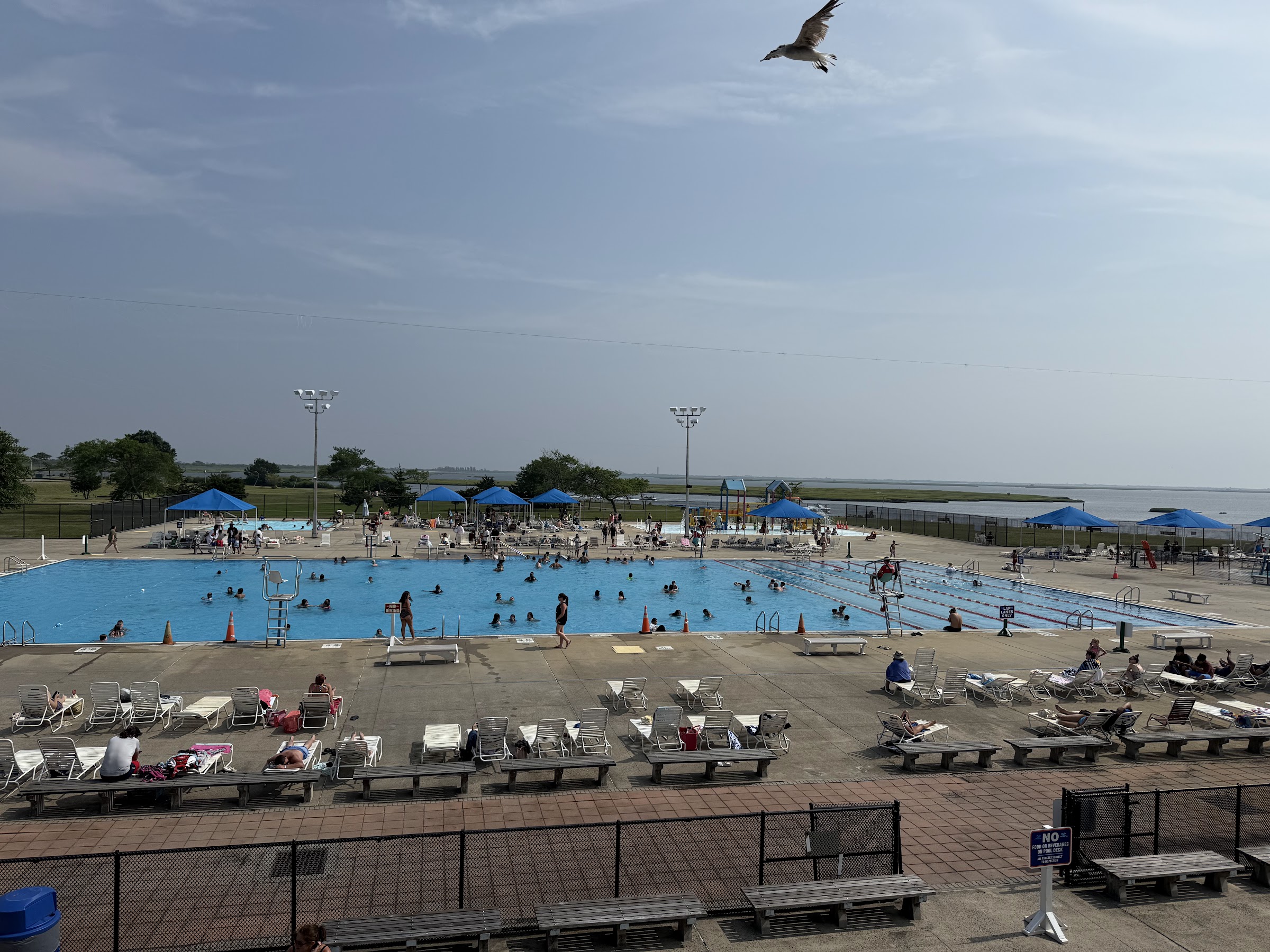 Overall this pool is well-kept but some of the lifeguards are tyrants. My biggest concern is what I found on the upper floor of the concession pavilion. The metal bases of most of the columns are rusted and deteriorating. With rusty mental shards protruding. My daughter almost sliced her leg open on it. In addition, there’s at least 1 large light fixture dangling by a thread from the ceiling. One strong gust of wind and that things coming down on someone’s head! Here’s an idea…instead of paying lifeguards to stand around harassing paying patrons, let’s divert some of that money to fixing these law suits waiting to happen.