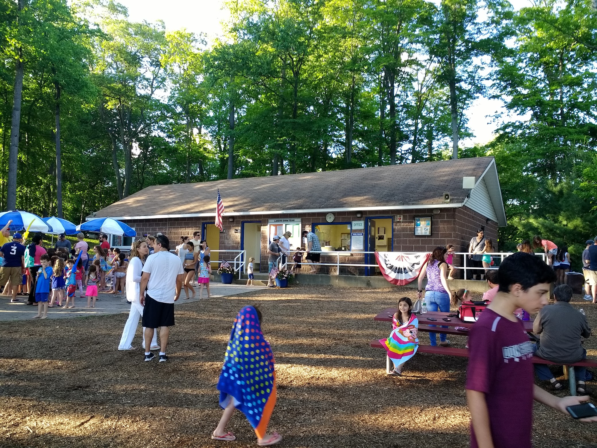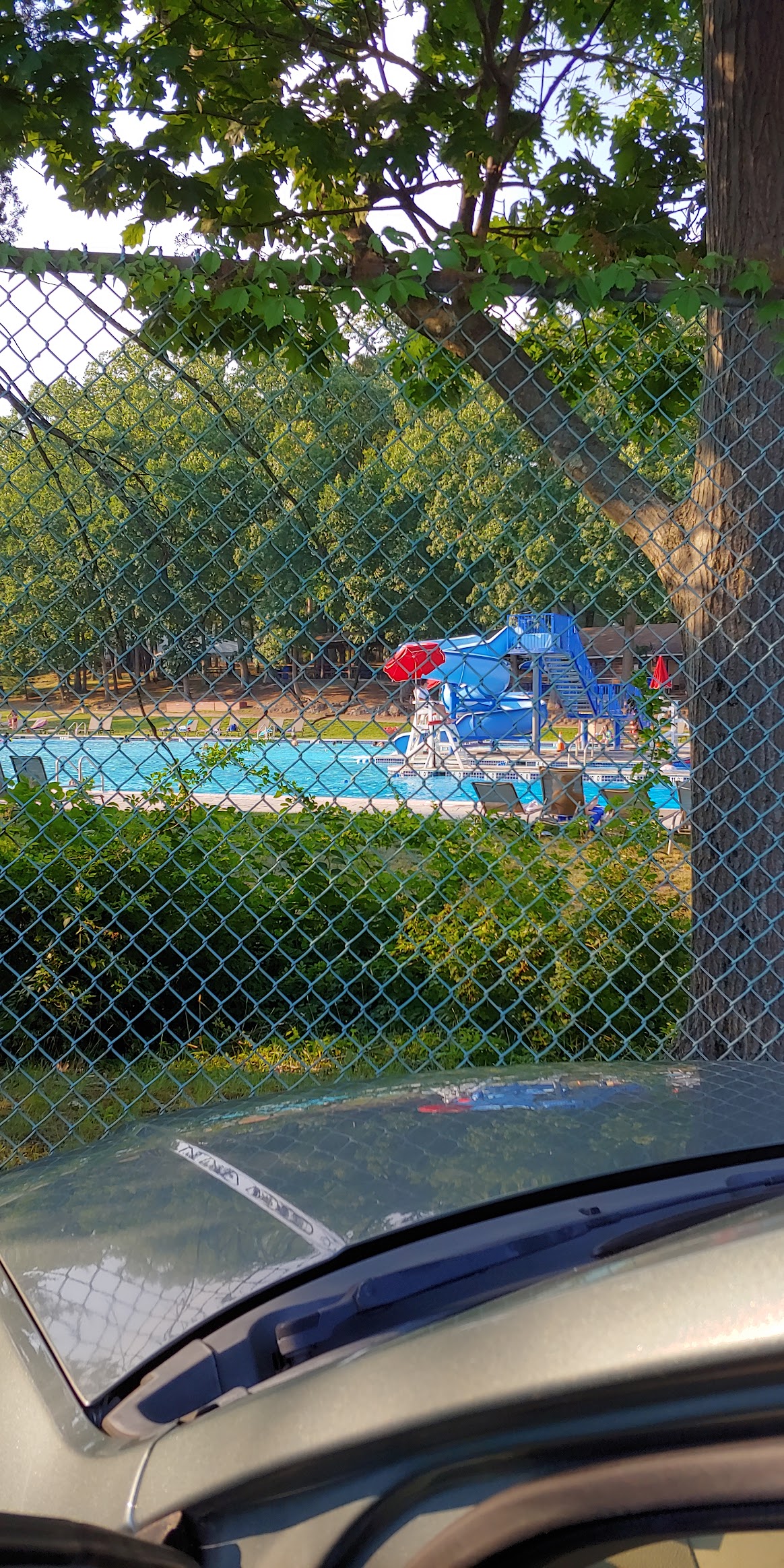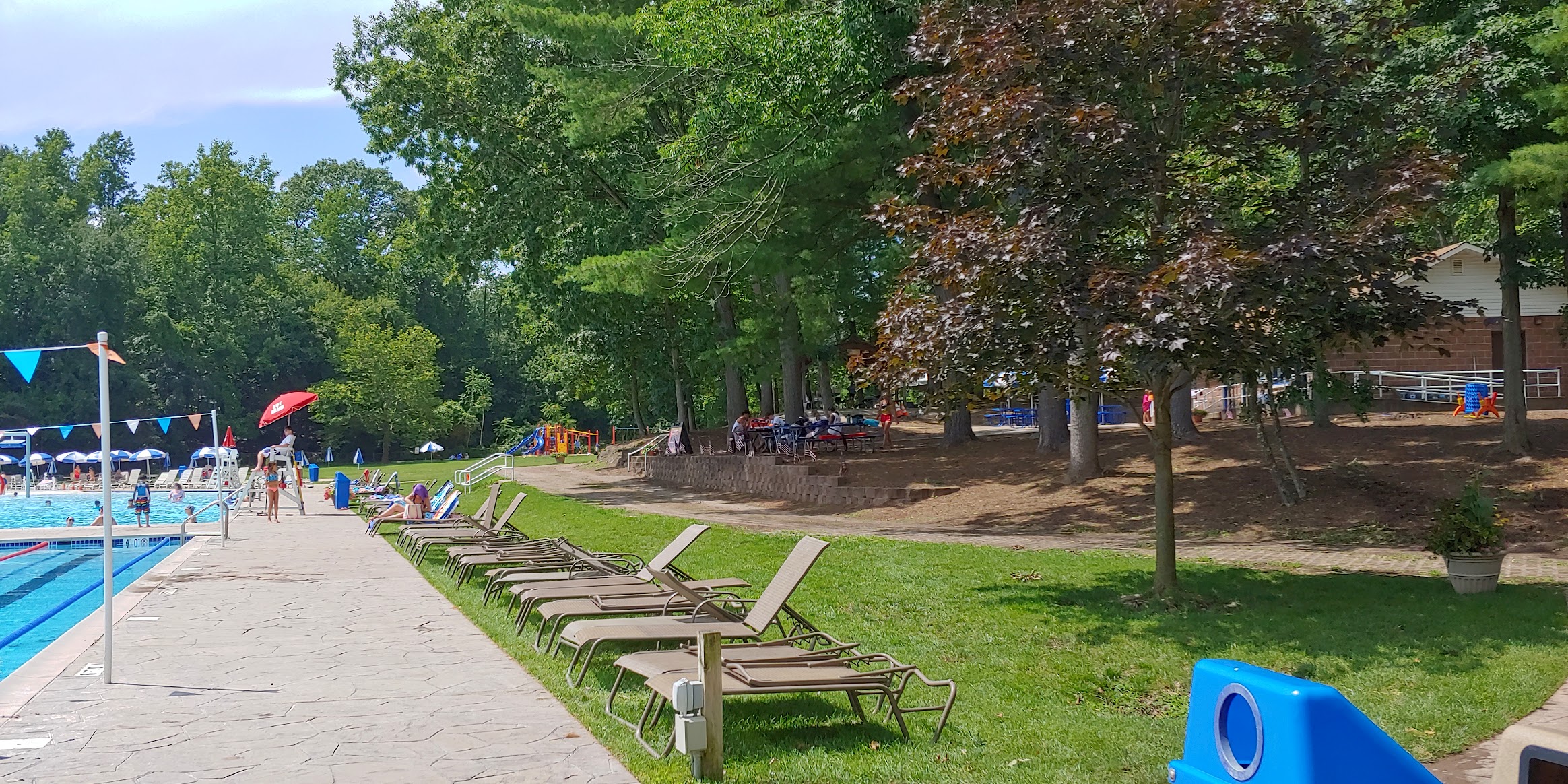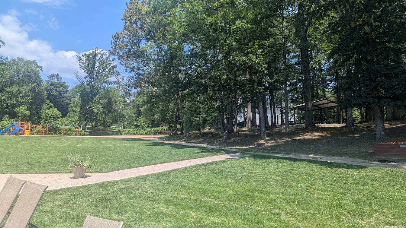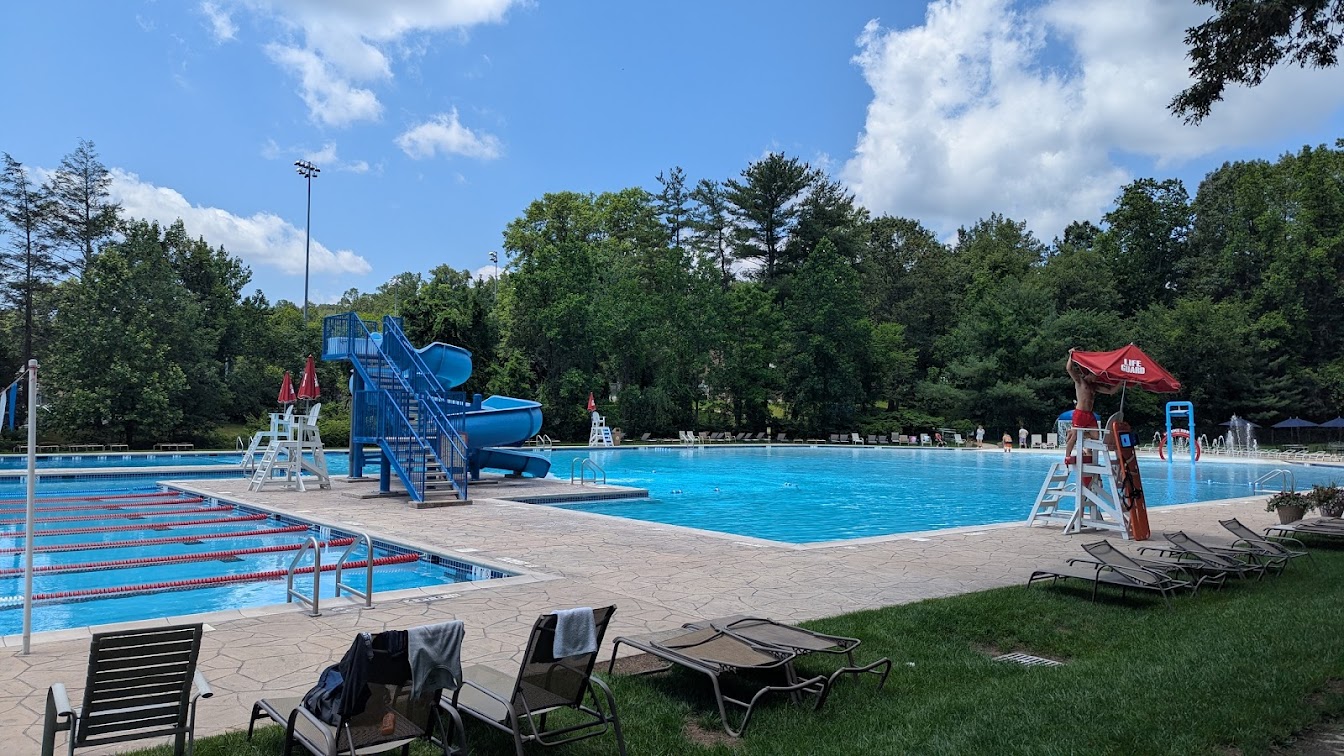 The loveliest town pool complex around! This is a large, beautiful pool in a well kept, manicured, yet natural looking setting. After only a few visits, we like it much more than other local facilities. We highly recommend Woodcliff Lake's lovely Old Mill Pool for summer fun for the whole family. THIS POOL has a ZERO entrance beach-like area that is child and senior friendly with fountains & spilling water buckets along with the usual "waterfall mushroom." This whole end of the vast pool is only about a foot or so deep and the remainder graduates up to around 4.5 feet with a buoyed rope to show where it gets to around 3'+. *Note: There is not a separate fenced kiddie pool, so moms of multiple little ones might find it challenging to keep them contained in a safe zone without help. However, water wings and plenty of life guards stationed all around the pool might help allay your worries. A roped off area at the deeper end of the pool delineates the splash zone for the very cool twisty slide, and additional sectioned off areas are deep enough for swim lessons, diving boards and competitive swim lanes for lap swimming and the town swim-team meets. Seating includes chaise style loungers around the pool, tables with sun umbrellas, chairs and some benches at the zero entrance end. A picnic/party area under cover is available for a fee for group events, and is located near the building with bathroom/changing room, an ice cream/snack stand and umbrella tables on a picturesque knoll overlooking the pool. There is an open grassy field with a swing set and climbing structure for children, away from the pool area for safety. **The whole of this facility is technically handicapped accessible. However, be aware that it can be challenging to get to the bathroom facilities without a bit of bumpy navigating over a rutted vehicle access path (far more challenging with wet ground and muddy puddles). Paving a safe handicapped accessible ramp would bring this facility to the next level. Hope this review is helpful! 🙂