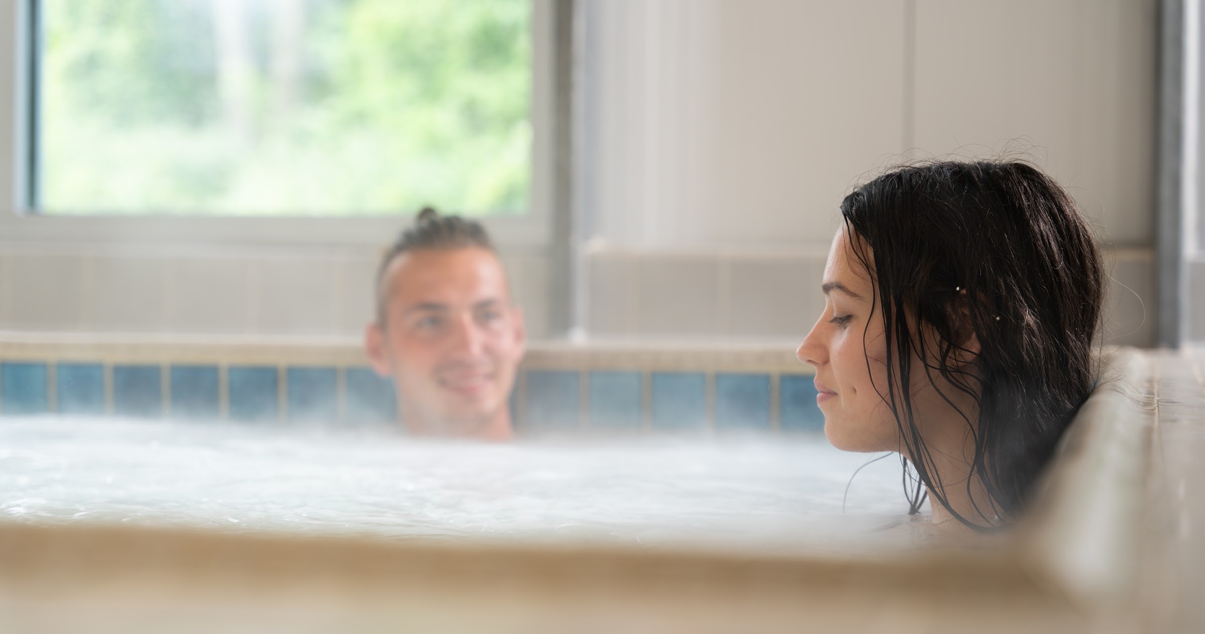 The aquatic center features a 25-yard, four-lane lap pool maintained at 82°F, a warm water therapy pool kept at 90°F, and a whirlpool at a relaxing 102°F.