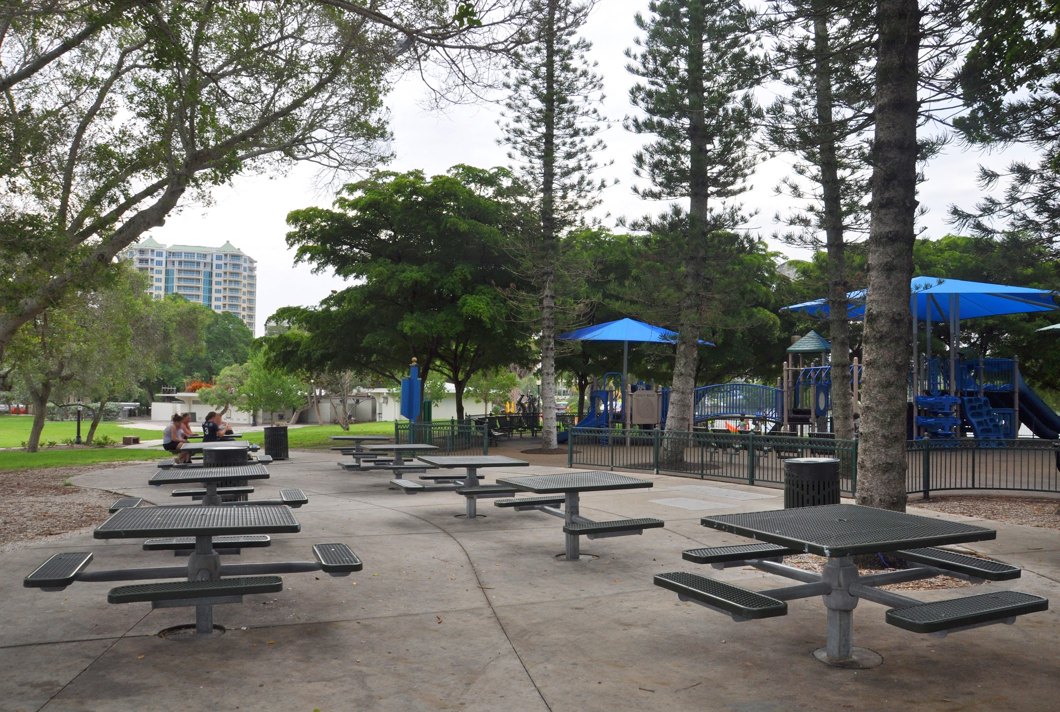 Nice entrance. Walked in from downtown due to lot being closed for a boat show. Nice stroll along the water on paved walkway. Boat slips on one side, then switches between rocky shore and sand. The center is trees, dolphin fountain (not running) and kid's park with splash pad. There are picnic tables and a restaurant on the water was a couple weeks away from opening.