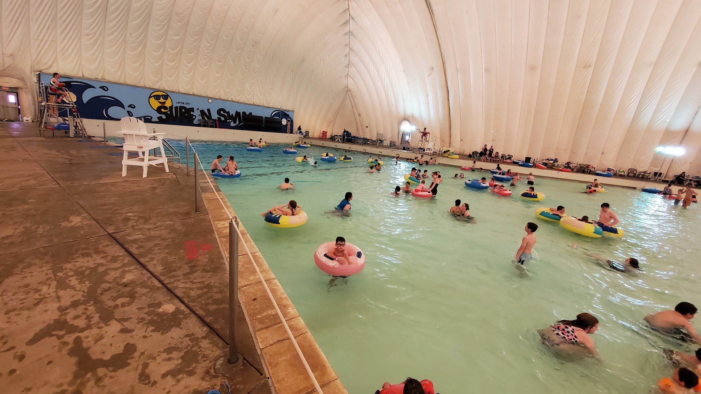 Year-round pool featuring a wave pool and a bubble cover for winter use.