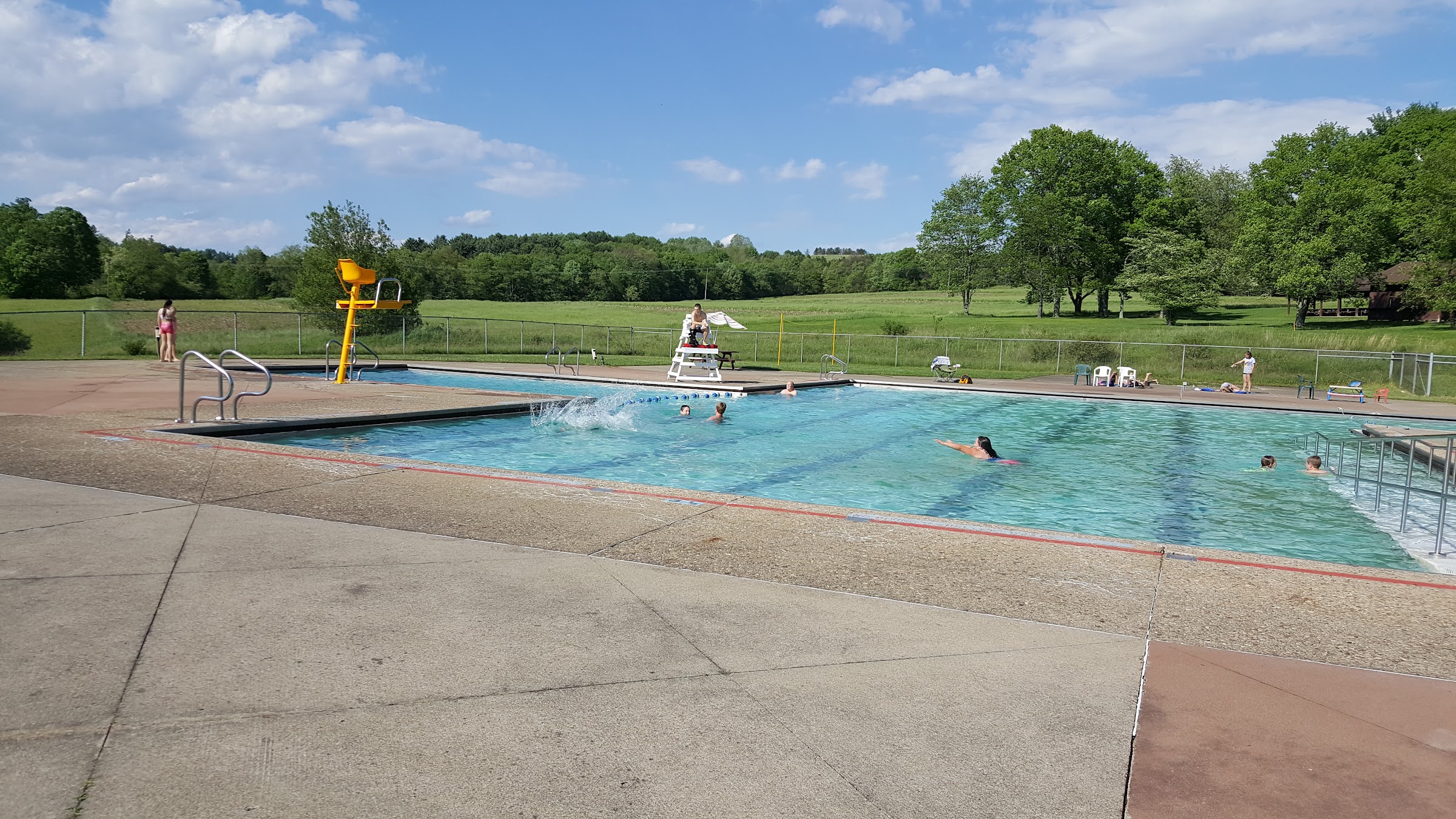 For such a small town we were impressed. It's a big pool with three depths, but diving board has been removed in deep end. Could use a dozen or more adjustable sunning chairs. Grassy and paved areas for sitting or sun bathing around the pool. Painting and patching needed in several areas inside and out of pool. (Some stains actually look like poop laying on bottom of pool.) Bathhouse was dated...could use upgrades, but generally clean. Staff were friendly. Lifeguards swapped every 30 min. Flying insects were hungry for human blood! Perhaps needs a good insecticide spraying of grassy areas. The parking lot access road needs potholes filled. Swimming fee was $6.