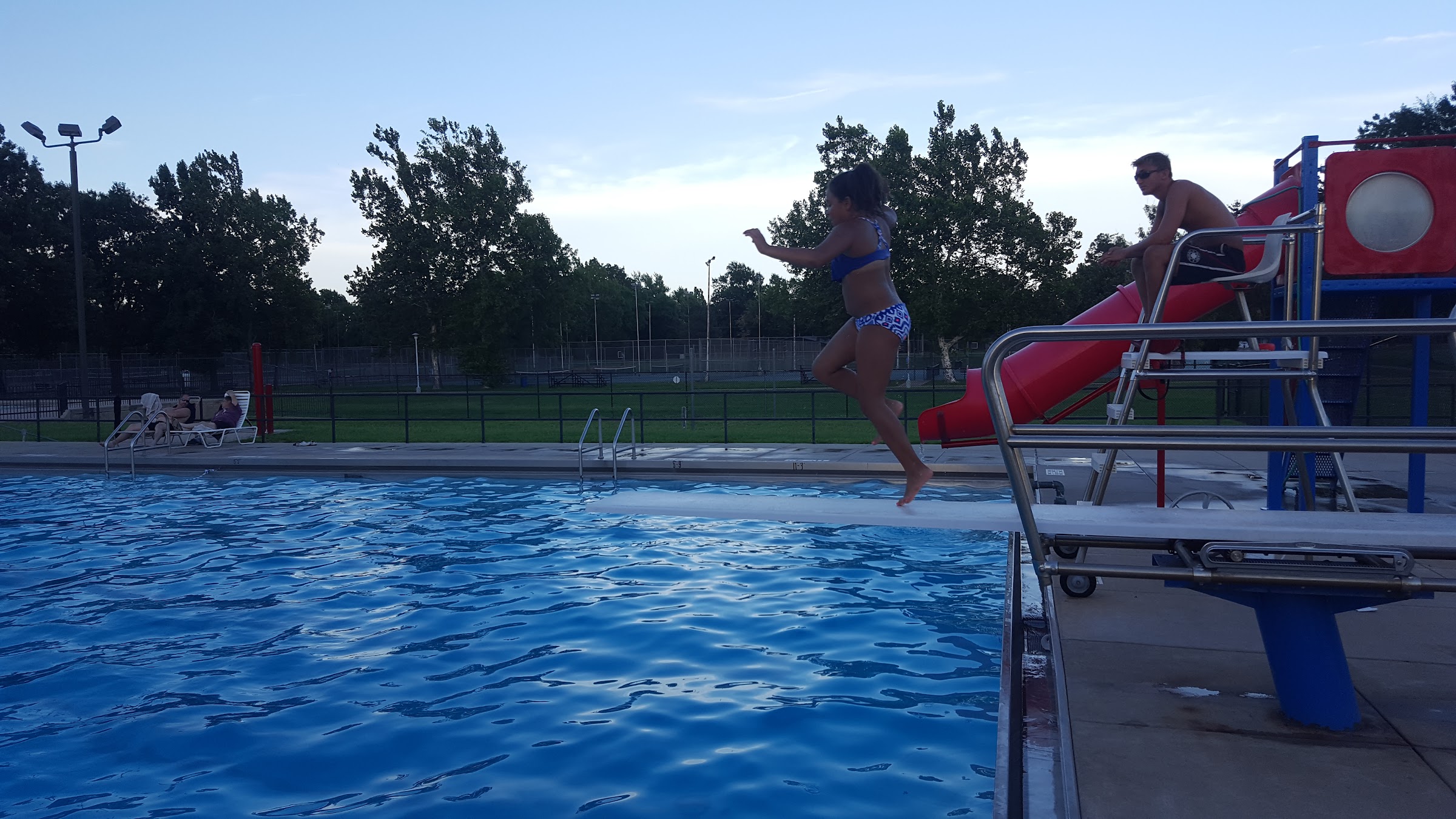 Great Olympic size pool with a low diving board and a twist slide, toddler pool is perfect for the little ones. Comfortable lounge chairs, shaded areas with tables and a small concession stand with snow cones, chips and a few other things. Very clean restrooms, a bunch small lockers, and 6 or 7 lifeguards on duty at all times. Best of all the Grand kids love it ! !