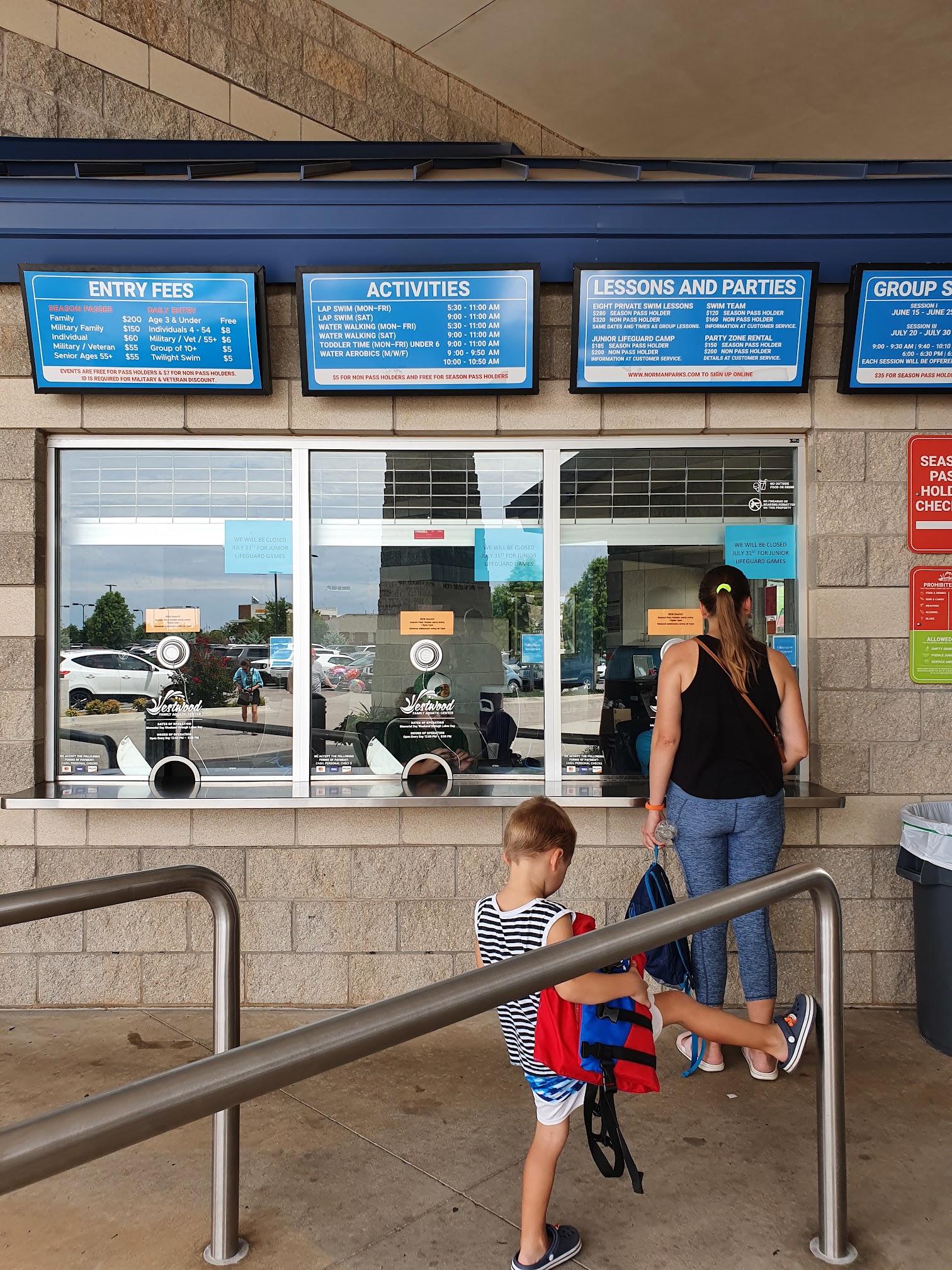 I am an older person, and I really enjoy the day. The mornings at Westwood, they have a lazy river that most people walk. It's great exercise and easy on the body. They do have season passes or you can pay $5 at the door. Very clean showers and bathrooms.They also have weights that you can use in your water walking