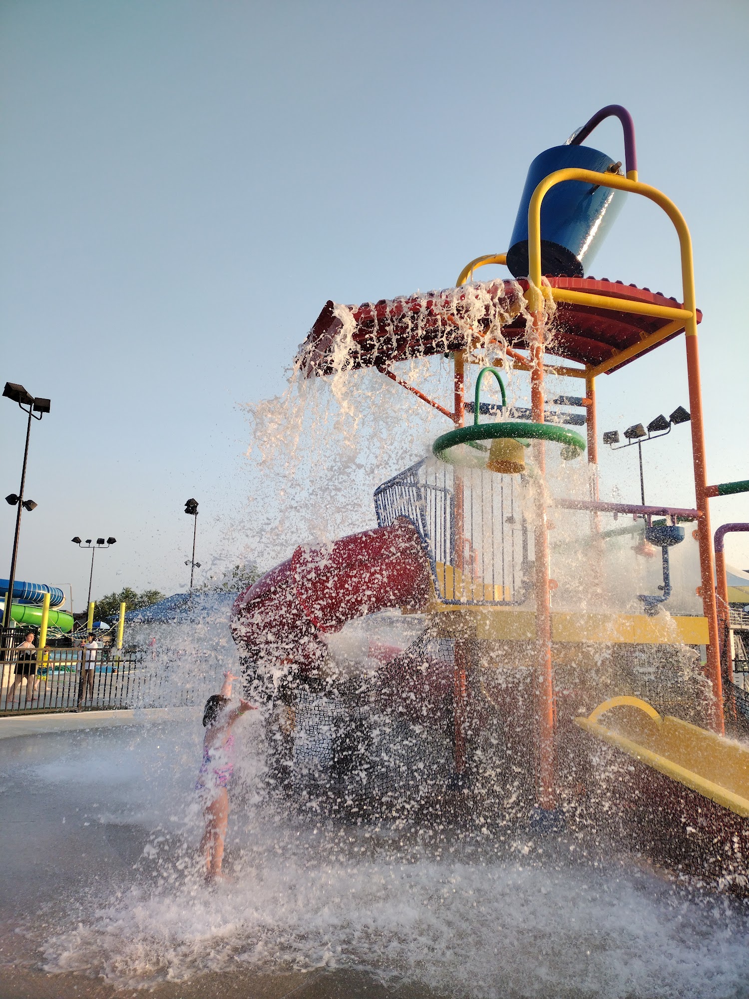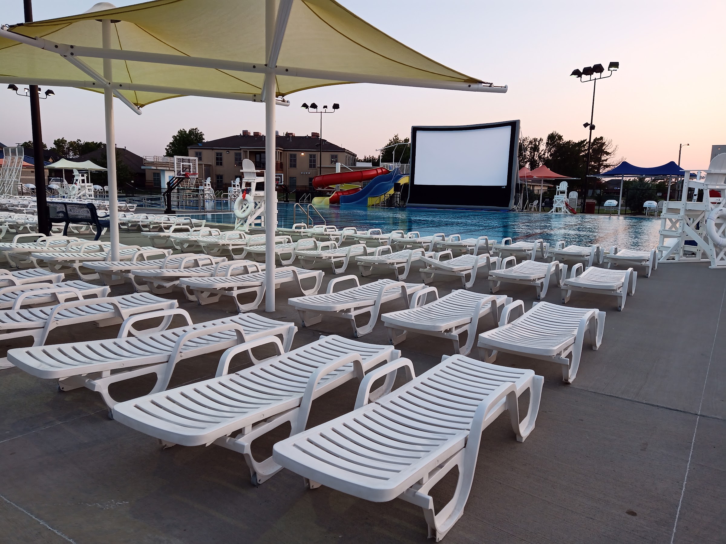Different swim times, lessons, walk times etc. Main swim is 1pm to 6pm. It's nice. The water was nice and cool when we went 2 weeks ago. It felt amazing. It's clean, has a concession stand, kiddie play pool, toddler pool, slides, lazy river... it's a good time and it's not so big you lose your people.