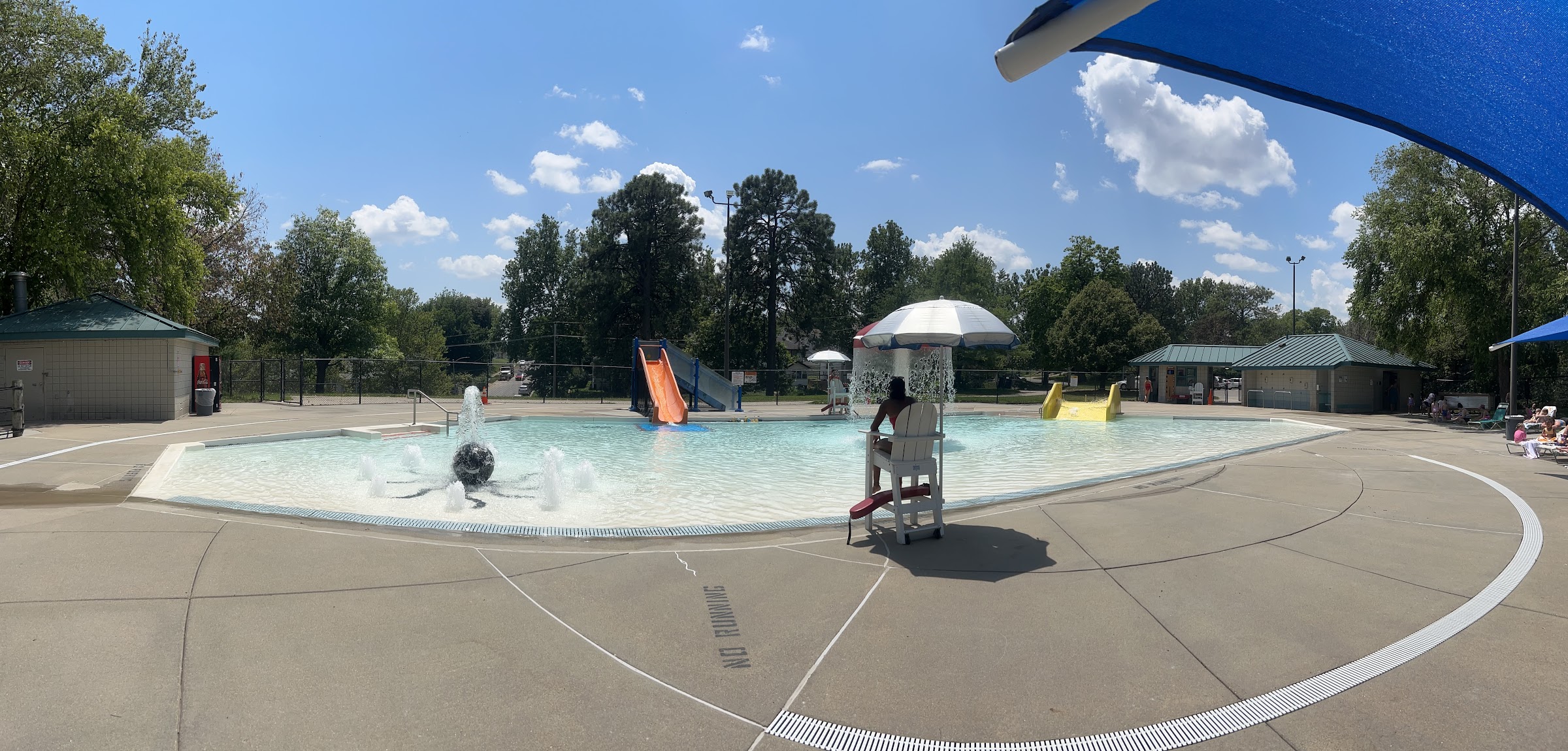 Public pool with a splash pad for toddlers, opening for the 2024 season on June 7.