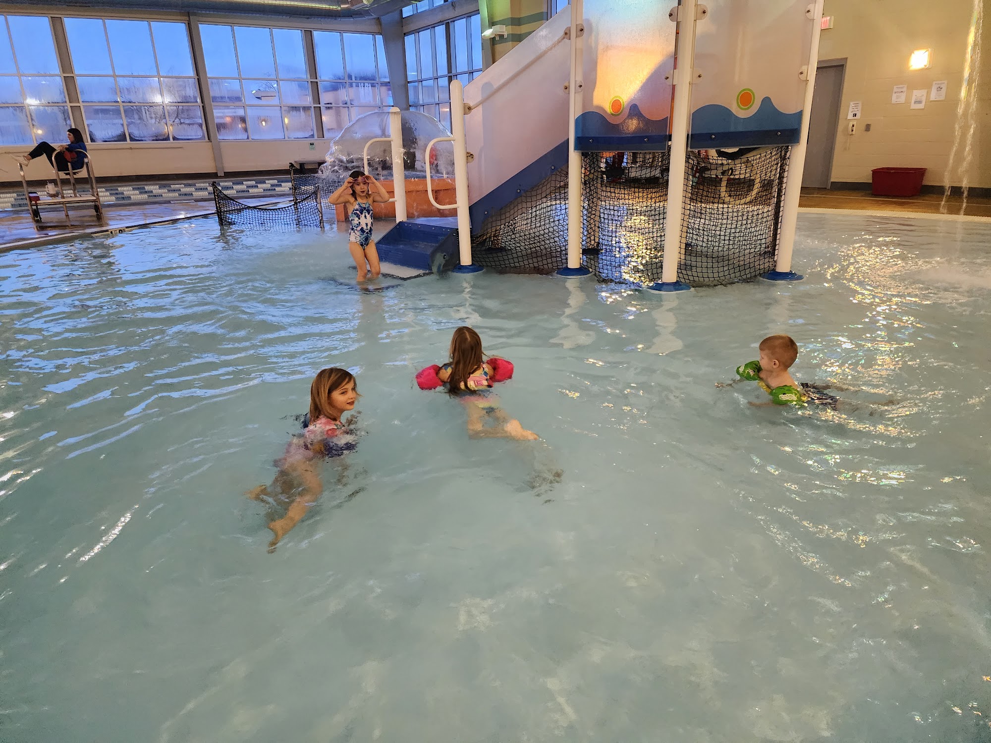 Great Indoor Pool and work out facility. Water slides for 4- adult and a kids slide in the kids swimming area thats one of the more neat water slides I've seen in a kid area of a swimming pool. Walk in beach type pool, so for all ages. Nice indoor track and high quality work out equipment, racquetball, leagues, big hotter, sauna, the staff is very friendly. Would recommend to any one in the area. We have a family Membership.