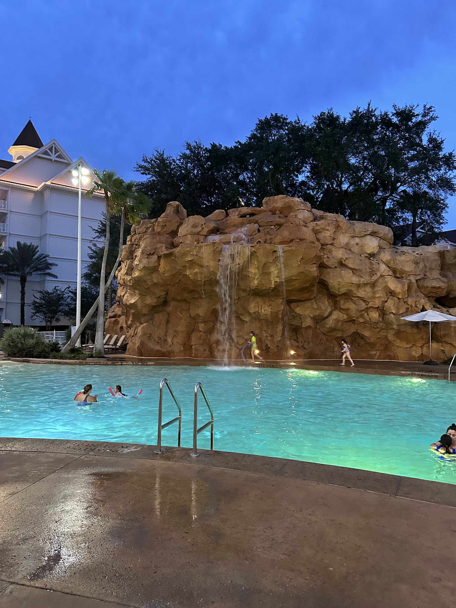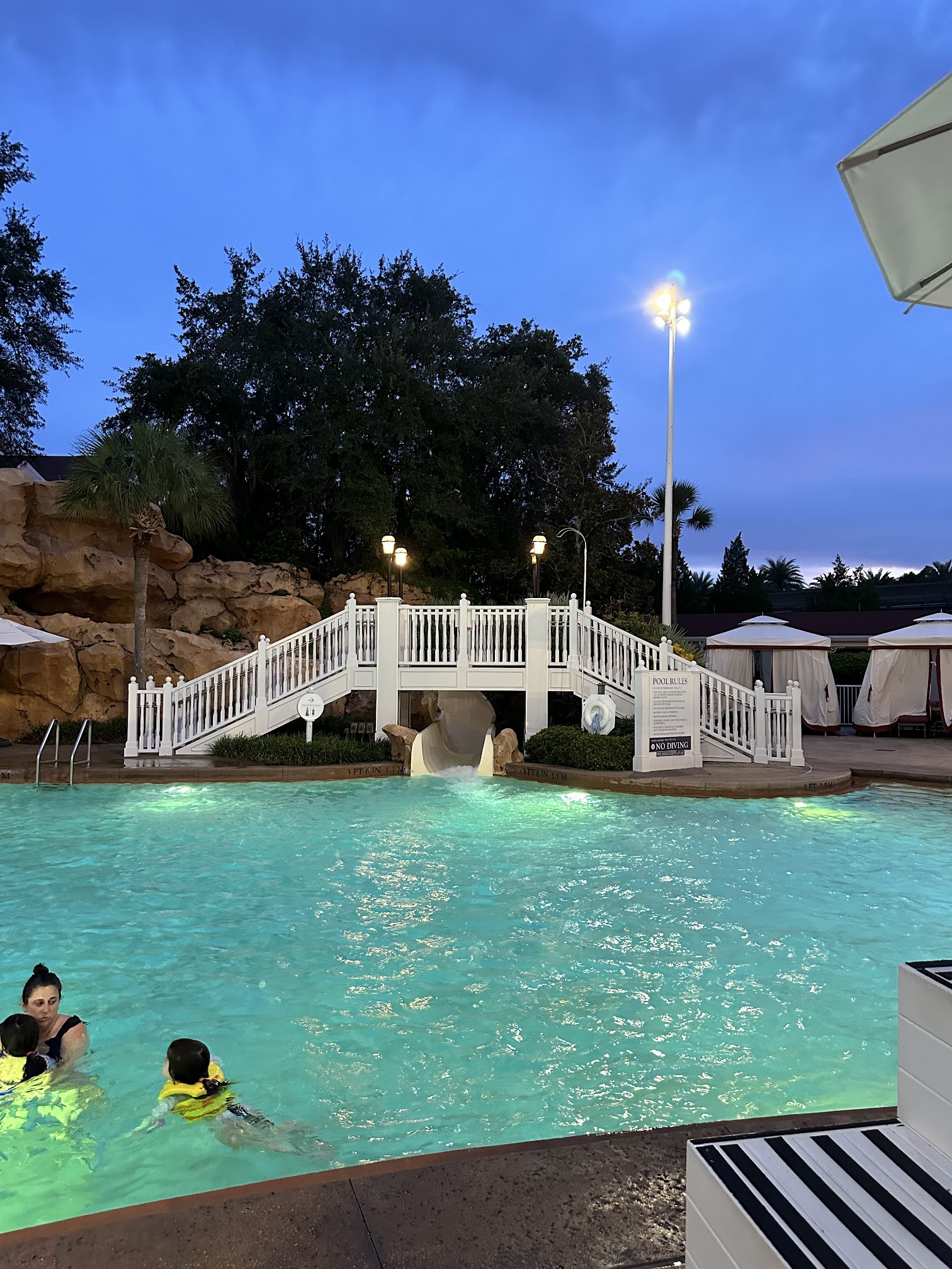 Our favorite pool! Our daughter is obsessed with the waterslide and the zero entry is perfect. When she was super little she adored the splash pad area. The Alice in Wonderland theme is so cute. I do think, however, they need to cool it with the Mad Hatter hat absolutely dousing the small kids. That water drop is aggressive! Saw more than one baby swept completely off their feet. Anyway, the staff do a great job keeping chairs clean so there’s always somewhere to sit. The pool deck is a a little small so there’s not very many chairs but I like that to be honest.