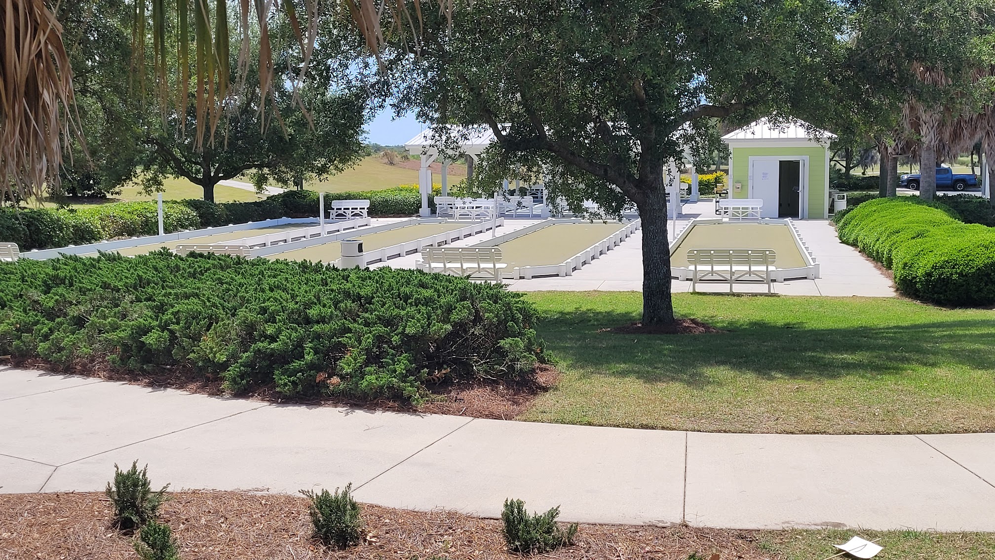 It's a very nice family-oriented Rec Center painting and pee green and white trim. Before entering into the pool area and there is a small covered seating area. There are multiple tables lawn chairs and chairs provided in the pool area. There is the usual 4 Shuffleboard courts with a covered seating area on both sides. As usual the Bocce courts aren't covered. There's a medium covered seating area that would easily accommodate a birthday party. One can easily venture over here after playing golf at next store Palmetto Executive Golf Course..