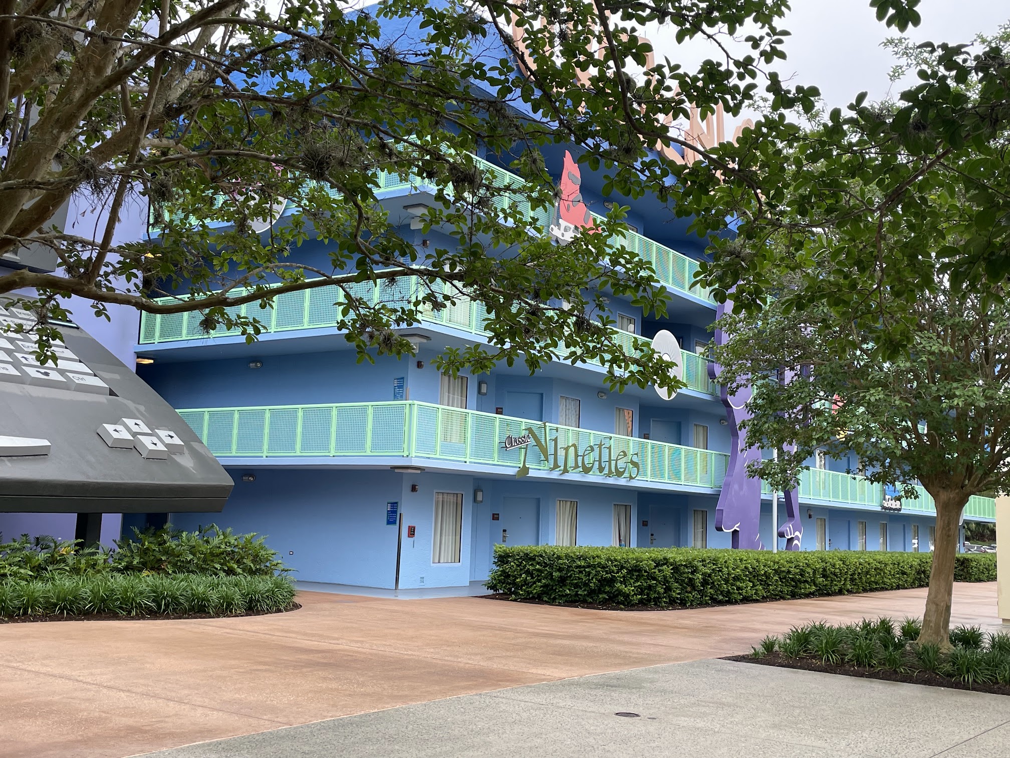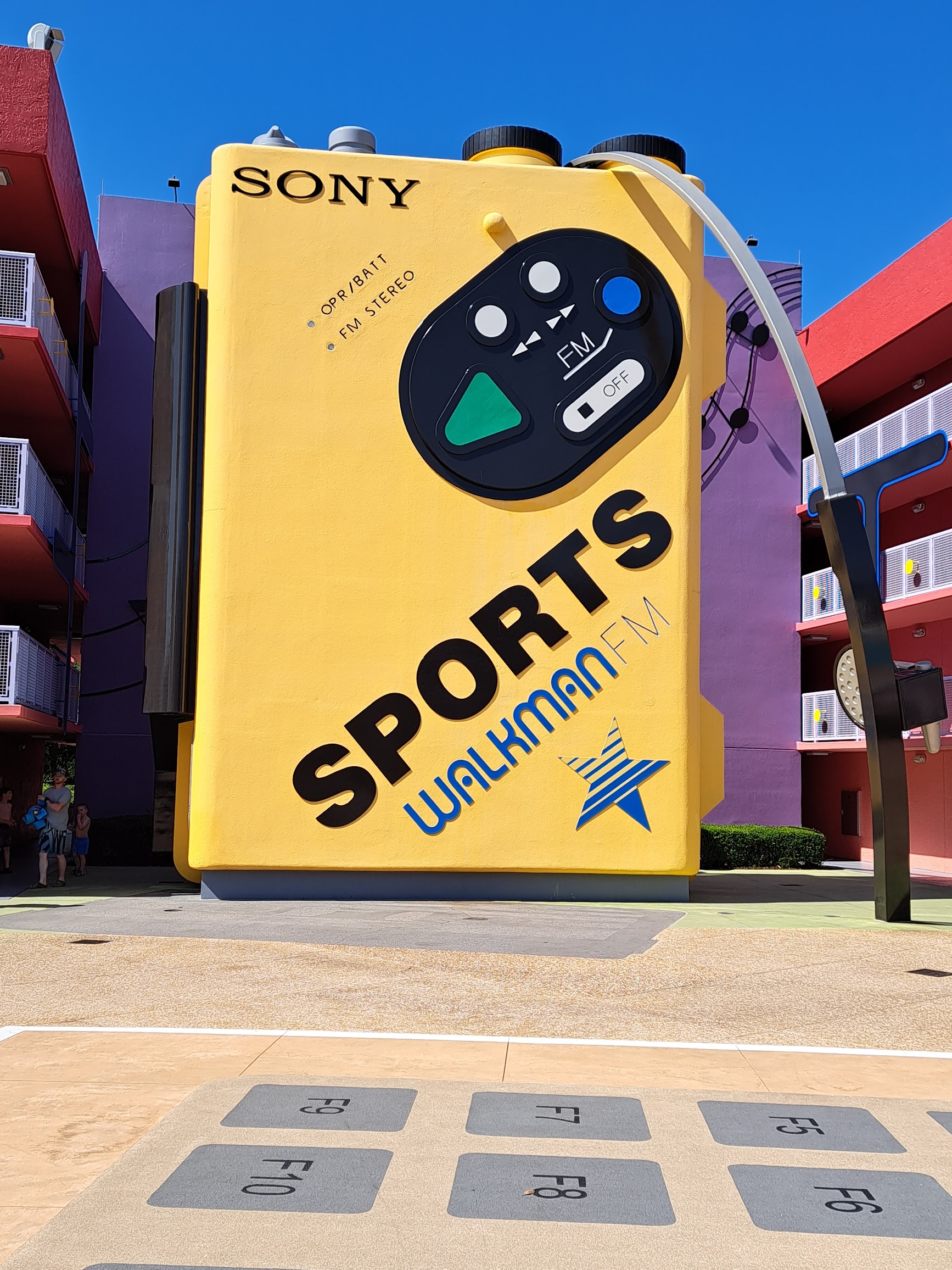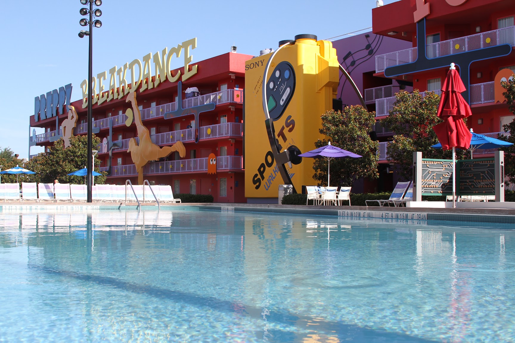Large swimming pool at Disney's Pop Century Resort with 80s tunes playing in the afternoon.