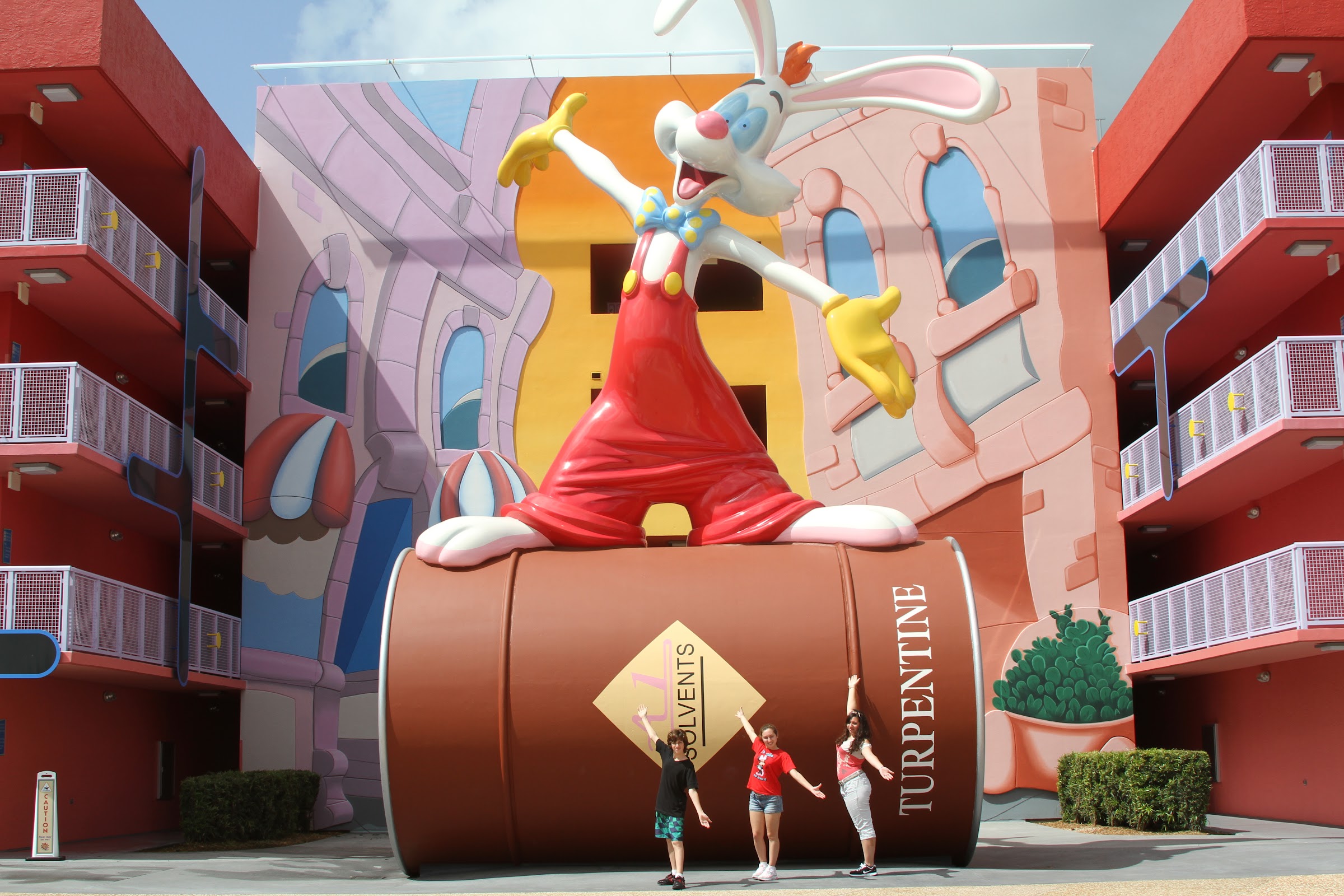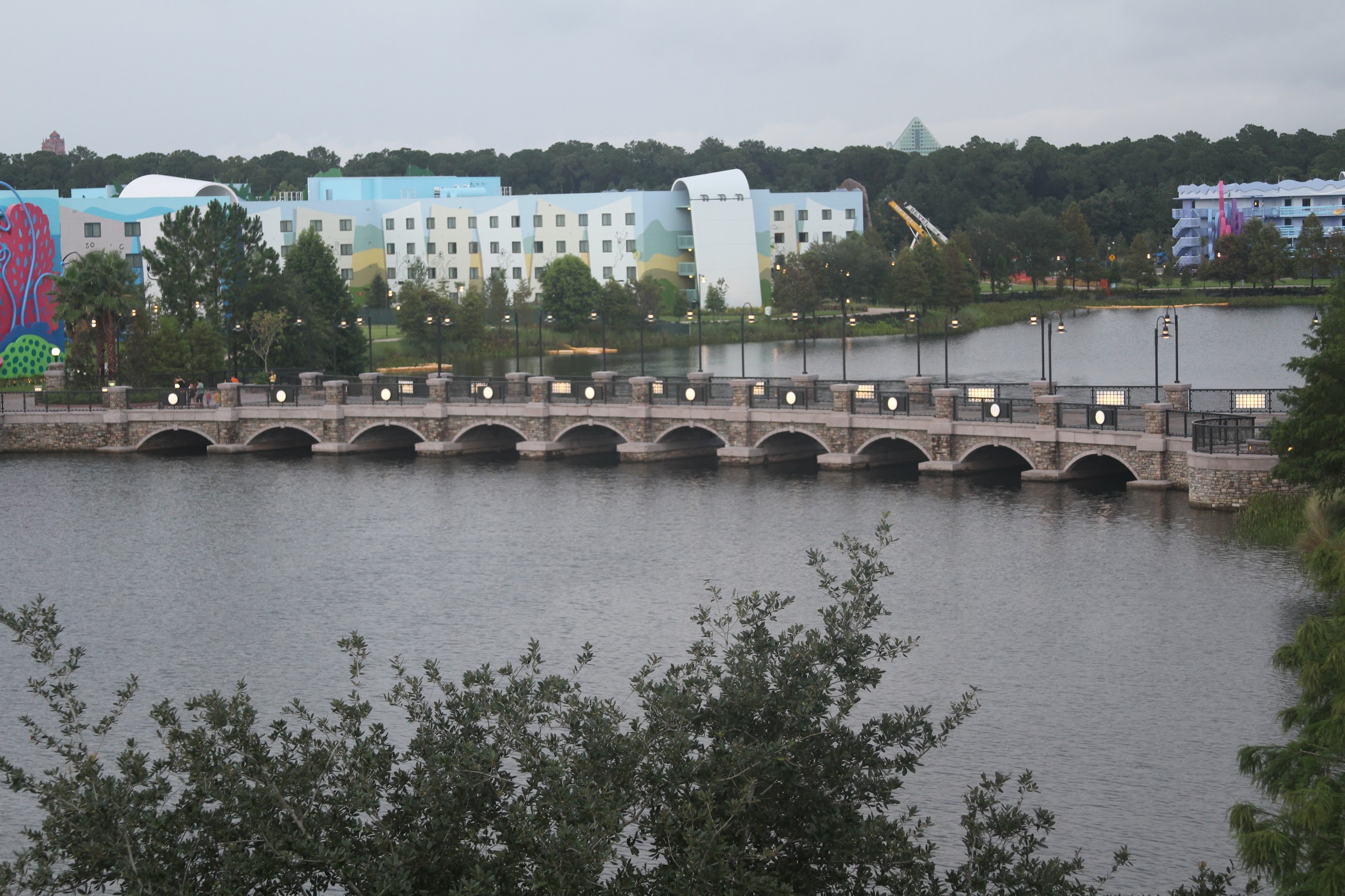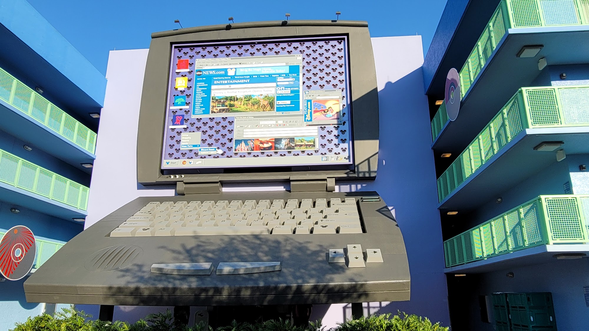 Large swimming pool at Disney's Pop Century Resort with 80s tunes playing in the afternoon.