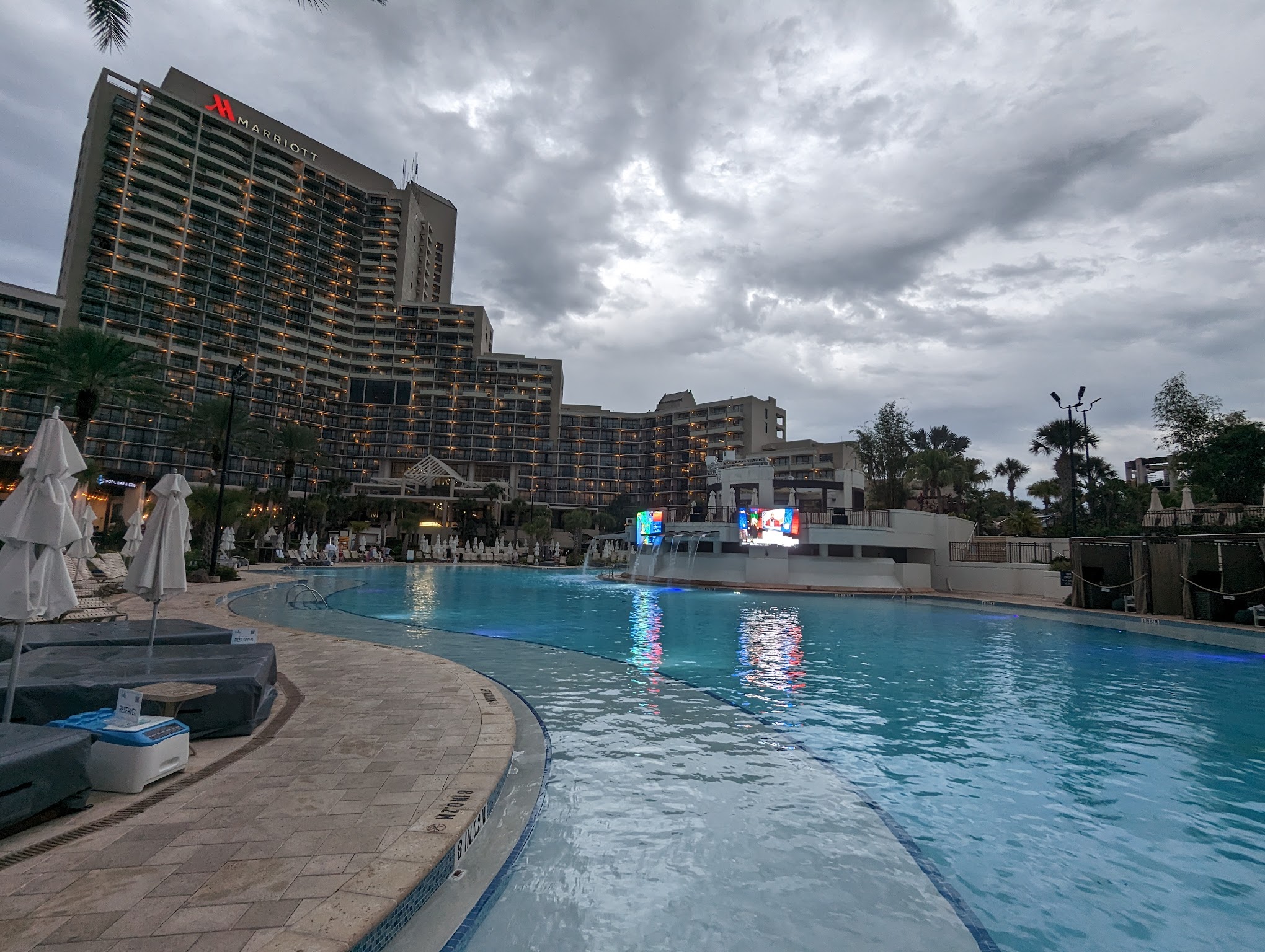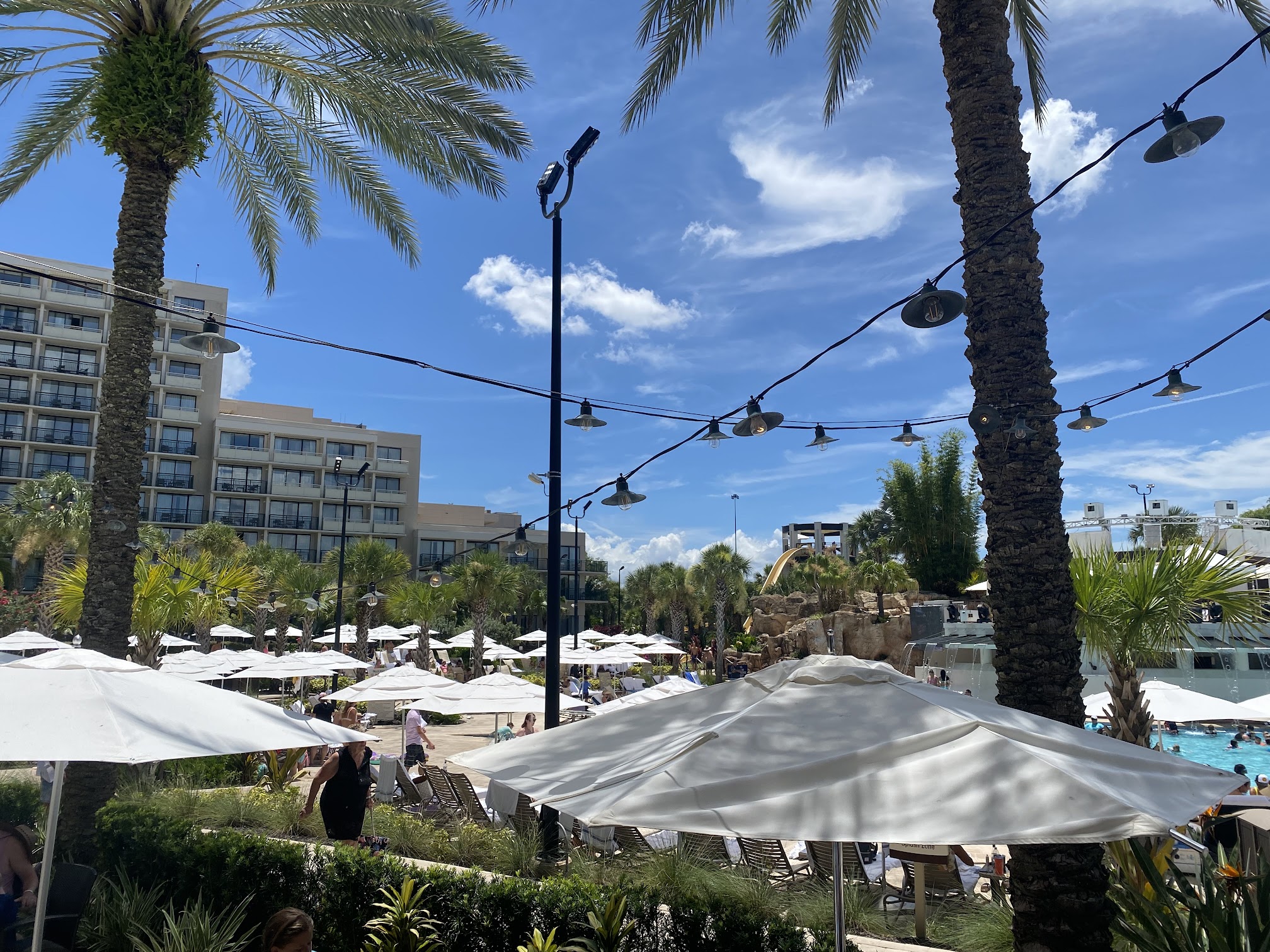 The pool is really awesome. Large area with walk in access, hot tubs and pool bar and grill. Music is often playing and TVs around the pool playing the game. The area is really busy on the weekends. The bar isn’t cheap but gives you some cool outside options with frozen drinks. The water park is not open to everyone so check to see if it’s extra. The pool area also has a lawn and some waterfalls. The lawn has area has giant board games and corn hole. Great area to let the kids have fun while you relax. You can also rent a cabana but they are expensive.