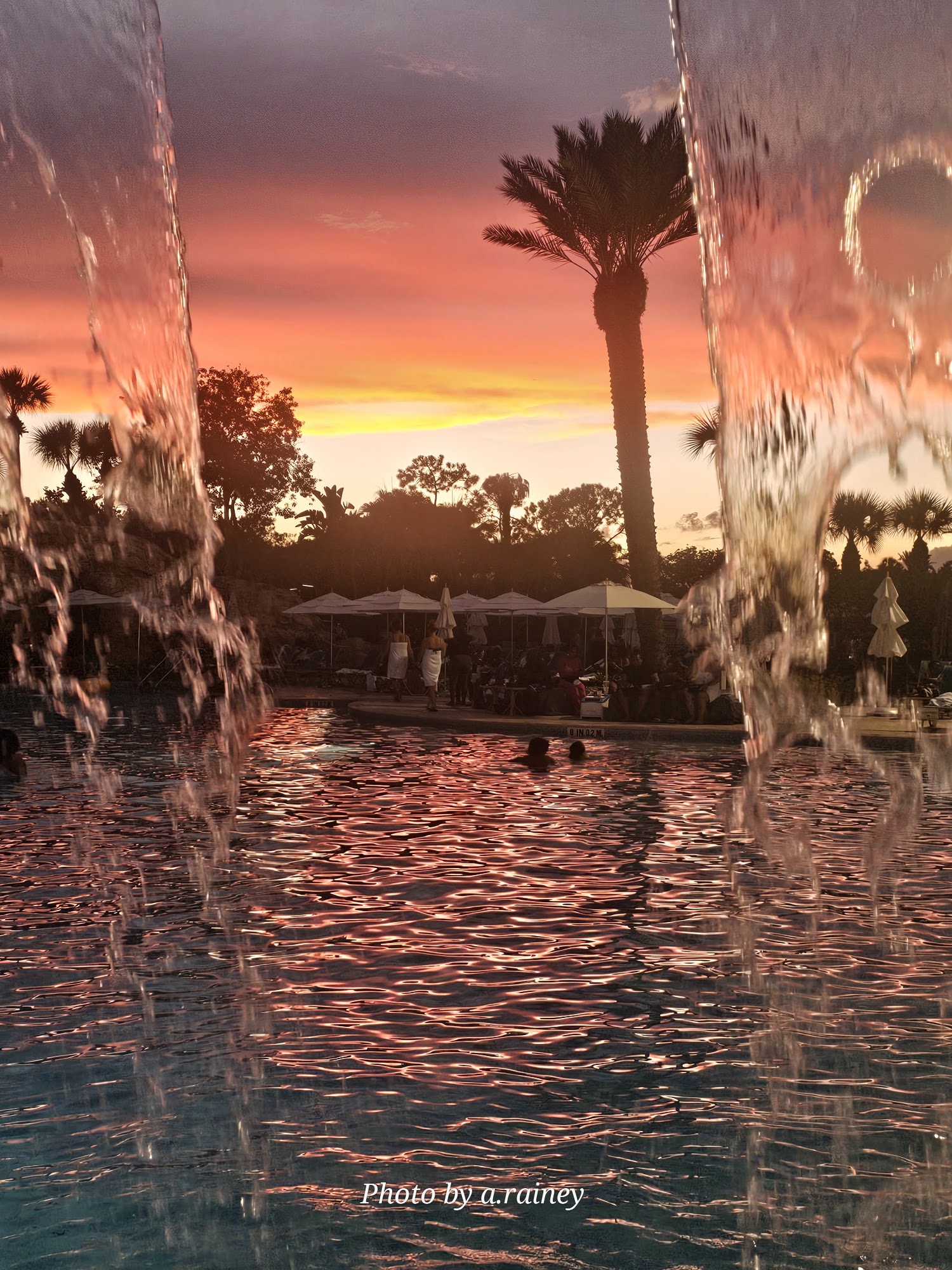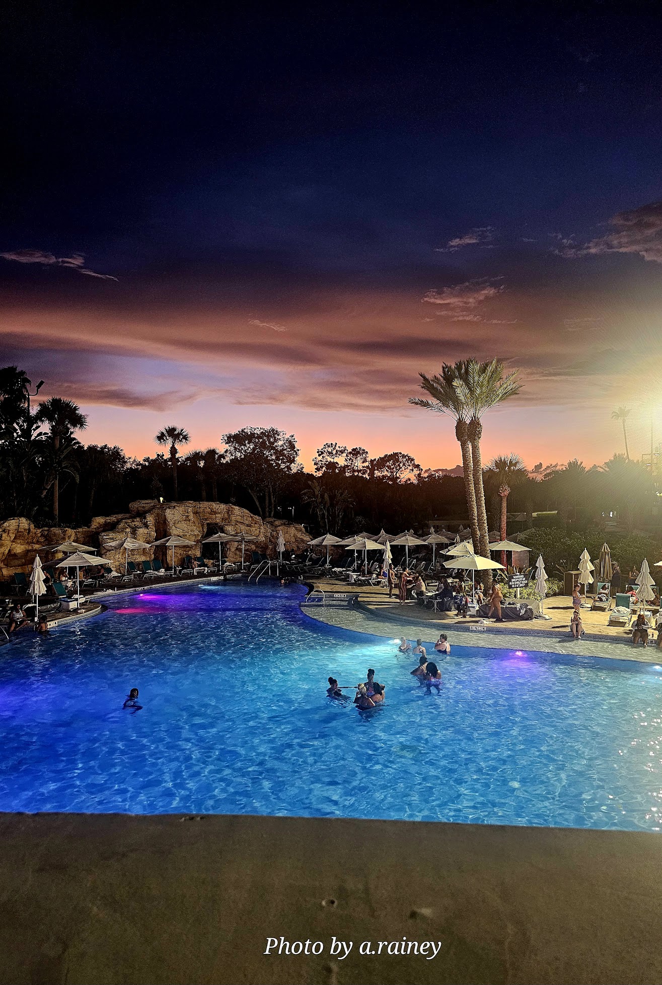 What are people saying (AI review summary)? The pool area is highly praised as awesome, large, heated, and beautiful, featuring walk-in access, hot tubs, a pool bar and grill, music, TVs, and waterfalls. It's described as a great place for both relaxation and parties, often busy on weekends. Amenities include three slides (two tube, one fast), cornhole, ping-pong, mini-golf, and giant board games on a lawn area suitable for kids. Cabanas are available for rent but are noted as expensive, with one review mentioning a $400 cost and suggesting service could improve. The pool bar offers tropical drinks, though drink strength can vary significantly between bartenders. The water park may require an extra charge. A night laser show is also a highlight.