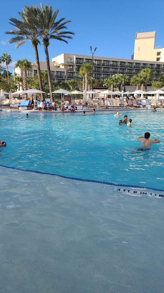 Falls Pool is a prominent recreational pool complex located at the Hilton Orlando Buena Vista Palace. This expansive, family-friendly area features a zero-entry lagoon pool, a thrilling 200-foot (4-story) waterslide, cascading waterfalls, and a dedicated kids' splash pad. Cabanas are also available for rent, making it a central amenity for hotel guests.