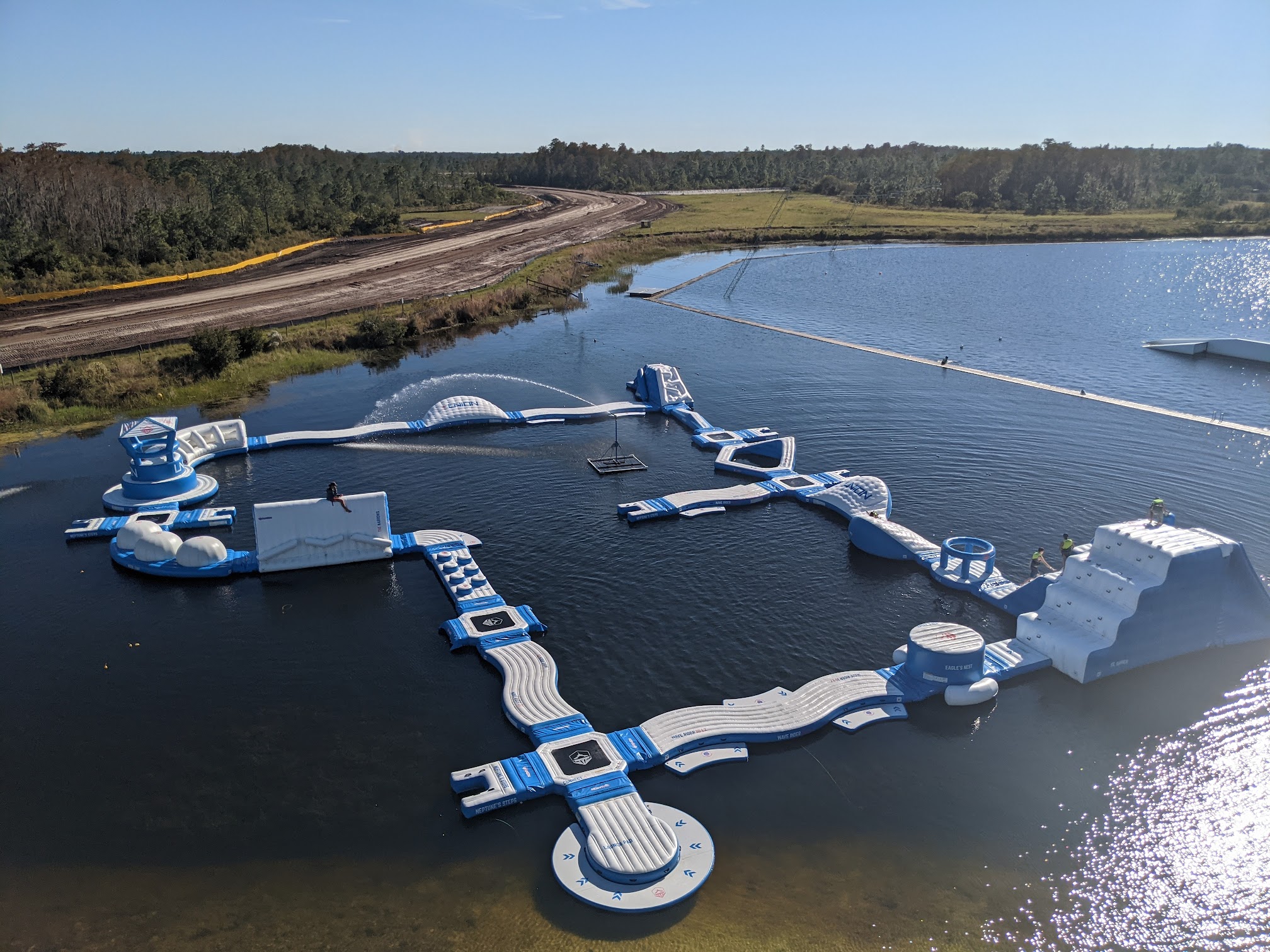 Family-friendly water park featuring inflatables, a climbing structure and wakeboarding.