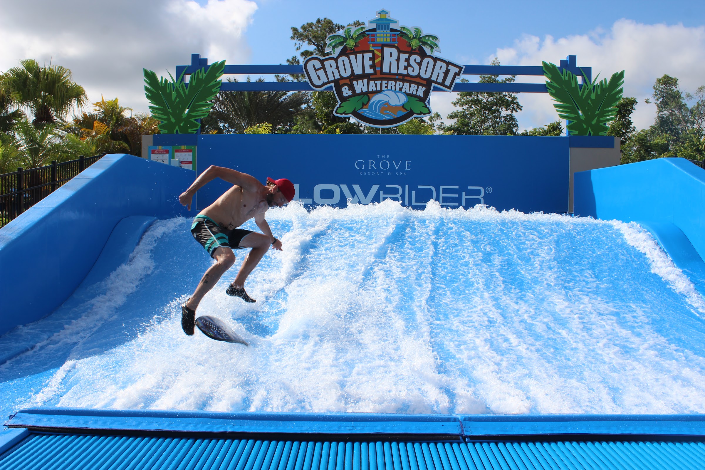 Water park at the Grove Resort offering a FlowRider surf simulator, slides, and a lazy river, plus a restaurant.